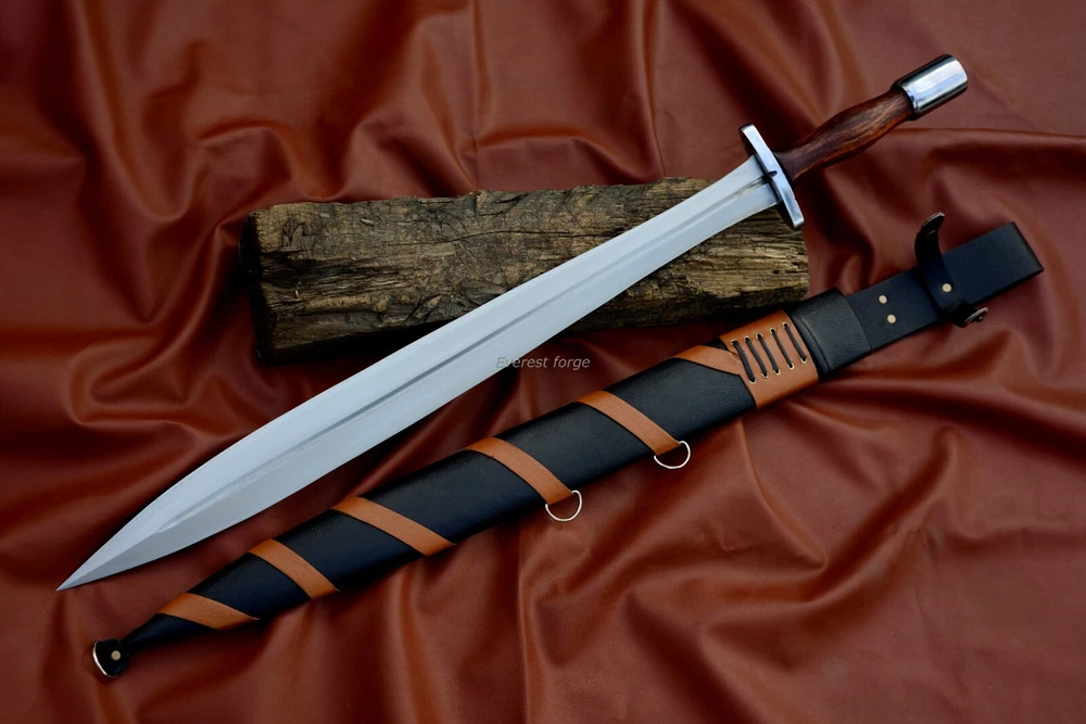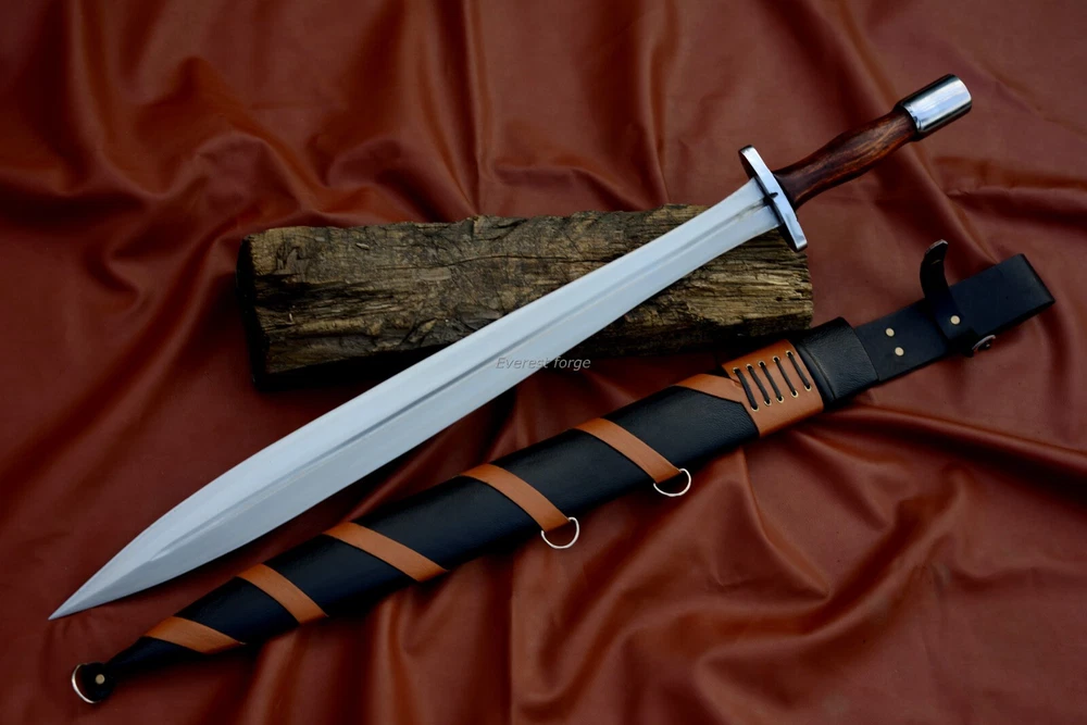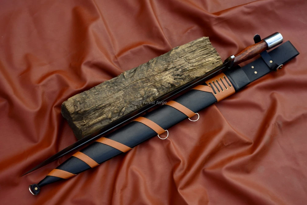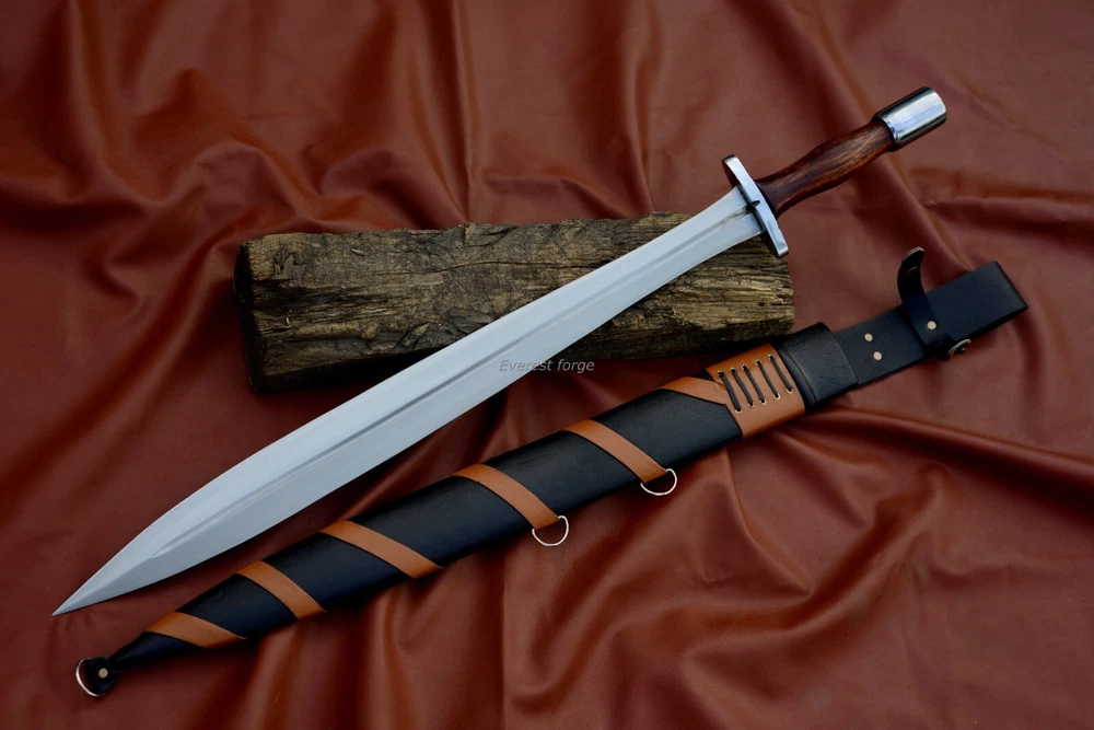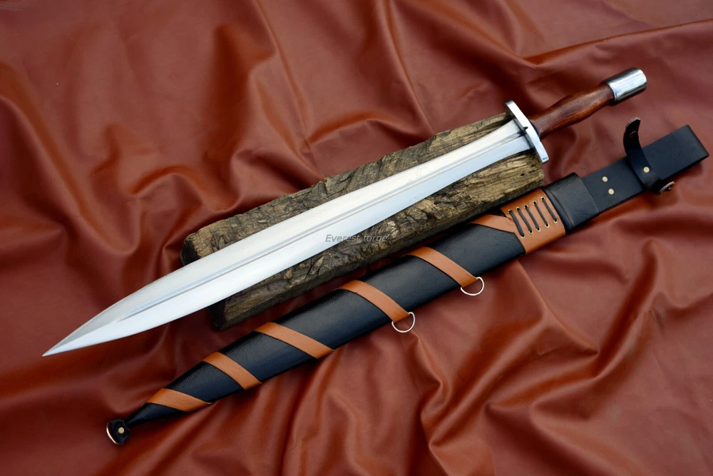 This Xiphos is replicated from historical designs; its blade exhibits notable distal taper which ensures that it is a swift and agile performer. The well-carved and contoured grip fits nicely into the palm. This Greek Xiphos has a leaf blade forged from high carbon steel; the hilt is steel with carved wood riveted to a thick tang to construct the grip. A Brass guard and pommel cap complete the hilt. -Hand forged in Nepal -5160 Leaf spring from Truck is used for Blade and Rosewood is used for Handle. -Sharpen- Ready to use. -24 inches Blade- Highly polished. -8 inches full tang Handle-Made of Rosewood-Perfect Gripe-2 hand handling -Scabbard is made of cotton wood cover in leather. -Comes with Warranty.