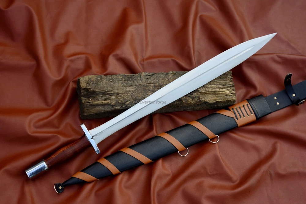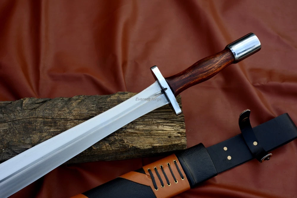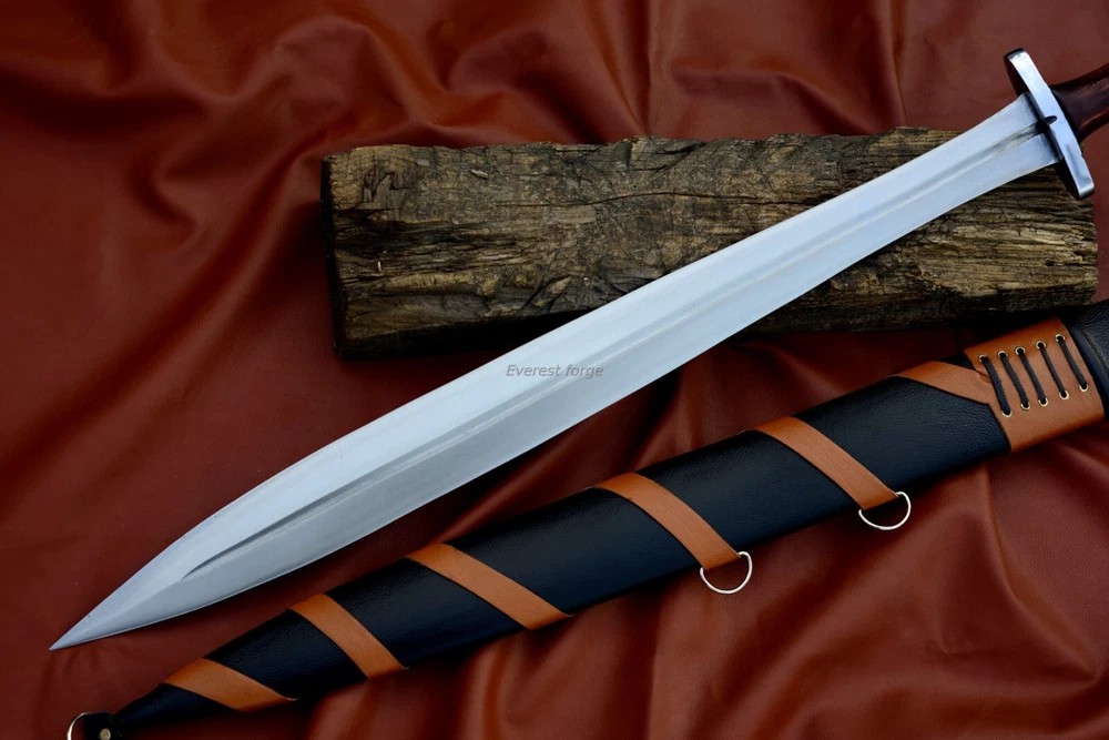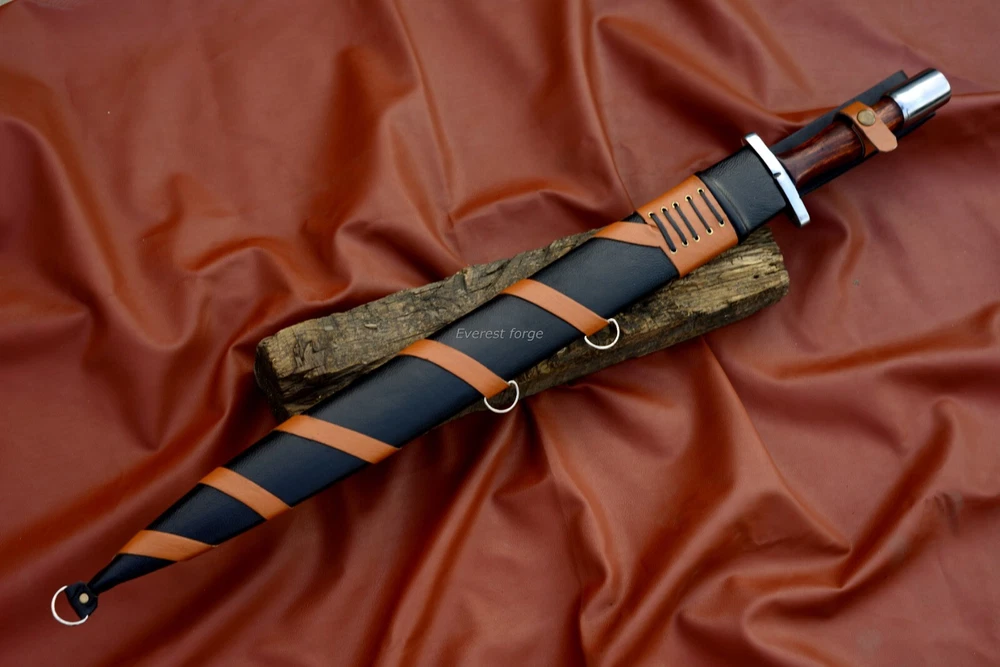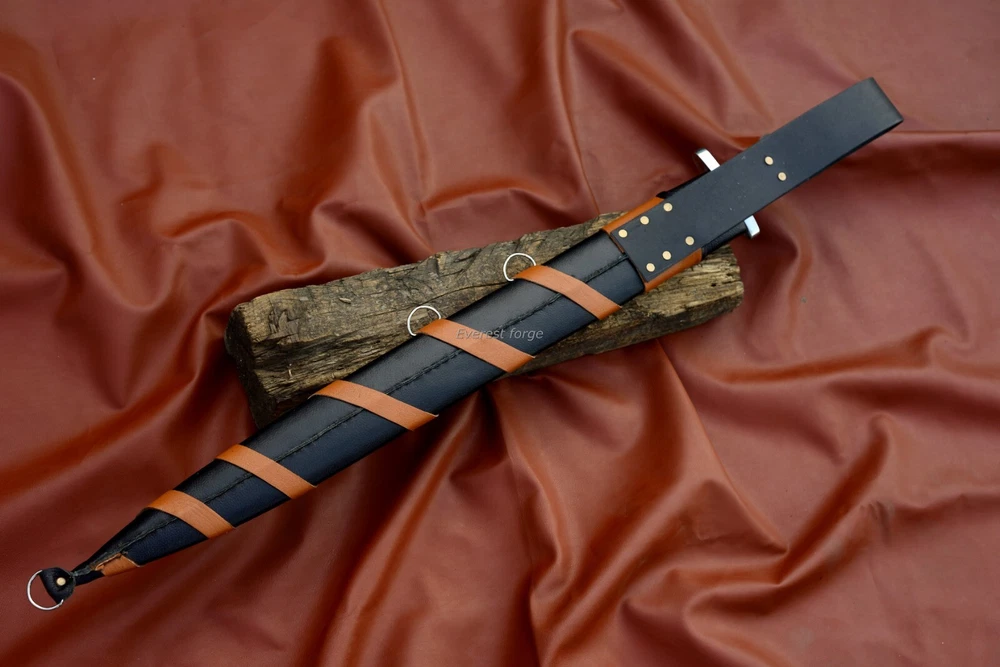 This Xiphos is replicated from historical designs; its blade exhibits notable distal taper which ensures that it is a swift and agile performer. The well-carved and contoured grip fits nicely into the palm. This Greek Xiphos has a leaf blade forged from high carbon steel; the hilt is steel with carved wood riveted to a thick tang to construct the grip. A Brass guard and pommel cap complete the hilt. -Hand forged in Nepal -5160 Leaf spring from Truck is used for Blade and Rosewood is used for Handle. -Sharpen- Ready to use. -24 inches Blade- Highly polished. -8 inches full tang Handle-Made of Rosewood-Perfect Gripe-2 hand handling -Scabbard is made of cotton wood cover in leather. -Comes with Warranty.