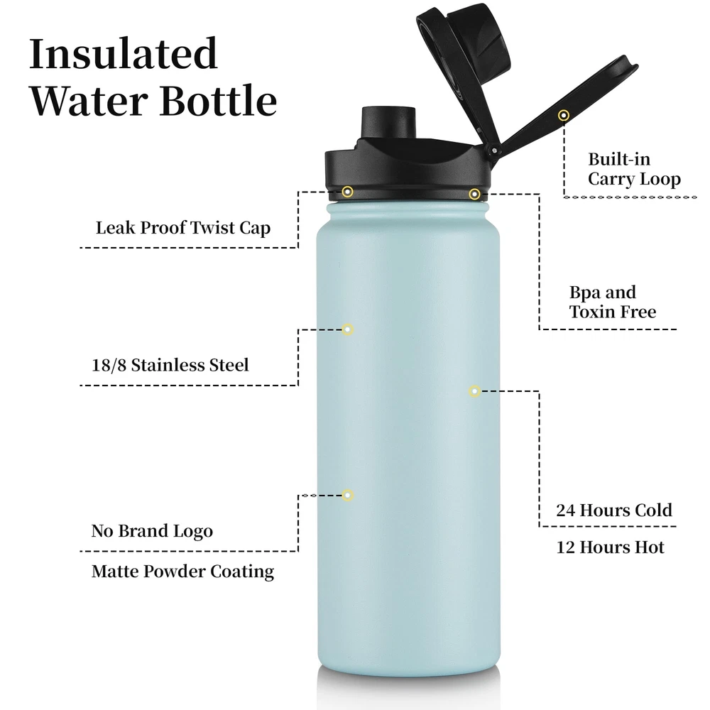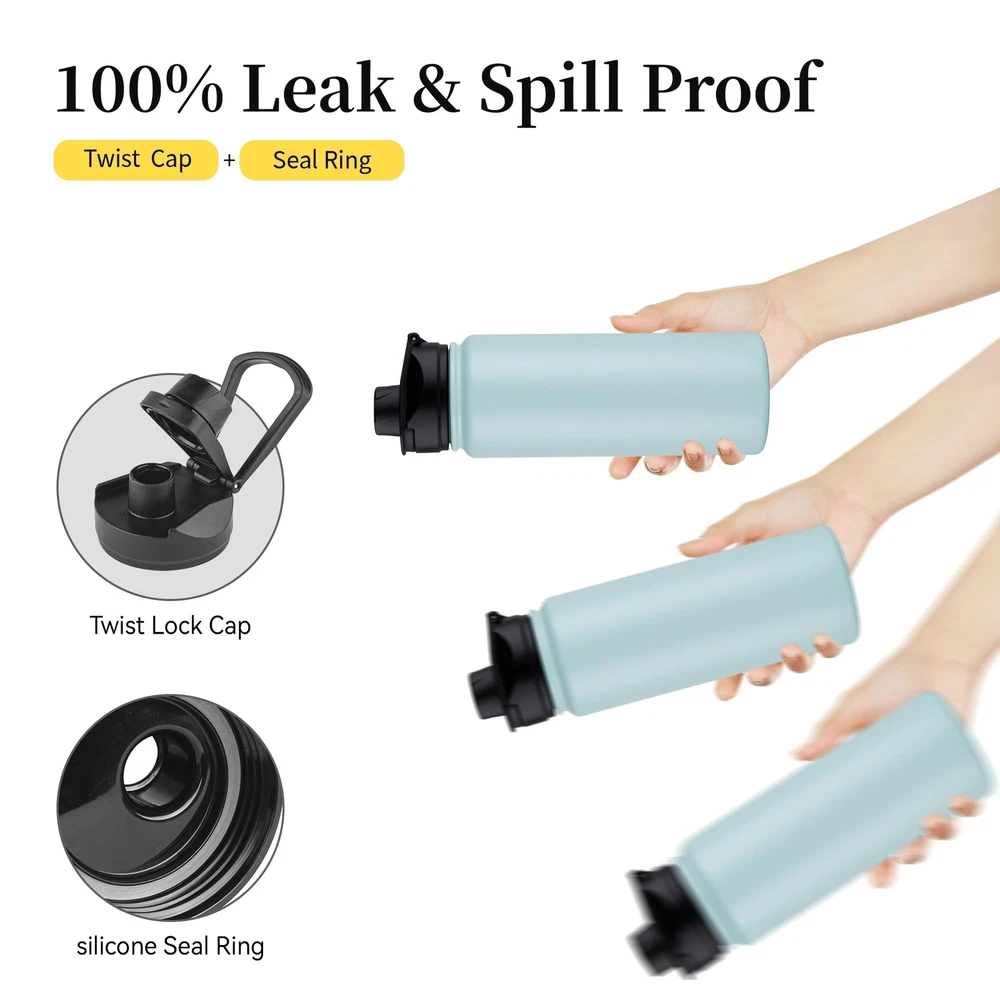 Vacuum Insulation: The double-wall and vacuum insulation technology, keep cold for up to 24 hours, and hot for up to 12 hours. You can enjoy your favorite hot and cold drinks for a long time 2 Lids: The stainless steel water bottles come with 2 leak proof handle lids (straw lid and wide mouth lid), safe and easy to carry Superior Material: is metal water bottle is made of high-quality 18/8 food-grade stainless steel. Durable and food-safe, could be used for a long period of time User-friendly Design: With powder-coat technology, your insulated water bottles are easy for gripping, cleaning and water-filling Widely Use: Suitable for outdoor sports, gym, running, camping, climbing, hiking and other activities. You can take it with you when you go to work, travel, do yoga, class, have a picnic.