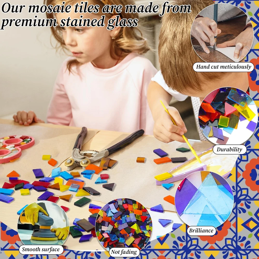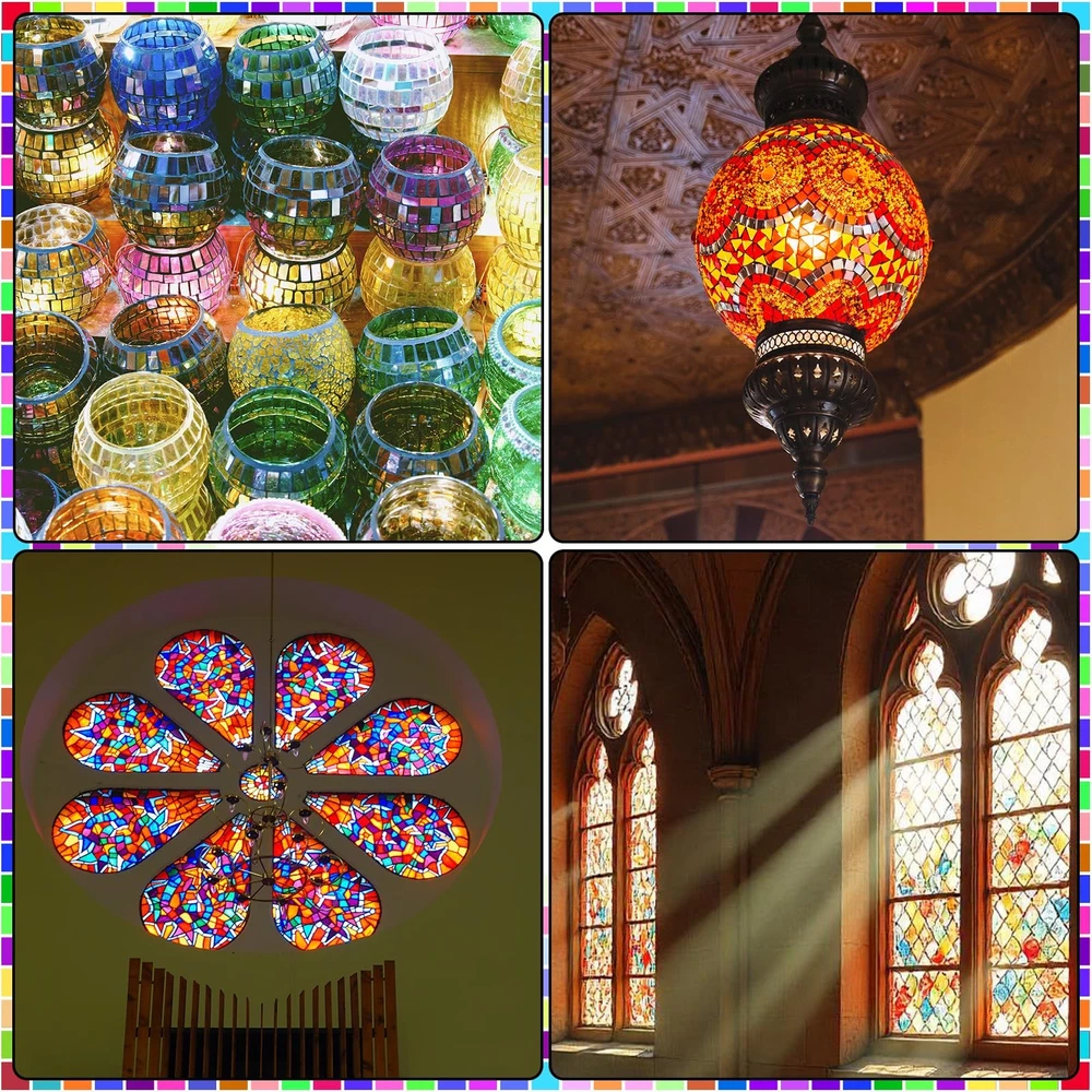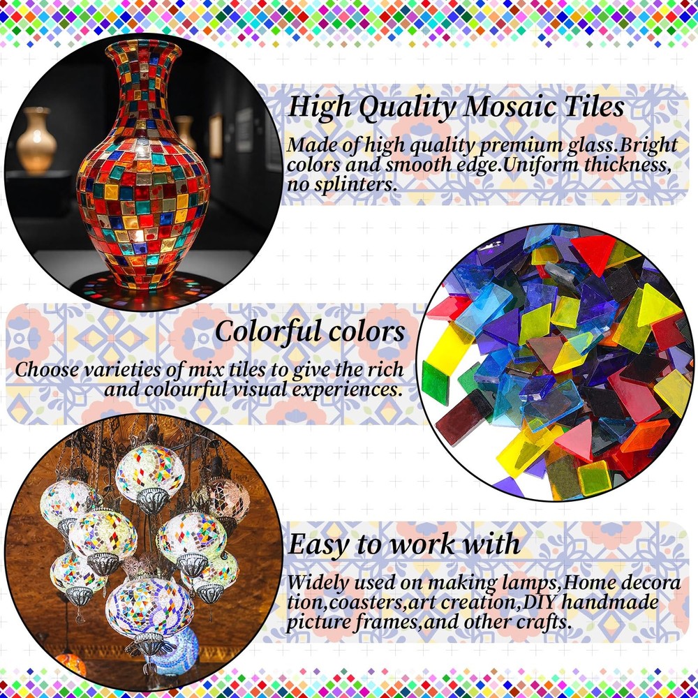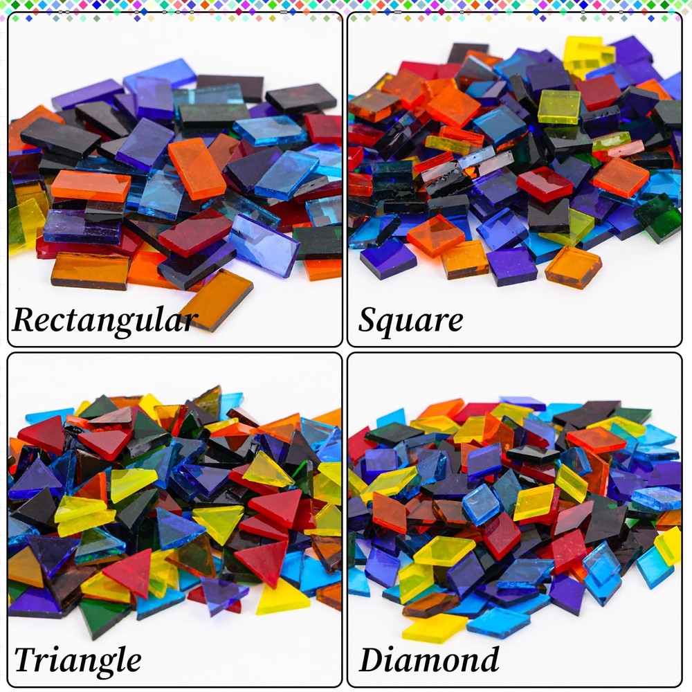 2400 Pcs Mosaic Tiles, Glass Mosaic Tiles for Crafts Bulk, Assorted Color Stained Mosaic Glass Pieces, Mosaic Supplies for Home Decoration, Art Crafts, DIY Projects, Transparent Mixed Shapes Glass Mosaic Tiles for Crafts Bulk: there are 4 kinds of mosaic tiles. Mosaic tiles square shape is 1 x 1 cm(approx.650 pieces), Rhombus shape is 1 x 2 cm(approx.600 pieces), Triangle shape is 1.5cm each side(approx.550 pieces), Rectangle shape is 1 x 2 cm(approx.600 pieces).Tile thickness 0.25cm. total approx. 2400 pieces of mosaic tiles. Nice assortment of colors, enough for multiple stained glass mosaic projects. Unique Color Shape: Each shape of mosaic tiles includes no less 25 colors, provide enough colors to you mosaic artwork. Mosaic tiles have bright colors and symmetrical shapes. Mosaic tiles for crafts are sorted by shapes, all shapes are bagged separately. Mosaic tiles can work well in your project, it is a wonderful choice to meet your various needs. Quality Mosaic Glass: These Glass mosaic tiles are cut from colored stained glass sheets that will last nearly forever, their rich colors never fading, will make your crafts last forever, these attractive glass mosaic tiles will be beautiful addition to floral arrangements, crafts, vases, candles, and so much more Wide Applicaton: Glass mosaic tiles can use to be stepping stones, ceramic work, class projects, artwork, backsplash, home decoration or other specific projects. You can enjoy the mosaic glass pieces with your friends and families to make unique gifts. you can inlaid mosaic glass on the decorating walls, handmade plates, photo frames, cups, flowerpots, and more DIY object.It is perfect for you to create different patterns as you need for craft project.First for beginners or mosaic artists to use outdoors and indoors DIY Supplies: Our Mosaic tiles are perfect for DIY projects. You can use your imagination and creativity to make every photo frame, plate, cup, mug, plant pot, etc. -of-a-kind. Enjoy the fun of creating mosaic patterns with family and friends during weekend leisure time,enhancing family and friendship