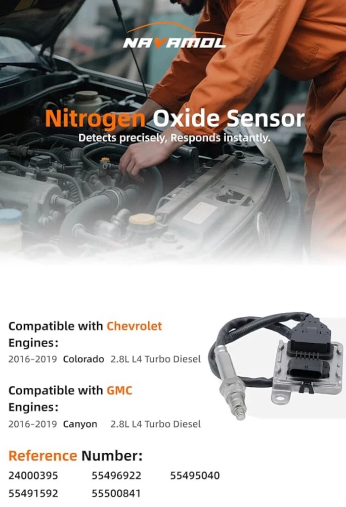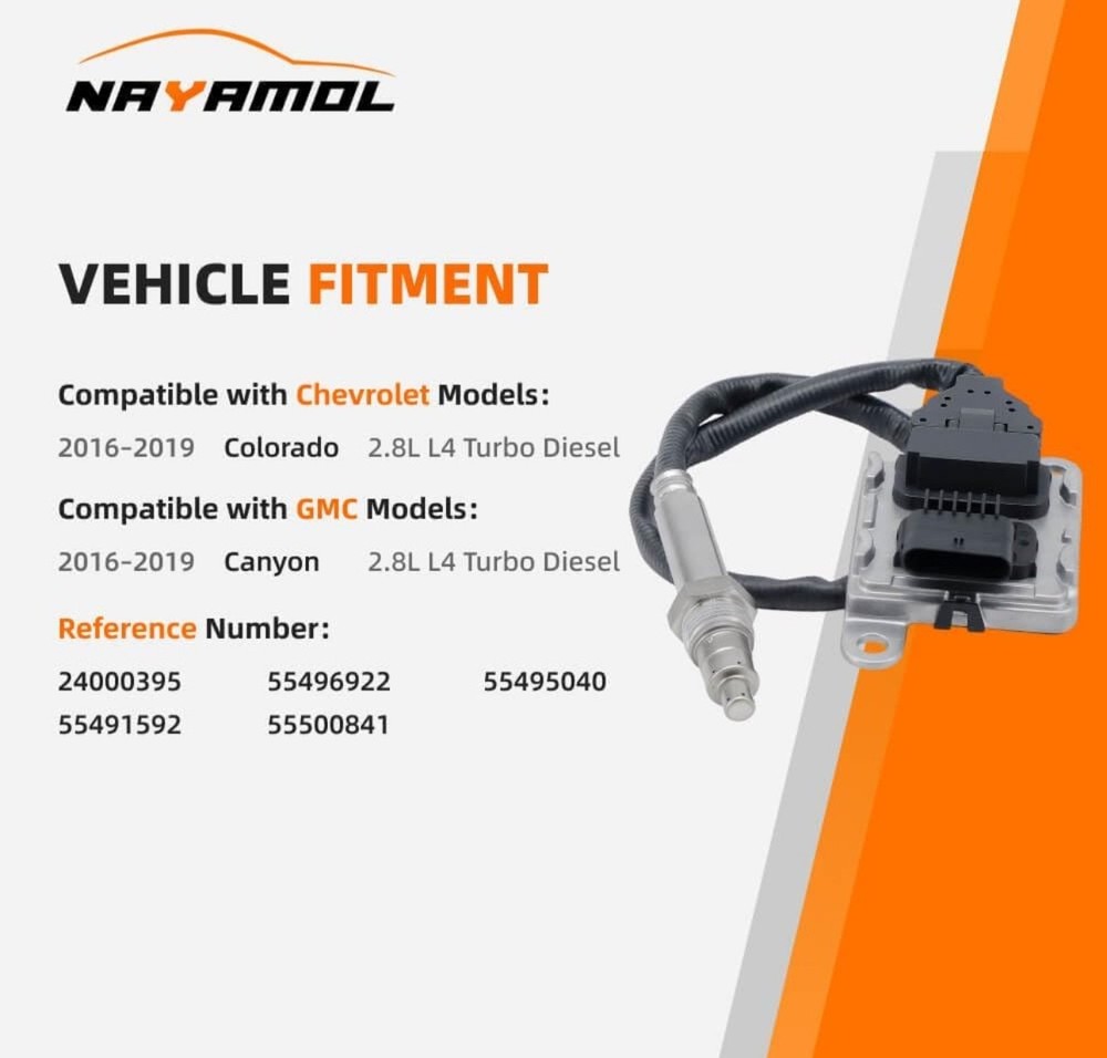 #2922 24000395 55495040 Nitrogen Oxide NOx Sensor Compatible with Chevrolet Colorado & GMC Canyon 2.8L Diesel 2016-2019 Replace# 55496922,55491592 Brand NAYAMOL Item Weight 9.12 ounces Manufacturer NAYAMOL 【Reference Number】:24000395 55496922 55495040 55491592 【Vehicle Fitment】:Compatible with 2016-2019 Chevrolet Colorado 2.8L L4 Turbo Diesel, 2016-2019 GMC Canyon 2.8L L4 Turbo Diesel 【Precision Built】:Crafted with superior materials and cutting-edge technology, our sensors are meticulously designed to deliver dependable performance. Each unit is rigorously tested to ensure consistent functionality and optimal engine operation. Easy to install, our sensors are engineered for a seamless fit 【Easy Installation】:This NOx sensor is designed for quick and hassle-free replacement. It installs in minutes without the need for programming or special tools. Simply remove the old sensor and connect the new one to get your vehicle back on the road swiftly 【Note】:All products are quality-tested before shipping.Review product images and part numbers carefully to confirm compatibility.For accurate fit, please provide your engine data plate, serial number, and part number if unsure.If you encounter any issues, our dedicated support team is here to assist. Choose NAYAMOL for a purchase backed by our commitment to quality What's in the box Nitrogen Oxide Sensor