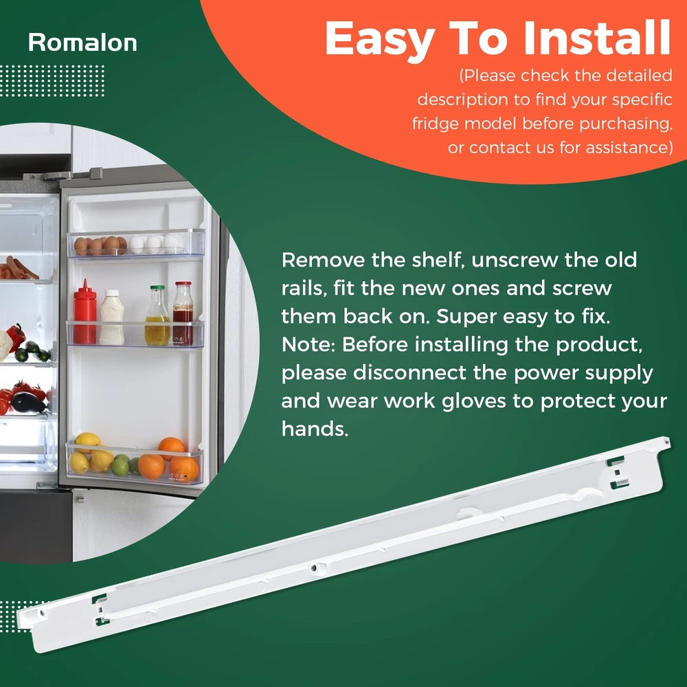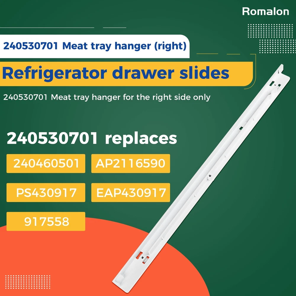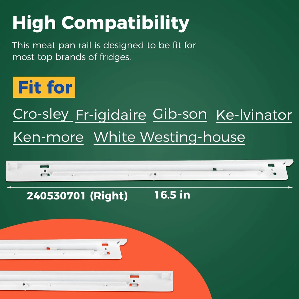 240530701 Right Pan Hanger make sure that everything in your refrigerator is safe and in place. Replaceable Part Number:AP2116590, PS430917, EAP430917, 917558, 240460501 High Quality: The part is made from durable high-quality material and well-tested by the manufacturer. Non original aftermarket part, fits OEM standards. Fix the following Issues: Broken tray rail Sliding pan fall out of its place Exact fitable Models for Your Reference: For Frigidaire:FFHI1817LB0, FFHI1817LS0, FFHI1817LW0, FFHI2117LB0 For Kenmore: 253.60525300, 253.63012300, 253.63014300, 253.60723300 For Crosley: CRTE183AQ0, CRTE183AW0, CRTE183IAW0, CRTE183IAW2 For White-Westinghouse:WRT18G4AQ0, WRT18G4AW0, WRT18MP5AQJ, WRT18MP5AW2 Ensure Proper Fit Tips: Make sure you put in the correct model number. For the Kenmore products, you need to know the model number plus the year as they are often listed with the year as part of the number on this site. It was super easy to fix. Remove the shelf, unscrew the old rails, put on the new rails, and screw them in. NOTE: The mention of brand names and any related model designation above is only for purposes of demonstrating compatibility. Replaceable Model: 240530701 Meat tray hanger for the right side only. 240530701 replaces 240460501, AP2116590, PS430917, EAP430917, 917558. Please check the size of your fridge pan rack before purchasing High Compatibility: This meat pan rail is designed to be fit for most top brands of fridges. It is fit for Cro-sley Frigi-daire Gi-bson Ke-lvinator Ken-more White Wes-tinghouse Superior Quality: 240530701 Fridge drawer slide bracket is made of high density durable plastic. It has a stronger resistance to wear and tear than the average product, making it more durable while ensuring a long product life. Choosing our durable fridge hangers will reduce frequent replacements and save you money Easy To Install: Remove the shelf, unscrew the old rails, fit the new ones and screw them back on. Super easy to fix. Note: Before installing the product, please disconnect the power supply and wear work gloves to protect your hands About Us: Our company attaches great importance to the shopping experience of each customer.Customer satisfaction is our pursuit