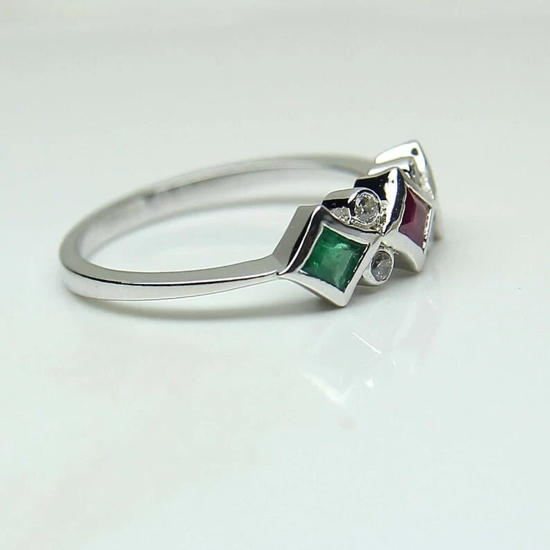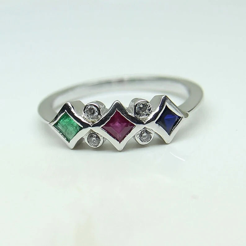 This stunning ring features a 2.40Ct princess cut simulated sapphire set in a unique band plated with 14k white gold. The round shape of the main stone with a blue color and eye-clean clarity grade is surrounded by three gemstones including simulated diamonds, emeralds, and rubies. The ring is made of sterling silver with a bezel setting style and adjustable band width of 5mm. Perfect for any occasion such as engagements, weddings, anniversaries, birthdays, Valentine's Day, Mother's Day, and Christmas, this ring is a true representation of beauty, nature, and art. It is also nickel-free and can be personalized as per the buyer's requirement. This handmade ring with a unique design is a must-have for anyone who loves cartoon, TV, and movie characters, animals and insects, and Western and beach themes.