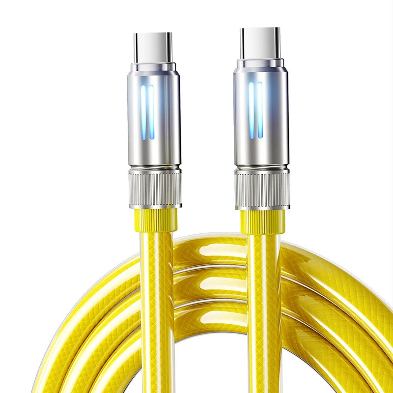 Description: 240W fast charging is universal High power to low power 240/140100/60/30W device data cable is fully compatible Multi-protocol full device support can be switched between mobile phones, tablets and other devices 240W fast charging PD full series compatible Support iPhone7-iPhone15 Samsung and other mobile phones compatible Colorful atmosphere lights make night charging more convenient With soft colorful atmosphere lights, you can clearly find your phone when charging at night Zinc alloy material anti-oxidation process Plug and unplug at will, intact as new, full of texture Bend at will, long-term use without breaking After 20000+ Bending test, wear-resistant and non-breakage, longer service life Thickened gold-plated copper wire, faster and more stable charging Increased conductive area, reduced resistance, smoother charging and transmission, more stable and faster Product name: liquid silicone data cable Interface: Type-C/USB-A/8pin Function: charging + data transmission Material: zinc alloy + liquid silicone Transmission speed: 480Mbp/s Current: 2.4A/5A Length: 1.5m Color: yellow Applicable models: Applicable to Apple/Android/Type-C interface devices Includes: 1 1.5m 240w liquid silicone data cable