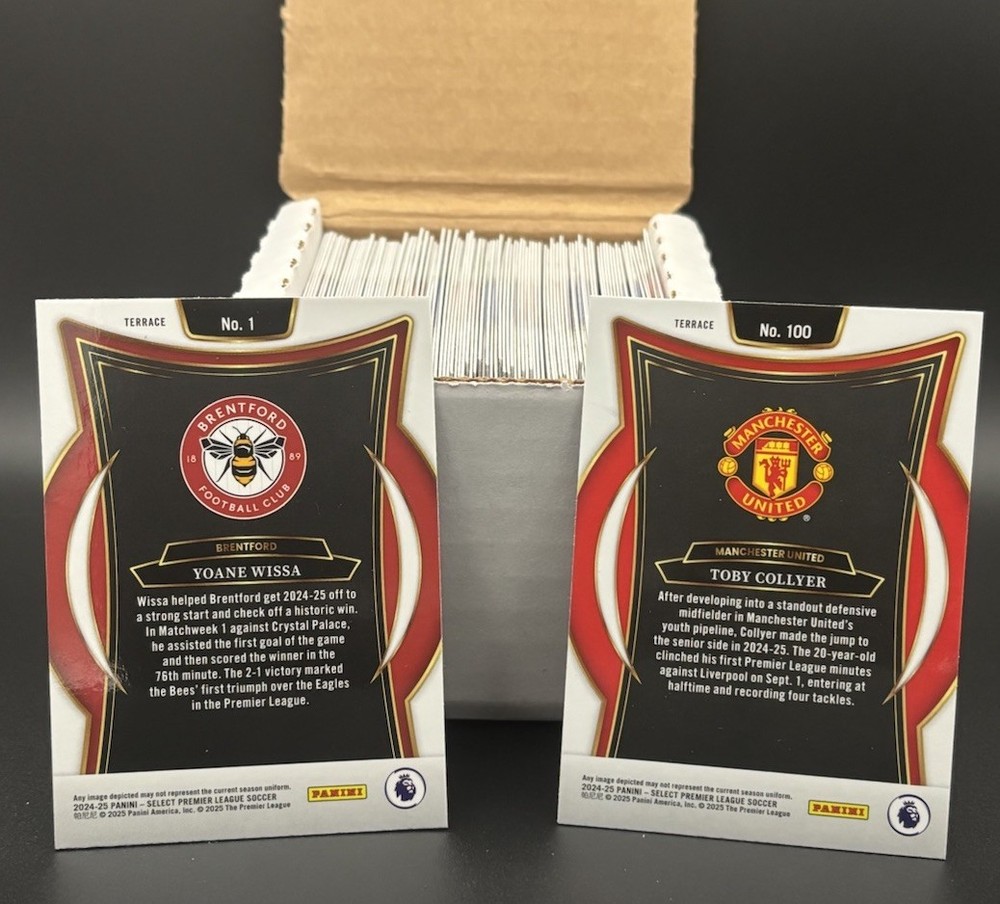 The product is a set of 100 standard-sized trading cards from the 24-25 Panini Select Premier League Base Set, featuring players from the Premier League. These cards are made of card stock and are part of the Terrace set. They are not autographed and are manufactured by Panini. The cards are in English and are ideal for soccer fans looking to collect sports trading cards. This base set is a must-have for fans of the Premier League looking to add to their collection for the 2024 season.