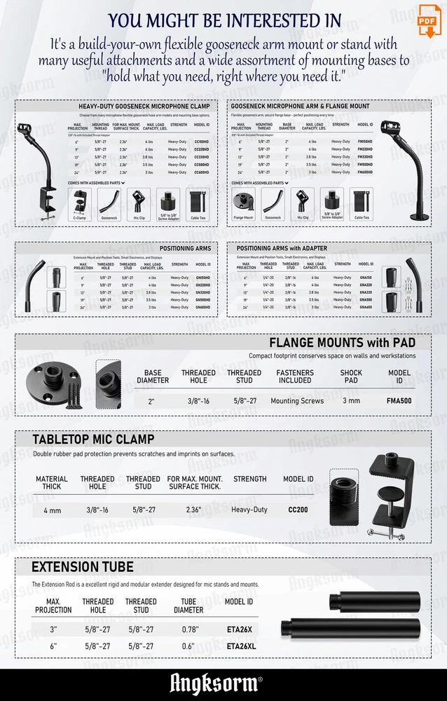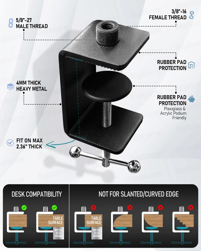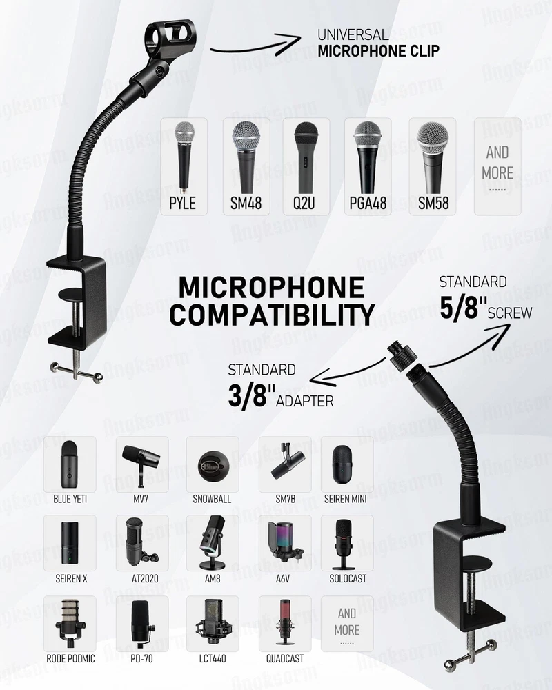 DESIGNED FOR EVERY USER - Our gooseneck desktop mic stand is a versatile companion suitable for various usage scenarios. Whether you're podcasting, recording music, delivering speeches, conducting meetings, or teaching lectures, this stand has got you covered. It adapts seamlessly to different environments, making it ideal for podcasters, musicians, educators, content creators, and professionals seeking exceptional audio performance. THE REINFORCED HEAVY-DUTY GOOSENECK has a thick of 0.6 inches and is available in multiple lengths: 6, 9, 13, 19, and 24 inches. Both ends feature standard 5/8-27 male and female threads. Made of high-quality carbon steel wire, it boasts excellent durability, high strength, good shaping performance, can be bent at will, does not rebound, and is noiseless. The matte black surface, achieved through a baking paint process, is corrosion-resistant, rust-proof, and aesthetically pleasing. MAXIMUM EQUIPMENT SUPPORT AND ADAPTER INCLUSION - With a maximum weight capacity of 3 pounds, our gooseneck stand can securely hold various microphone setups. We also include a 5/8-27" to 3/8-16" screw adapter, allowing compatibility with microphones featuring different screw hole sizes. This ensures that you can use a wide range of microphones with our stand, enhancing its versatility and convenience. DOUBLE RUBBER PAD PROTECTION - These fantastic and extremely low-profile flat-surface clamps are perfect for attaching to podiums, tables, desks, and piano bars. They fit surfaces up to 60 mm (2.36 inches) thick. The brace and screw-in mount are both padded to prevent scratches or imprints on the desk material. They effectively cancel out sharp noises and reduce vibrations. (This c-bracket is especially friendly to plexiglass and acrylic lecterns, and will not be subject to any scratches.) COMPREHENSIVE PACKAGE AND CABLE MANAGEMENT - When you purchase our gooseneck mic stand, you'll receive a complete package that includes everything you need. The package consists of a 24-inch gooseneck microphone arm stand with a desk clamp, a 5/8" to 3/8" screw adapter, a microphone clip holder, and 10 cable ties. The cable ties assist in effective cable management, keeping your setup neat and organized for optimal performance.