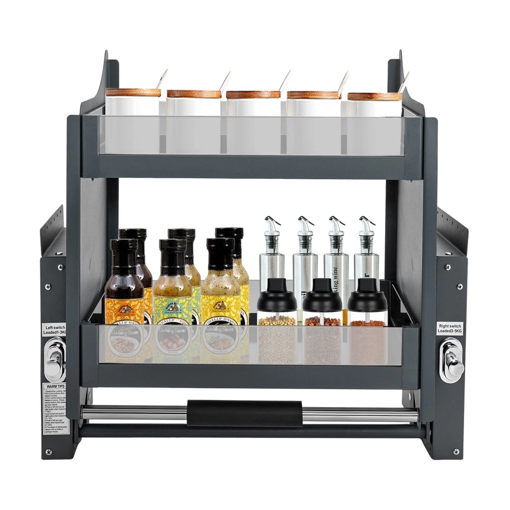 Specifications Model: 600Frame Color: Black Style: Modern, Pull-out Shape: Rectangular Room Type: Kitchen Shelf Type: Sliding Shelf Age Range: Adult Mounting Type: Wall Mount Material: Tempered Glass, Aluminum Alloy, Steel Process: Cutting, Nano Coating, Plastic Spraying Special Feature: Damping Hydraulic Rod Applicable Cabinet: Width: 60cm/24inch; Depth: ≥27cm/10.6inch; Height: ≥56cm/22.04inch; Load-bearing Capacity: ≥20kg/44 lbs Three-gear Adjustment: 1-5kg/2.2-11.02 lbs, 5-7kg/11.02-15.4 lbs, 6-12kg/13.22-26.4 lbs Max. Load-bearing Capacity: 12kg/26.4 lbs Right Switch Loaded: 3-5kg/ 6.6-11.02 lbs Left Switch Loaded: 1-3kg/2.2-6.6 lbs Minimum Distance from Cabinet: 5.5cm/2.16inch Double-lever Lever Thickness: 5.5cm/2.16inch 2-Tire 24" Pull Down Shelf Upper Kitchen Wall Cabinet Storage Organizer Cabinet Description Installing a 2-tier pull-down shelf in your cabinet can effectively make full use of your upper cabinets and keep your kitchen tidy, bringing a comfortable cooking environment to you. Our shelf, adopting an advanced pneumatic damper system with a sturdy structure, is a space saver, stylish decor, and a good helper that helps you to get items to higher places with less effort. Key Features Build to Last: This pull-down cabinet shelf mainly adopts tempered glass and aluminum alloy with cutting and nano-coating processes, making it anti-rust , crush-resistant , and high-strength. Smooth Pulling: Advanced pneumatic damper system with strong tension spring ensures easy pull-down and stable push-back even for teenagers and elderly people. You can press the adjusting button inwards and lock/unlock it clockwise/counterclockwise to strengthen/reset the pull-down resistance , thus balancing resistance to prevent falling too fast. Adjustable Bearing: The three-gear assistance adjustment(2.2-11.02 lbs, 11.02-15.4 lbs,13.22-26.4 lbs) through the adjusting button on the right and left sides can meet your different storage needs. Considerate Design: The 1.96" thick wall brackets are thick enough to elude face-frame stile and most types of hinges. Its pull-down design also makes this shelf support suspended installation, sliding doors, upward sliding doors, and double doors. Space-saving: The 2-tier design with each layer 22.2*10.63 inches in size is conducive to making full use of your upper cabinets, offering more space for your kitchen, and avoiding space waste. Sturdy Construction : The 2.16" thickened double-lever levers, 1.96" thick wall brackets, 0.23" thick layer plates, and plastic sprayed steel side plates, along with firm fixing with screws, ensure sturdy construction and strong load-bearing capacity. Stylish Appearance: The rectangular shelf with a curved streamline design and versatile black color, along with the strip pattern that increases its texture, gives this shelf a stylish and modern appearance that fits any room decor. Ready to Use&Install : With the simple structure and an English manual, you can install and use this pull-down cabinet shelf directly without tedious assembly, saving you labor and time. Easy to Clean: Because of the smooth surface with nano-coating treatment, you can wipe the dirt from this shelf with a wet cloth. Protective Package: To prevent the product from being damaged and bumped during transportation, we packed it with foam to protect your products to the maximum extent possible. Buy with Confidence: We have been working hard to provide better service and quality for our customers, which is our goal. If there is any problem with our products, please contact us in time. Details Non-slip Handle: The humanized handle with a silicone wrap gives you a comfortable grip and ensures easy pull-down of this shelf without slipping. Heightened Guardrail: The heightened visual guardrail(3.15") allows for a clear view of the items, makes it convenient to access, and prevents the items from falling off. Round Edge: The burr-free and round edge adds beauty to this shelf and prevents items/your hands from scratching. Application It can be used as a dish rack, spice rack, and food storage rack in kitchen/bar/cafe cabinets, pantries, closets, and other upper cabinets to store snacks, bowls, plates, spices, spice bottles, and other kitchen items. It is made for a cabinet of inner width≥23.6''. The size of the fully installed system is 23.6''W x 10.6'' D x 22.04''H. And the load-bearing capacity of the cabinet should be more than 44 lbs. Specifications Model: 600Frame Color: Black Style: Modern, Pull-out Shape: Rectangular Room Type: Kitchen Shelf Type: Sliding Shelf Age Range: Adult Mounting Type: Wall Mount Material: Tempered Glass, Aluminum Alloy, Steel Process: Cutting, Nano Coating, Plastic Spraying Special Feature: Damping Hydraulic Rod Applicable Cabinet: Width: 60cm/24inch; Depth: ≥27cm/10.6inch; Height: ≥56cm/22.04inch; Load-bearing Capacity : ≥20kg/44 lbs Three-gear Adjustment: 1-5kg/2.2-11.02 lbs, 5-7kg/11.02-15.4 lbs, 6-12kg/13.22-26.4 lbs Max. Load-bearing Capacity: 12kg/26.4 lbs Right Switch Loaded: 3-5kg/ 6.6-11.02 lbs Left Switch Loaded: 1-3kg/2.2-6.6 lbs Minimum Distance from Cabinet : 5.5cm/2.16inch Double-lever Lever Thickness: 5.5cm/2.16inch Layer Plate Thickness: 6mm/0.23inch Side Plate Thickness: About 1.3mm/0.05inch Guardrail Height: 8cm/3.15inch Wall Bracket Thickness: 5cm/1.96inch Wall Bracket Size(W*H): 21*30.5cm/8.27*12inch Interlayer Spacing: 27cm/10.63inch Product Size: 56.4*27*55cm/22.2*10.63*21.65inch Package Size: 57*57*28cm/22.44*22.44*11.02inch Net Weight: 13kg/28.66 lbs Gross Weight: 15kg/33 lbs Package Included 1* Pull-down Cabinet Shelf 1* English Instruction Notes Please make sure that your cabinet size is suitable before purchasing. Please check the parts and read the instruction carefully before mounting. The maximum load-bearing capacity of the basket is 26.4 lbs. Please pull out the buttons when the basket is empty. Pull in the left and pull out the right button when the basket loads 1-5kg/2.2-11.02 lbs. Pull out