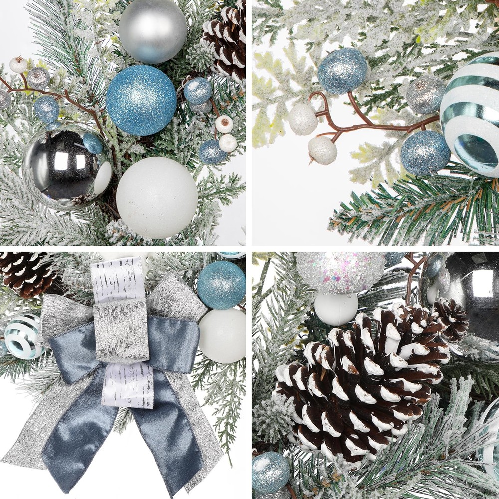 Bring the magic of the holiday season into your home with our stunning collection of Christmas wreaths, garlands, and teardrop swags. Crafted with lifelike frosted pine twigs, each piece is beautifully adorned with vibrant berry clusters, natural pine cones, shimmering ball ornaments, and elegant ribbons. Our 24" wreaths, 6-foot garlands, and 30" teardrop swags are the perfect combination of timeless design and modern convenience, offering a versatile and sophisticated way to decorate your home. Designed for indoor use and covered outdoor areas, these festive decorations add warmth and charm to any space, from mantels and staircases to entryways and porches. The high-quality construction ensures that each piece will retain its beauty year after year, providing a sustainable and affordable solution to holiday decorating. Transform your home into a winter wonderland with our Christmas wreaths, garlands, and teardrop swags, and create memories that will last a lifetime. FESTIVE ELEGANCE FOR YOUR HOME: Our 24" Christmas wreaths, 6-foot garlands, and 30" teardrop swags are designed to bring a touch of holiday charm. Each piece features a lush base of frosted pine twigs, embellished with realistic berry clusters, natural pine cones, shimmering ball ornaments, and beautifully crafted ribbons, offering a stunning blend of traditional Christmas decor PERFECT FOR INDOOR AND COVERED OUTDOOR DECOR: Ideal for creating a warm and inviting atmosphere, these Christmas wreaths, garlands, and teardrop swags are best suited for indoor use. Whether hung on your front door, draped over your mantle, or wrapped around your staircase, these pieces add a festive touch to any room. Keep them indoors to preserve their beautiful frosted pine finish and vibrant decorative details PREMIUM QUALITY CRAFTSMANSHIP: Made from high-quality, artificial greenery, our wreaths, garlands, and swags are designed to mimic the beauty of real pine branches while remaining maintenance-free. Each decorative element, from the berries to the pine cones and ornaments, is securely attached for lasting beauty SIMPLE TO HANG & ARRANGE: With convenient loops and lightweight construction, these Christmas garlands, wreaths, and swags are easy to hang, move, and reposition. They’re perfect for entryways, windows, staircases, or fireplace mantels, making holiday decorating a breeze. DURABLE AND REUSABLE HOLIDAY DECOR: Made to last, our Christmas collection is built with premium quality materials, ensuring you can enjoy these festive accents year after year. Reuse these artificial wreaths, garlands, and swags without worrying about shedding needles or fading colors, making them a sustainable and cost-effective choice