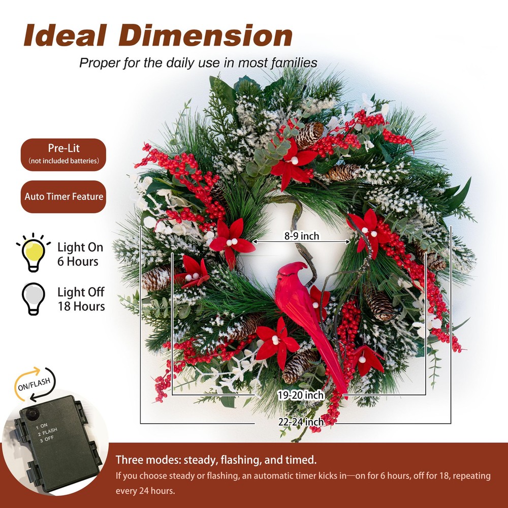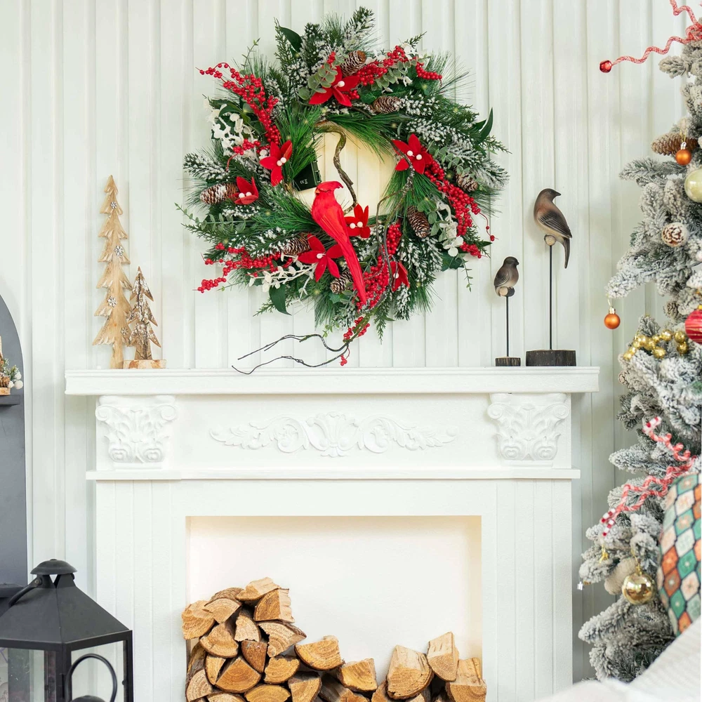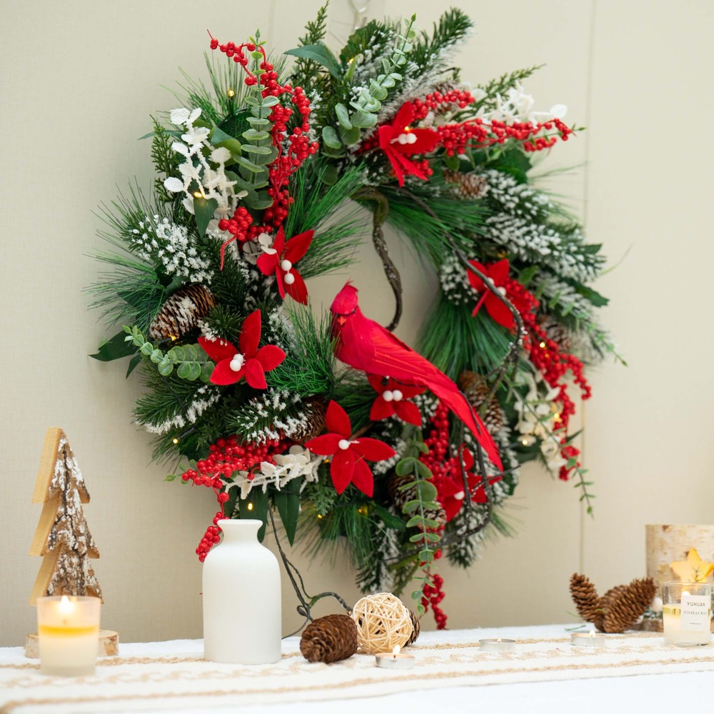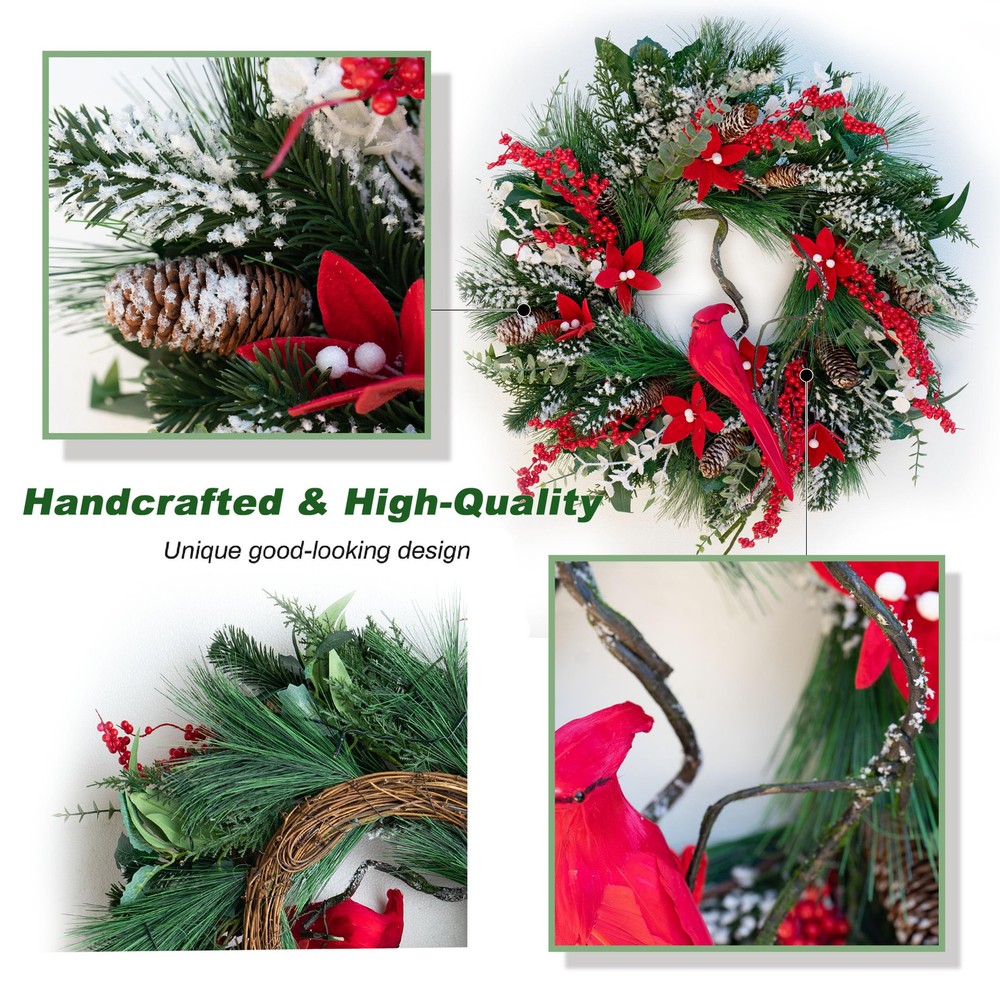 **Handcrafted Cardinal:** This cardinal christmas wreath is intricately crafted using real feathers, giving it a soft, delicate feel, as if it were a part of nature itself. (To maintain the wreath's beauty for years to come, we recommend hanging it in a covered area to prevent fading or damage.) **Realistic Faux Branches:** These faux branches are so lifelike that both their texture and appearance are nearly indistinguishable from the real thing. With flexible wire embedded inside, the branches can be easily shaped to create unique designs, adding dimension and a personalized touch to your decor. **Lifelike Pine Needles:** Crafted from premium materials, the pine needles perfectly replicate the color and texture of various species. The light dusting of snow on the needles and holly berries looks just like a real winter scene, capturing the essence of a fresh, snowy morning and bringing an unparalleled touch of winter charm. **Luxurious Poinsettias:** Handcrafted from velvet, each poinsettia petal is carefully shaped to create a rich, full appearance and vibrant color, resembling a freshly bloomed flower. The velvety texture and bold hue infuse the wreath with a festive spirit. **Elegant Packaging:** The christmas wreath is thoughtfully packaged in a beautifully designed gift box to ensure safe transport and easy seasonal storage. Inside, you'll find a lovely gift card, making it the perfect holiday present for loved ones, spreading warmth and holiday cheer.