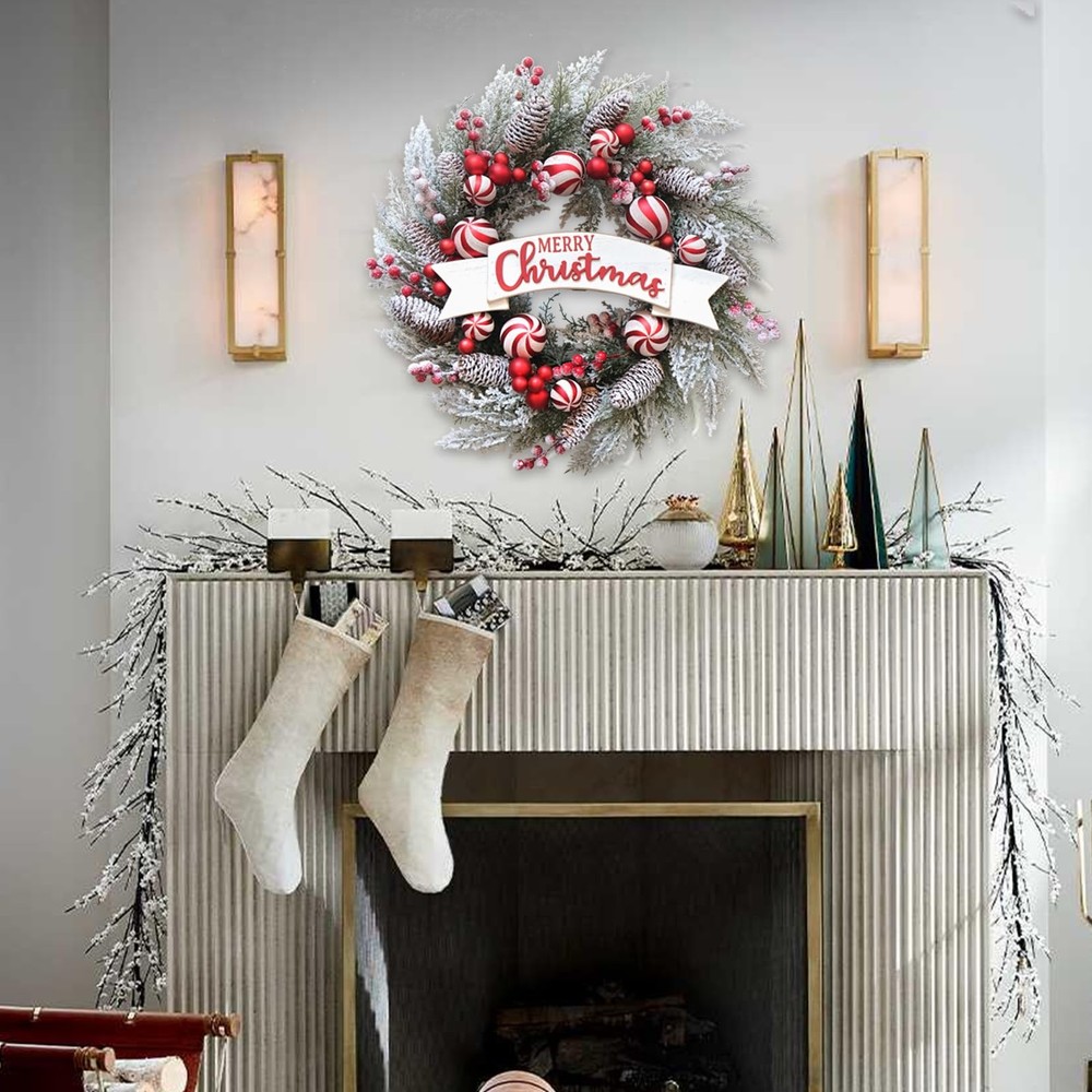A delicate Christmas wreath adorned with realistic snow-covered pine needles and long pine cones, bright candy and spherical decorations. Suitable for indoor or outdoor Christmas decoration, hang this wreath on any door, window, or entrance, or as the centerpiece for holiday parties and other events, it can also be used all year round. The "Merry Christmas" 3D lettered wooden board is sold separately, with its own rope, please refer to the video for installation instructions. The wreath fully expanded measures 24 inches. Due to transportation reasons, the wreath may be slightly compressed, please adjust the position of the branches and candies to achieve a full effect. We recommend using the wreath indoors or in sheltered outdoor areas to avoid direct sunlight and rain. The wreath requires no special maintenance, if there is dust, simply wipe it gently with a dry cloth to restore it to its original newness. Christmas wreath decoration: Adorned with realistic artificial snow-covered pine needles and long pine cones, the wreath looks lifelike,creating a scene of natural plant growth.Bright candies and spherical decorations of various sizes add a sweet festive touch. Classic Christmas colors evoke the joy of the holiday season Sweet theme: The design features a natural black grass circular base, with branches and candies woven firmly together. High-quality materials are selected to ensure that each candy and decorative ball is plump and exudes an attractive luster. The "Merry Christmas" 3D words wooden board adds more depth and visual focus, creating a piece of art full of love and creativity Versatile uses: The brightly colored wreath is suitable for indoor or outdoor Christmas decoration. Hang this wreath on any door, window, or entrance, or as the centerpiece for holiday parties and other events, adding a festive atmosphere to any area of your home. It can also be used all year round, allowing people to feel the warmth and sweetness of the holiday season in their busy daily lives Size: The fully expanded size of the wreath is 24 inches. Due to transportation reasons, the wreath may be slightly compressed. Please adjust the position of the branches and candies to achieve a full effect. The wooden board comes with easy-to-hang jute rope. You can refer to our video instructions for hanging Tips: Each package includes one wreath and one separate decorative wooden board; we recommend using the wreath indoors or in covered outdoor areas to avoid direct sunlight and rainwater; the wreath requires no special maintenance, just gently wipe with a dry cloth to restore it to new condition; if you have any questions about the wreath, please feel free to contact us, and we will provide you with the best solution