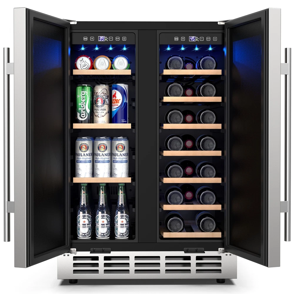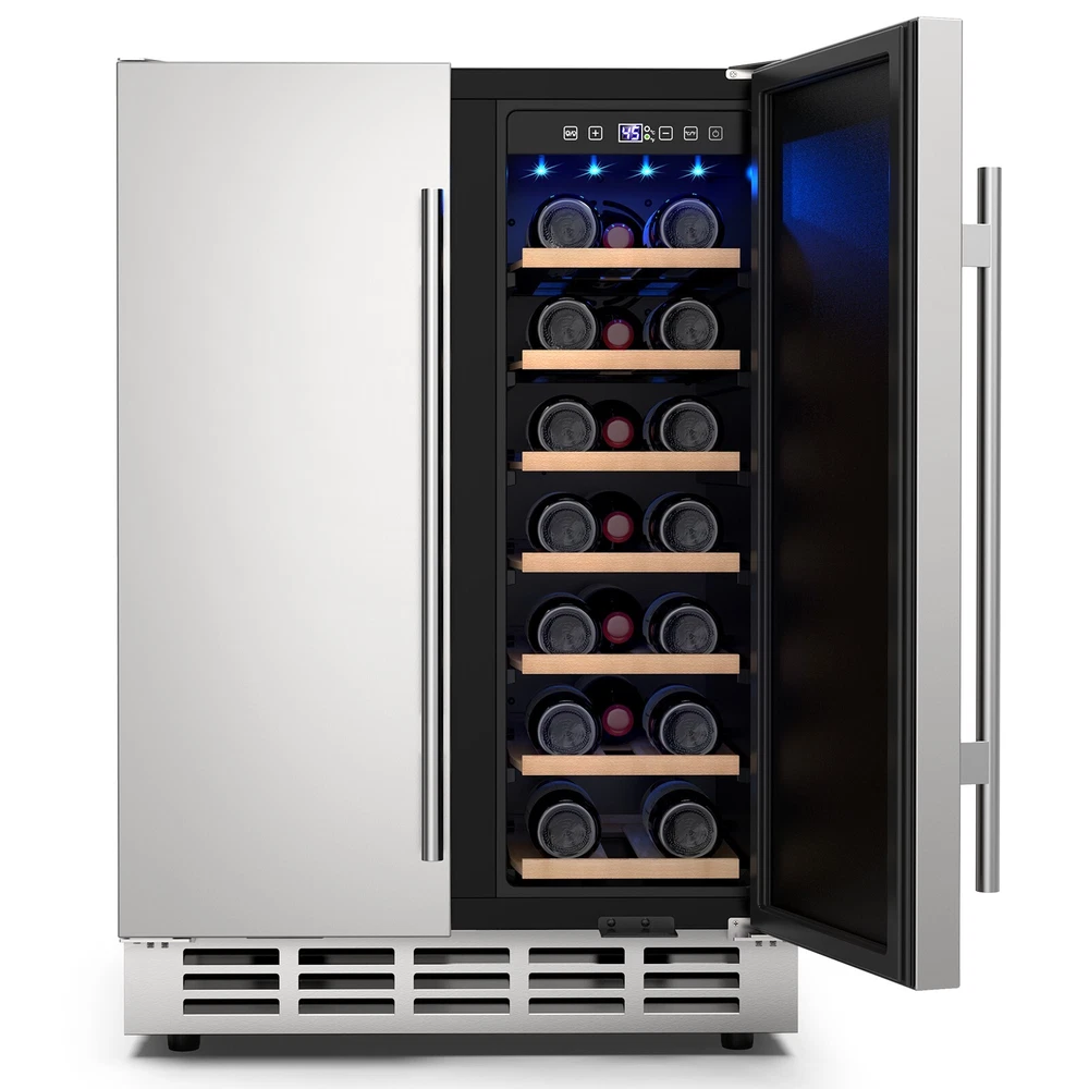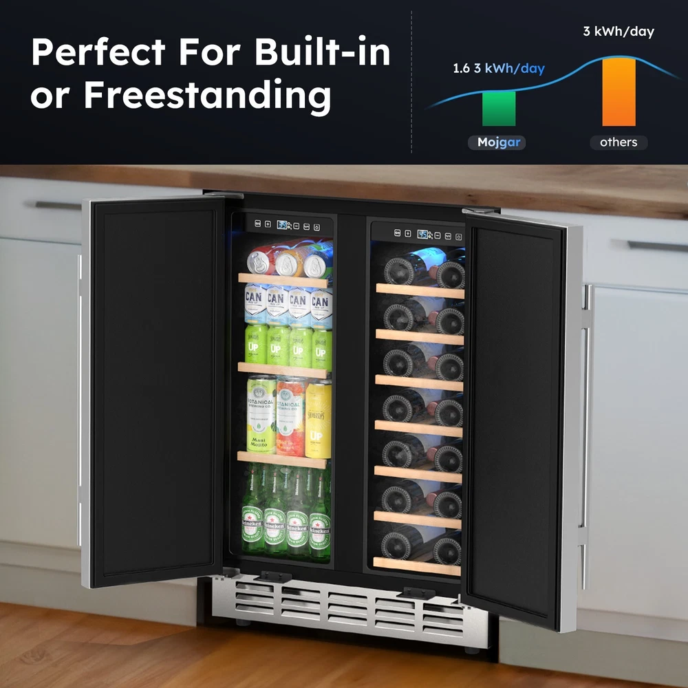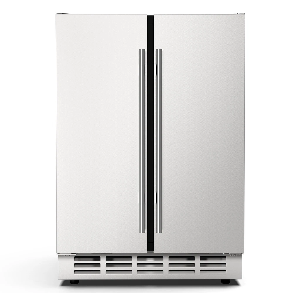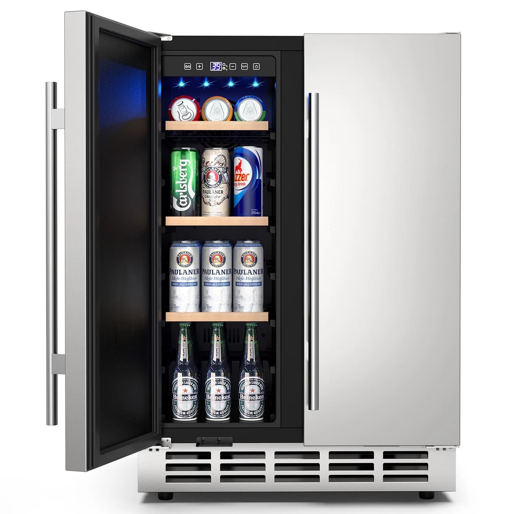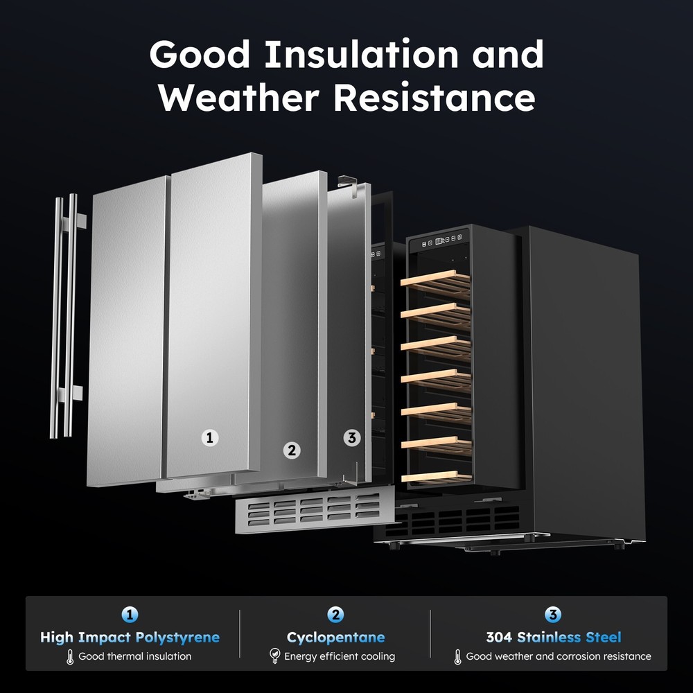 Description 1. Outdoor-Rated Durability & Versatility Stainless Steel Construction : Built with outdoor-rated 304 stainless steel, IPX4 waterproof rating, and anti-fingerprint coating for extreme durability. All-Environment Use : Perfect for outdoor kitchens, patios, garages, or indoor spaces. Ideal for both home and commercial use (bars, restaurants). Temperature Stability : Microcellular high-pressure foam insulation minimizes temperature fluctuations in harsh conditions. 2. Dual-Zone Cooling for Drinks & Wine Independent Temperature Control : Left Zone : Chill beverages (35°F–50°F) for 57 cans or 20 bottles. Right Zone : Preserve wine (41°F–64°F) with precise temperature memory after power outages. Large Capacity : Total storage for 77+ drinks (20 bottles + 57 cans) in 5.3 cu.ft. 3. Quiet, Efficient, & Fast Cooling Upgraded Compressor : Energy Star 5-Star rated compressor with air-cooled refrigeration for rapid cooling and low energy consumption. Ultra-Quiet Operation : Noise levels below 40 dB (quieter than a library) thanks to vibration reduction and advanced fan circulation. 4. Flexible Installation & Mobility 2-in-1 Design : Install as a built-in undercounter fridge or use freestanding with wheels for easy relocation. Space-Saving : Compact 30-inch width (22.6"D x 23.4"W x 34.2"H) fits small spaces. 5. User-Friendly Features Smart Touchscreen Panel : Adjust temperatures and lighting effortlessly. Auto-defrosts every 6 hours. Safety Lock : Child-proof door lock prevents accidental access. Rugged Design : Metal shelves, stainless steel handles, and dual foam-sealed doors for longevity. 6. Hassle-Free Service 24/7 Support : Contact us for replacements or issues due to shipping damage. 24-hour response guarantee. On Apr 12, 2025 at 01:20:47 PDT, seller added the following information: