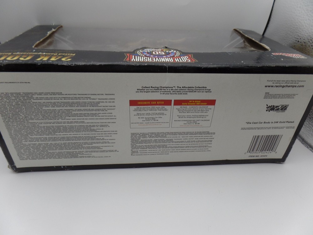 The Racing Champions 24K Gold 50th Anniversary 1:24 #99 Jeff Burton Die Cast Nascar is a commemorative die-cast model of a Ford Taurus NASCAR racecar driven by Jeff Burton in 1998. This limited edition collectible features a 24k gold plated finish, making it a unique addition to any NASCAR fan's collection. It comes with a case, sleeve, and box for display purposes and is part of the Commemorative Series by Racing Champions, celebrating the 50th anniversary of NASCAR. Please review all photos.