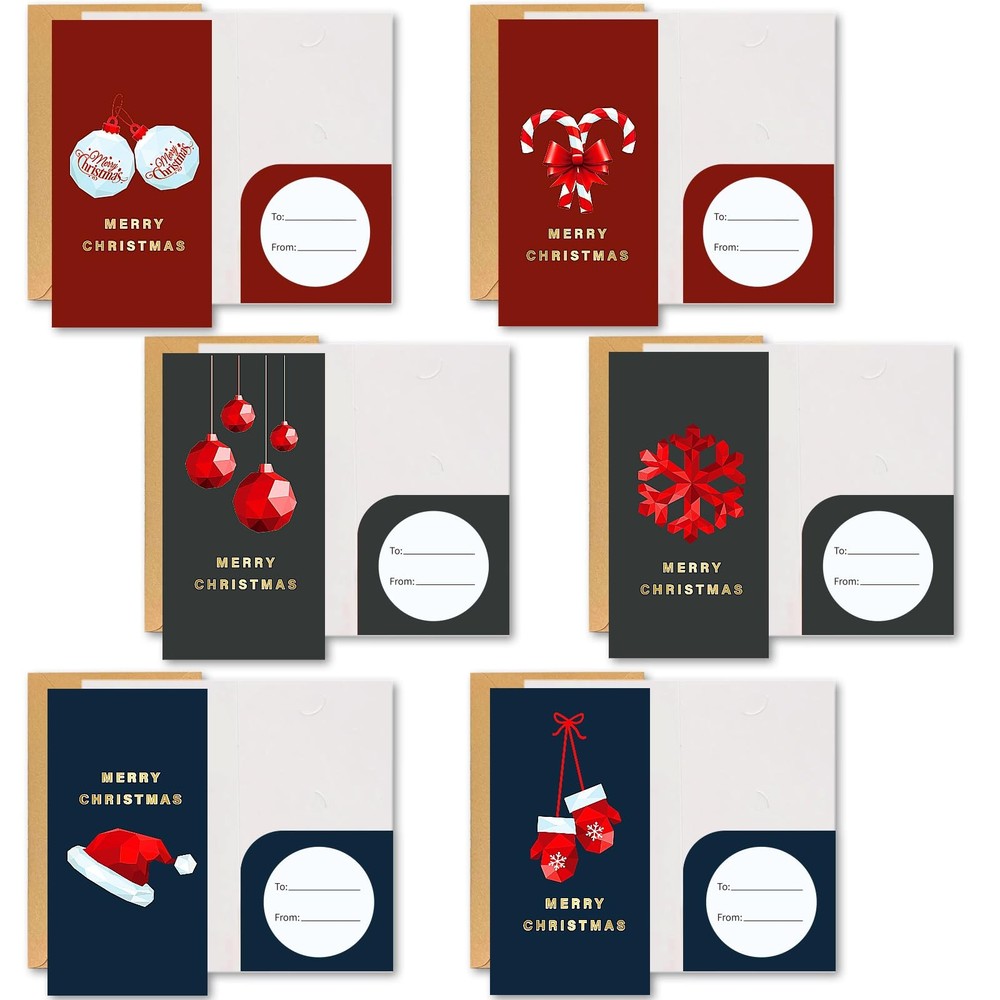 Descriptions: Sending an annual Christmas card may seem like a thing of the past, but there's no better way to get into the holiday spirit than reading a Christmas quote or inspirational Christmas poem written inside a card that was picked just for you. As someone said “There will never be a mode of communication as personal as a handwritten note. They're genuine, deliberate, and will therefore always strike a chord. As such, why not choose a gorgeous and beautiful holiday card to convey your Christmas greetings, in particular, make for the perfect short messages to write inside your DIY or store-bought card to show the receiver just how much you care. Features: Total 24pack of Christmas holidays cards Matched with 24white mailing envelopes and 80 seal stickers 6 assortments of Christmas holidays themes Each assortment in 4pcs Bright colours and cute designs Proper size in 3.5 x 6.8inches ( 8.9 x 17.3cm ) when folded Blank inside for narrative writing Glossy outside but matte and non-bleed inside Made of high-quality 300gsm card stock Use be Christmas cards & New Year Cards A pretty good wish for those who deserve heartfelt Seasonal Greetings, such as friends, family, coworkers, clients, teachers, and classmates. Specifications: Colour: Red, Blue and Black Unfold size of card: 19 x 26cm (7 x 10 inches) Fold size of card: 3.5 x 6.8inches ( 8.9 x 17.3cm ) Size of mail envelopes: 10 x 17cm (4 x 7inches) Diameter of seal stickers: 2.5cm (1inches) Material: 300gsm card stock Finish type: glossy Warranty: 90-day free return Package: 24 x Christmas Holiday Money holder cards 24 x Brown mailing envelopes 30 x Red Seal stickers Material: Christmas gift cards are made of high-quality paper which is lightweight and durable.Christmas money holder 24 sheets in total. Funny Christmas Cards: If you're unsure what Christmas gifts to buy, or you simply know they’d prefer the freedom of choosing their own gifts, gift cards or cash are the most simple and Ideal gifts. Christmas Cards Bulk: Holiday gift cards are individually inspected, then carefully packaged with envelopes, making this money and gift card holder stationary set a must-have for any holiday gift. Christmas Money Cards: Christmas holiday money and gift card holders SIZE is 3.5 inches x 6.8 inches folded and 10.5 inches x 6.8 inches open. The included envelopes measure 4 inches x 7 inches, which allows you to write heartfelt holiday wishes for your friends and family. UNIQUE DESIGN and EASY TO USE: Holiday cards bulk include 6 different designs of cute cartoon style christmas cards. Opening the exquisite Christmas greeting card, the inside is blank.You can express your care and love for your family and friends by writing holiday wishes, poetry, or even creative Christmas pattern.