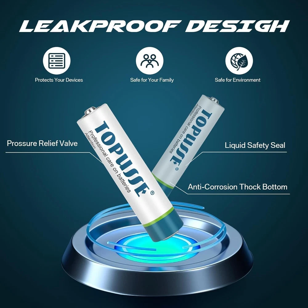 ✅【Long LASTING POWER】Topusse ultra alkaline batteries deliver long lasting power and performance,that is consistent and reliable for everyday use and emergency situations ✅【10-YEAR SHELF LIFE】 All alkaline batteries are always fresh and maintain power with an impressive ten-year shelf life in proper storage, Providing power in everything from emergency situations to playtime ✅【LEAKPROOF DESIGN】AAA batteries are designed with a double layer internal structure housed within a stainless steel cover so that they are 100% leakproof. Avoid short circuits, mixing and matching old batteries with new ones. ✅【ENVIRONMENTALLY CONSIDEREDE】Our 1.5-volt alkline batteries contain no mercury or cadmium, making them a smart choice for your family and for the environment. ✅【IDEAL FOR EVERYDAY USE】These batteries are compatible with all devices that require 1.5V AAA batteries for daily household devices such as game controllers, remote controls, and children's toys, and so on. Topusse alkaline aaa batteries are great to have on hand for a variety of everyday household devices, including clocks, remote controls, game controllers, digital cameras, toys and more. batteries won't leak and are designed to last ten years in storage. The 1.5-volt batteries contain no mercury or cadmium, making them a smart choice for your family and for the environment. our mission is to provide trusted and dependable power for everyday needs.