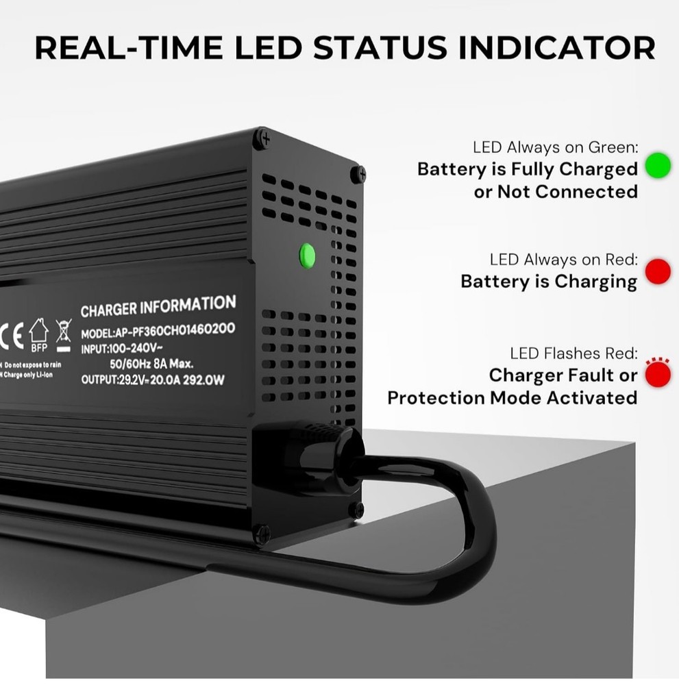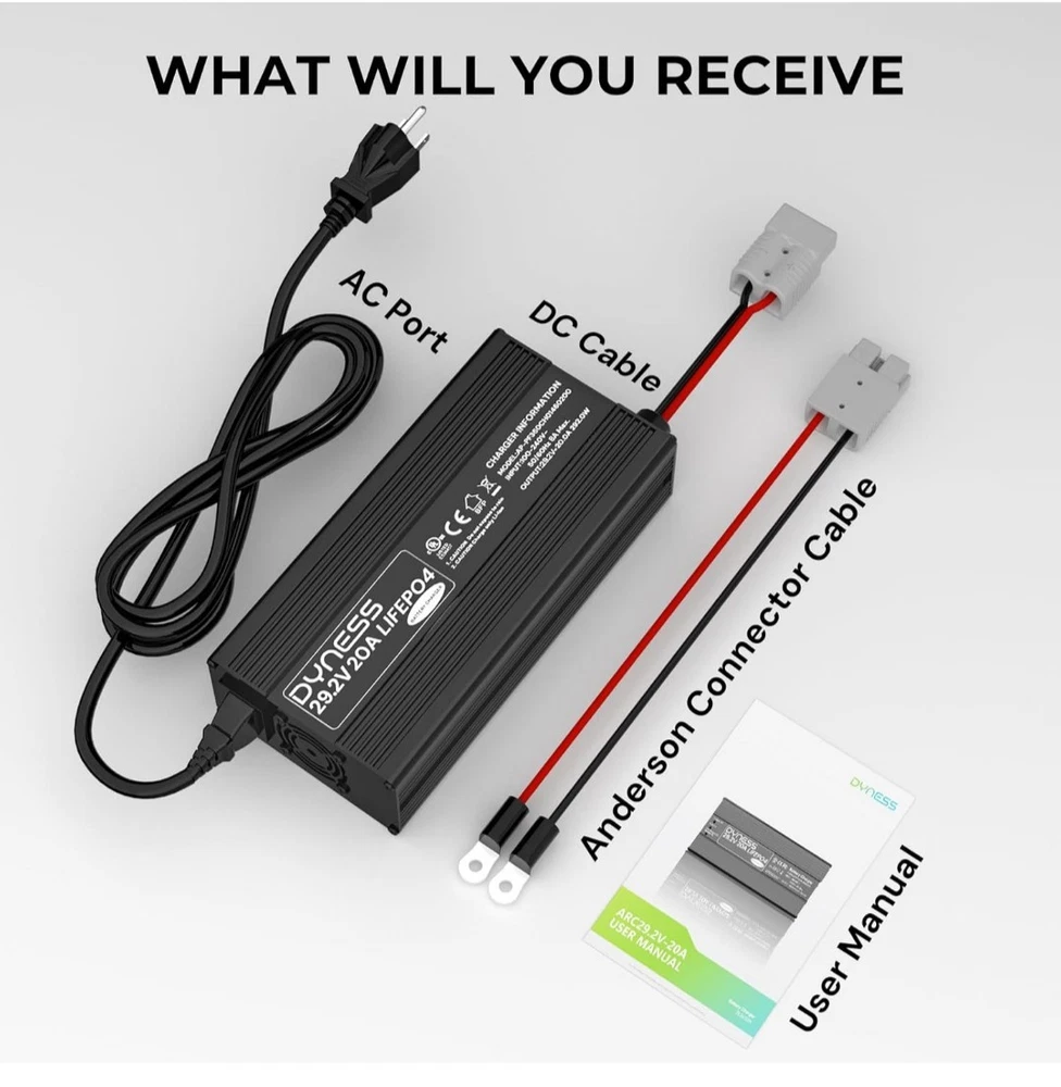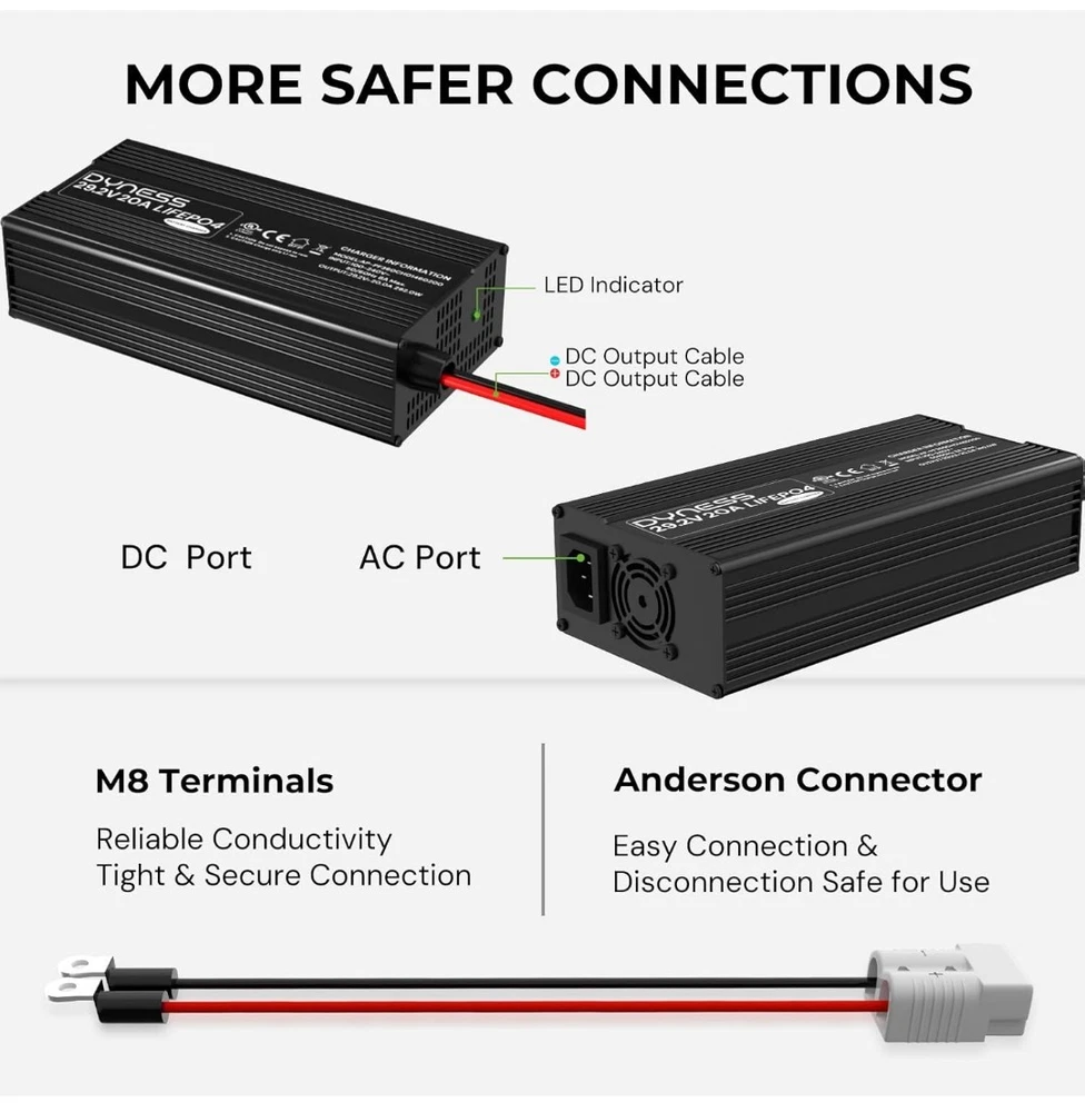 24V 20A LiFePO4 Battery Charger 29.2V Smart Charger with Anderson Connector & LED Indicator - 0V Activation & Multi-Protections for RV, Boat, Off-Grid, Solar Systems. Precise 24V LiFePO4 Compatibility & 20A Fast Charging】 Exclusively designed for 24V LiFePO4 deep-cycle batteries, this charger delivers 29.2V stable output and 20A fast charging current, significantly reducing charging time for RVs, boats, off-grid systems, and home energy storage. Supports 100-240V AC global wide input (50/60Hz, 8A max input current) 【0V Activation & 3-Stage Smart Charging】 Equipped with a precharge mode to reactivate deeply discharged (even 0V) or idle "sleeping" batteries, extending their service life. Automatically switches between 3 charging stages: Precharge → Fast Charge (constant current) → Constant Voltage. It shuts off automatically when the current drops to the set value, preventing overcharging damage. 【Durable Aluminum Alloy Design & Portability】 Crafted with oxidation-treated aluminum alloy housing, featuring high hardness, anti-oxidation, and non-fading properties. Excellent thermal design ensures efficient heat dissipation for long-term stable operation. Compact size (8.46×3.94×2.13 inches / 215×100×54mm) and lightweight (1.3kg/2.87lbs) make it easy to carry and store for outdoor adventures. 【Multiple Safety Protections & Stable Connection】 Built with 4 core safety safeguards: over-temperature, output short-circuit, reverse polarity, and output over-voltage protection, avoiding risks from faulty operations. Equipped with a 50A Anderson Connector for firm and stable connections, ensuring smooth output during high-current charging. Simple wiring (positive to positive, negative to negative) for hassle-free use.