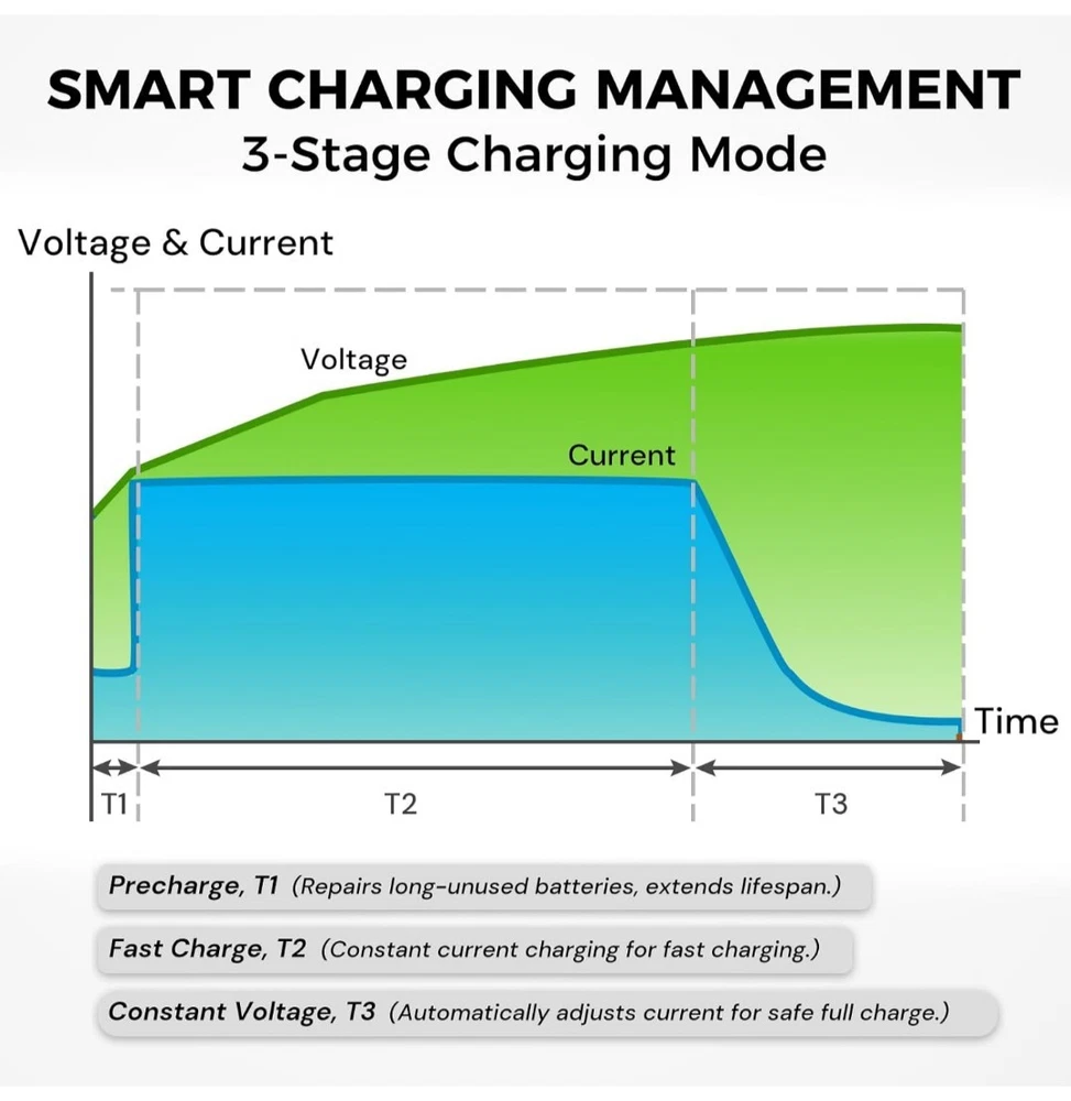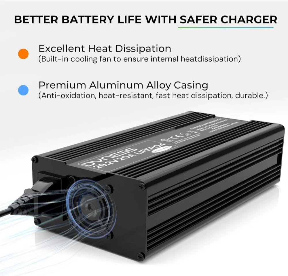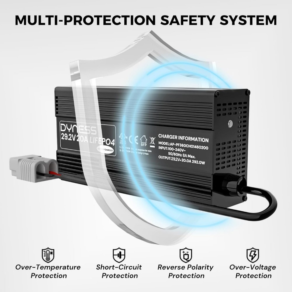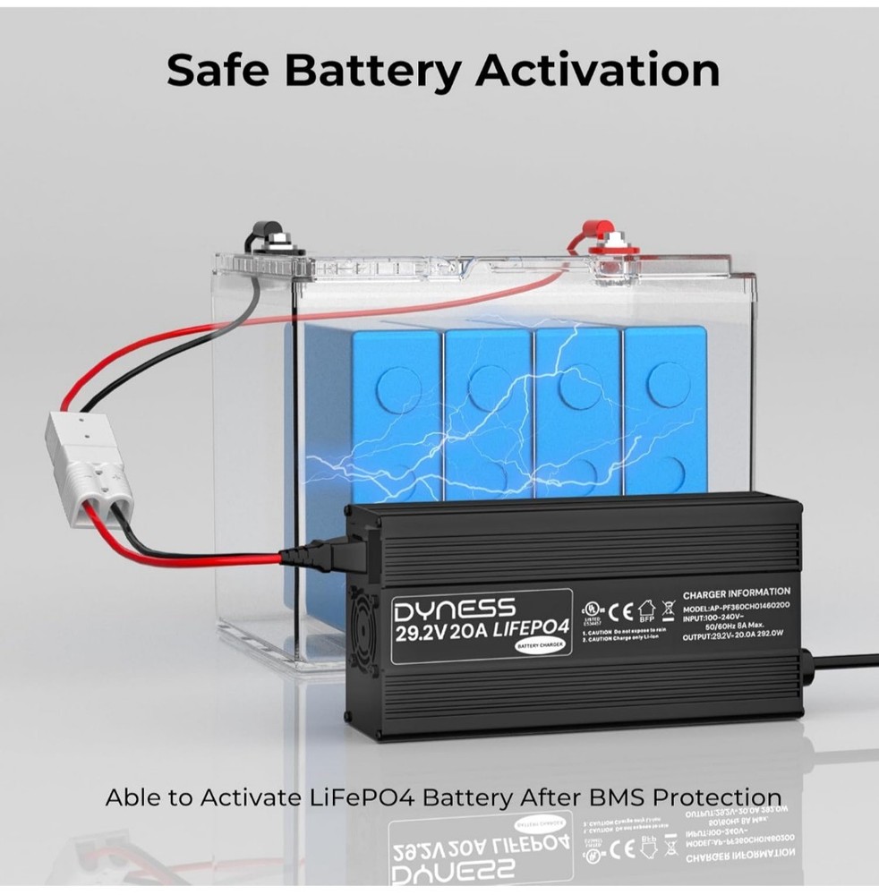 24V 20A LiFePO4 Battery Charger 29.2V Smart Charger with Anderson Connector & LED Indicator - 0V Activation & Multi-Protections for RV, Boat, Off-Grid, Solar Systems. Precise 24V LiFePO4 Compatibility & 20A Fast Charging】 Exclusively designed for 24V LiFePO4 deep-cycle batteries, this charger delivers 29.2V stable output and 20A fast charging current, significantly reducing charging time for RVs, boats, off-grid systems, and home energy storage. Supports 100-240V AC global wide input (50/60Hz, 8A max input current) 【0V Activation & 3-Stage Smart Charging】 Equipped with a precharge mode to reactivate deeply discharged (even 0V) or idle "sleeping" batteries, extending their service life. Automatically switches between 3 charging stages: Precharge → Fast Charge (constant current) → Constant Voltage. It shuts off automatically when the current drops to the set value, preventing overcharging damage. 【Durable Aluminum Alloy Design & Portability】 Crafted with oxidation-treated aluminum alloy housing, featuring high hardness, anti-oxidation, and non-fading properties. Excellent thermal design ensures efficient heat dissipation for long-term stable operation. Compact size (8.46×3.94×2.13 inches / 215×100×54mm) and lightweight (1.3kg/2.87lbs) make it easy to carry and store for outdoor adventures. 【Multiple Safety Protections & Stable Connection】 Built with 4 core safety safeguards: over-temperature, output short-circuit, reverse polarity, and output over-voltage protection, avoiding risks from faulty operations. Equipped with a 50A Anderson Connector for firm and stable connections, ensuring smooth output during high-current charging. Simple wiring (positive to positive, negative to negative) for hassle-free use.