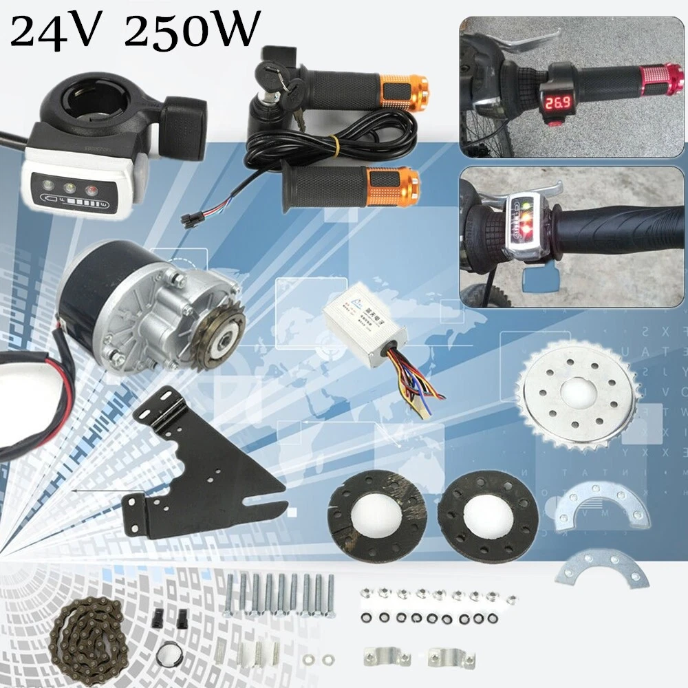 24V 250W Electric Bicycle Bike Conversion Kits EBike Brush Motor with Freewheel 24V 250W Electric Bicycle Bike Conversion Kits EBike Brush Motor with Freewheel Important NOTE: This item is for the bike that uses the hub diameter less than 36mm. This item doesn't include battery or charger. This is our newest kit for electric common bike, this kit mounts the sprocket on the wheel spokes, so it fits most of bicycle wheel. Motor use freewheel so when wheel rotating, the motor will not rotate, just like a normal bike, this can reduce resistance. The Twist Kit Includes: 1. 1x 250W 24V brush motor with freewheel 2. 1x Chain 3. 1x Customized sprocket & components 4. 1x Motor controller 5. 1x Mounting plate + bolts 6. 1x Twist throttle (with battery indicator & key switch) During installation, it is necessary to adjust the angle to ensure that the front and rear wheels are in a straight line. If the angle is not correct, it can be adjusted by adding or removing shims under the mounting plate at the axle position. If the front and rear wheels are not in a straight line, the chain will tilt to one side. This causes the force to tilt to one side all the time when the flywheel rotates, making it easy for the flywheel to be damaged. During installation, it is necessary to adjust the angle to ensure that the front and rear wheels are in a straight line. If the angle is not correct, it can be adjusted by adding or removing shims under the mounting plate at the axle position. If the front and rear wheels are not in a straight line, the chain will tilt to one side. This causes the force to tilt to one side all the time when the flywheel rotates, making it easy for the flywheel to be damaged. Payment Delivery details Terms of sales About us Contact us Payment We accept ebay payment 。 Fees such as import duties, taxes are not included in the item price or shipping costs. These charges are the buyer's responsibility. Delivery details Shipping: 2-9 working days to: USA Terms of sales We maintain high standards of excellence and strive for hundred percent customer satisfaction. Feedback is very important to us. We hope that you contact us immediately before you give neutral or negative feedback, so that we can address your concerns. It is impossible to address issues if we do not know about them! About us Your satis faction is our ultimate goal. We work hard to earn your trust and future business. Our certified technicians have tested each item before shipping. The unit comes with 1 year limited warranty on all manufacturing defects. a) If you receive a defective item, you may return it or ask for a discount. Please contact us within 14 days after you receive the package. b) What you returned must be intact and in its original packaging as re? u. Customer is responsible for shipping costs of the returned item. c) We will cover the cost of shipping back t with the shipping rate indicated in the registration page. We will send you a new unit or refund the full payment you paid. Thank you. Contact us Business Hour Business Hour: Monday To Friday: 8:30 AM to 5:00 PM (Beijing China time) Due to time zones, our reply to your questions may not be immediately. But within above working time, we will reply your email within 24 hours. If it's non-workdays, please kindly be patient and wait till Monday. Please contact us with ebay message. Please feel free to contact us if you have any questions. Monday To Friday: 8:30 AM to 5:00 PM (Beijing China time) Due to time zones, our reply to your questions may not be immediately. But within above working time, we will reply your email within 24 hours. If it's non-workdays, please kindly be patient and wait till Monday. Please contact us with ebay message. Please feel free to contact us if you have any questions.