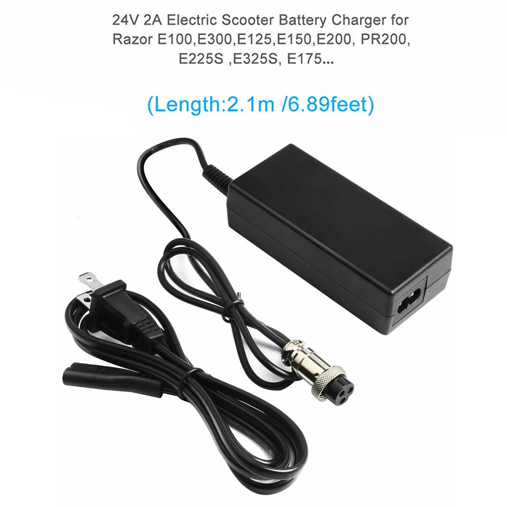 Item Specification Input: AC 80-240V, 50-60Hz Output: DC 24V 2A Power: 48W Outlet: 3-prong Connecter size: Female 3-Pin Inline Note: Please make sure the DC output and tip size of ac adapter are accordant before you bid. Condition: Brand New Replacement Product, works as genuine parts, 100% OEM Compatible!! US 2.5ft power cord included Compatible Models RAZOR E500 S Electric Scooter RAZOR MX350 Dirt Rocket Electric RAZOR E300 Electric Scooter RAZOR Mini Chopper RAZOR Rebellion Electric Chopper RAZOR Dirt Quad Electric ATV RAZOR E200 Electric Scooter RAZOR PR200 Pocket Rocket RAZOR Ground Force Electric Go-Kart RAZOR Pocket Mod Electric Scooter RAZOR E100 Electric RAZOR E125 Electric Boreem Jia 601-S (250 watt version) Boreem Jia 602-D (250 watt version) City Express Electra Scoot N Go E-Scooter Freedom 644 Freedom 943 Freedom 961 Panterra Rad2Go E5 Leopard Shark (some models) Rad2Go E10 Tiger Shark (some models) Star II E-Scooter Sunl Super Ride Turbo 350 EG Urban Express Vapor X-12 Vapor X-24 X-Treme X-50-300 X-Treme X-250