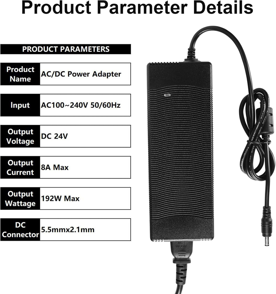 Store New Arrivals Add to Favorite View Feedback Contact 24V 8A Power Supply Adapter, AC to DC Converter AC 100V-240V to DC 24 Volt 8 Amp 192W Switching Transformer LED Driver with 5.5Mm X 2.1/2.5Mm DC Jack Connector for Car Cigarette Lighter LCD Monitor Description Item model number 24V 8A 192W Part Number 1 Style 24V 8A 192W Maximum Power 192.00 Power Source Corded Electric Color Black Brand HUEMIHUI Batteries Required? No Package Dimensions 9.29 x 5 x 1.89 inches Item Weight 0.58 Kilograms Batteries Included? No Current Rating 8 Amps Manufacturer HUI Specification Met CE, FCC, UL Wattage 192 watts Included Components 1 24V POWER SPECIFICATION: 24v 8a power supply is a high quality AC to DC transformer converter, Input: 100-240V 50/60Hz; Output: 24V DC 8A 192W Max; Suitable for automotive equipment with current less than 8A. Please do not overload it MULTIPLE SAFETY PROTECTION FUNCTIONS: 24v power transformer has built-in automatic overvoltage protection, overcurrent protection, overtemperature protection and short circuit protection, and the service life exceeds 80,000 hours FULLY CONFIGURED-EASY TO USE: The 24V AC transformer output DC adapter jack size is 5.5mm x 2.1mm. To meet more needs, it comes with a 5.5mm x 2.5mm DC connector. You can easily screw the wires onto it, no soldering required WIDE COMPATIBILITY: The 24 volt power supply dc is suitable for almost all 24V electronic product equipment under 192W, LED strips, air compressors, car cleaners, refrigerators, DVR recorders, LCD monitors, massage chairs etc.Note: Indoor use only PACKING LIST: 1x24V 8A power supply adapter, 1xAC power cable cord, 1xDC connector. We care about your shopping experience, and at the same time, we care more about your use experience. If you have any questions, please feel free to contact us Product description Product Specification Product name 24V 8A Power Adapter Product condition 100% Brand New Colour Black Input voltage 100-240VAC, 50/60Hz Output voltage 24VDC Output power (max) 192W Current full load 8A Output DC connector 5.5mm x 2.1/2.5mm (inside"+", outside"-") Protection class IP30 Superior safety & durability Built-in protection against overheating, overloading, overcharging, short circuits provides the ultimate protection for you and your equipment. Rugged housing protects against scratches, bumps, drops, pressure and keeps internal components safe in an emergency for extended life. Strong durable tail card The tail card is made of high-quality material, which is not easy to be damaged and broken, which can ensure its longer service life and give you more peace of mind during use. Copper nickel interface The interface is made of pure copper material, with strong conductivity, stable output and higher safety, which is very suitable for different indoor occasions. High quality cable The use of high-quality copper conductors, individual wire insulation and flexible flame retardant PVC jackets provide you with a safe and reliable cable with better conductivity for added peace of mind. Anti-interference magnetic ring The anti-interference magnetic ring can effectively reduce electromagnetic interference, and has strong anti-interference performance to ensure stable current transmission. Expanded application Added a 5.5mm x 2.1/2.5mm DC Output Plug, clearly identified: Positive(+) Negative(-). You can screw wires to it to power devices that don't have a DC plug, which will greatly expand its range of applications. This is a beefy 24V 8A switching supply, for when you need a lot of power. Notice: 1. Indoor use only (not waterproof). 2.Please check your device parameters and our description before purchasing to confirm that this power supply is compatible with your device. 3. Polarity of DC connector: inner positive (+), outer negative (-), pay attention to check when connecting to avoid wrong connection. 4. Please allow 1‑2cm error due to manual measurement. Thanks for your understanding. 5. The monitor is not calibrated the same, the color of the item shown in the photo may be slightly different from the actual item. Please refer to the actual product. Package included: 1* 24V 8A power supply adapter 1* AC power cable cord 1* DC female connector ABOUT US We offer the best prices around on high quality products. Our E-store includes media such as books, movies, music and games while offering electronics, toys, sporting apparel, clothing, tools, general home, garden items and more. SHIPPING We are always working hard to ensure your package arrives as soon as possible. Please understand that some factors like weather, high postal traffic, and the performance of shipping companies are outside of our control. We offer free shipping to the lower 48 states and ship within 2 business days of payment, usually sooner. We do not accept P.O. Boxes. Please provide a physical address. RETURNS We offer a 30-Day Return Policy on items which you are not completely satisfied with. You have the option for a full-refund or an exchange of the item. No returns are available on items shipped outside of the USA. PAYMENT We accept PayPal. CONTACT US This page content is yet to come Please ad us to your favorite seller and visit again later Thank You CUSTOMER SATISFACTION We try our very best to make sure every customer is completely satisfied. If there's a problem, message us! We're happy to help.