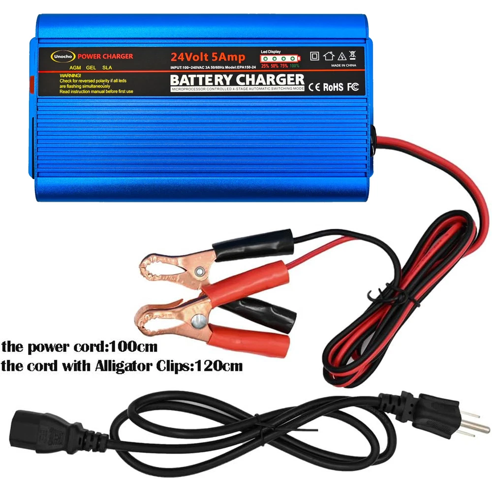 ✅【Fast charging】: The 24V 5A battery charger comes with a rechargeable AC extension cable and supports AC100-240V input for worldwide use with a rechargeable AC cord C13 inlet. Automatic smart charger can charge batteries with a capacity of 7-120Ah and provides a constant current output for faster charging, with an output amperage of 5A. ✅【Safe and reliable】: The 24V charger is designed and manufactured in strict accordance with UL/CE/CCC safety standards and prescribed procedures for pulse charger maintainers. Intelligent 4-step charging program (Initialization, Bulk Charge, Float Mode) driven by the newest MCU allows for optimization of battery power .This charger has ultra-low standby power consumption and complies with global five-level energy efficiency standards. ✅【Multiple safety protections】: The 24 Volt battery charger has a fully automatic 4-stage charging process controlled by a microcontroller. The intelligent battery charger for cars provides short circuit protection to ensure that the battery is fully charged.It has protections against short circuit, overvoltage, overcurrent, overload, and reverse polarity. ✅【Unique design】The smart battery charger is made of high-density aluminum with an I/O switch.The 24V trickle charger has 4 speed gears automatically adjusted by power load, effectively reducing noise and heat dissipation. 24V battery maintainer has an IP65 waterproof rating for protection, and an internal large fan to provide excellent heat dissipation. The pulse charger maintainer also features one red LED power indicator light and 4 green LED charging progress indicator lights. ✅【Wide range of applications】: The Automatic Battery Charger with Alligator Clips is suitable for charging all SLA / VRLA / Flooded (Wet) / Calcium type deep cycle / GEL / AGM lead-acid batteries , including those used in wheelchairs, electric carts, electric forklifts, self-balancing unicycles, vehicle,motorcycle and trucks. ✅【Unocho battery charger】:The Unocho 24V battery trickle charger is comes with worry-free return and exchange services as well as 24-hour customer support, eliminating all your worries about this car battery charger