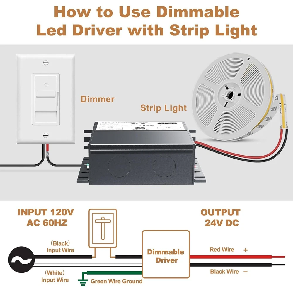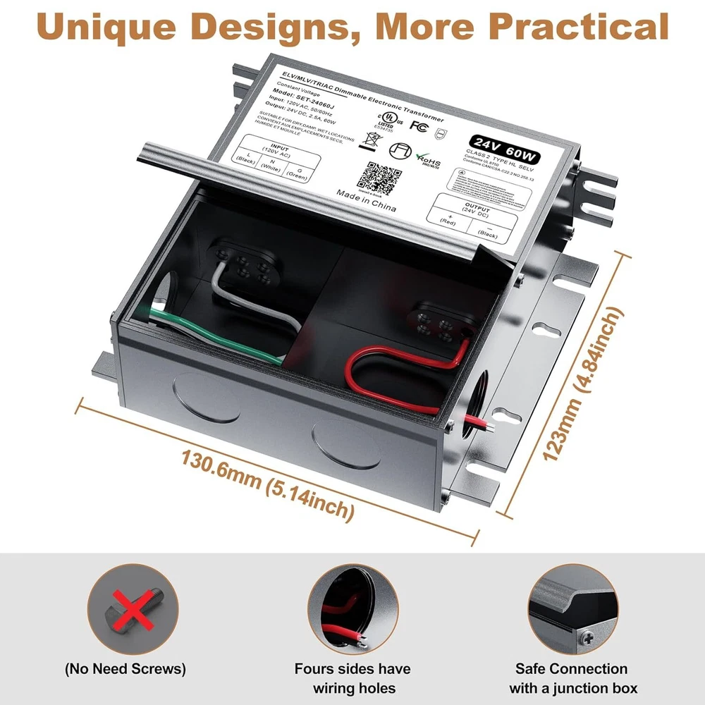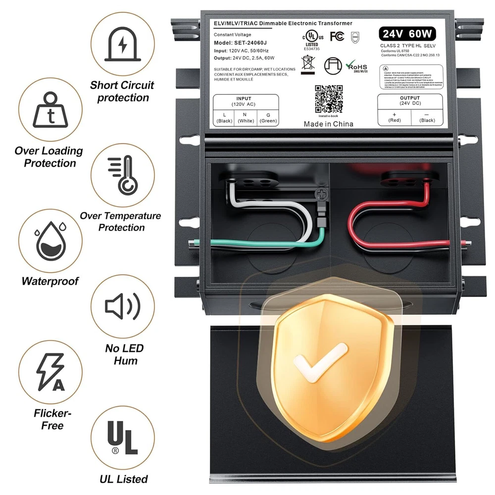 Product Description 24V Dimmable LED Driver, 60W Triac ELV/MLV LED Transformer Compatible with Lutron&Leviton Switches, Dimmable Led Power Supply 60W 12V for LED Light Smooth Flicker Free Dimming Strong compatibility & Widely Use:Our ELV/MLV Triac dimmable LED driver 60W24V is compatible with Lutron &Leviton Switches, it can be used for a variety of applications, including 24V LED Strip Lights, 24V Power Supply, LED modules, LED bulbs, and more. With this 24v transformer, you can enjoy beautiful dimming experience! Easy installation & No Need Screws: There are fours sides have wiring holes, it is very convenient for your install in any position. Just open the junction box and connect the corresponding wires of the driver(you can refer to the wiring diagram on the picture). and you can Open and close the junction box easily, don’t need extra screws, just press and pull. Safety & High quality dimming: Our 24V 60W dimmable transformer is one of the safest transformers on the market. Designed with full protection metal case, for dry, damp, wet location. Built-in protections include Short Circuit/Over Loading/ Over Temperature protection. Its cooling system prevents overheating and fire hazards, and with no buzzing noise, you can enjoy worry-free dimming for your LED lights. Service & Guarantee: All our led driver provide a 5-year warranty service, any reason or any problem, please feel free to write to us by amazon order message directly, we will response you in 12 hours Specifications: This 24v 60W led transfomer includes: UL, cUL listed, Class 2, Class P, Type HL rated. FCC compliant About Us We are a reputable seller with many years of experience selling on eBay. Our goal is to provide high-quality products and excellent customer service. Shipping Items will be shipped within 1-3 business days when we received payment. (Orders are not processed on weekends & holidays) Tracking information will be sent once item is shipped. Delivery time depends on destination and other factors Item is shipped to ebay address. Leaving correct address can minimize delay. For international shipping and shipping to Guam, Hawaii and Alaska, Please contact us before placing the order. International buyers please note: Import duties, taxes and charges are not included in the item price or shipping charges. These charges are buyer’s responsibility. We will try our best to reduce the risk of the custom duties. Local pick-up is unavailable at the moment. Contact Us We reply any email messages within 1 business / working days(off-duty at weekend). If you do not get a response from us, then please check your junk or spam mailbox. Our Business hours: Mon-Fri 9:00-18:00, UTC/GMT +8 hours. Please contact us either by clicking "contact seller" in the "purchase history" section or simply click "ask a question" at the bottom of this page. If you are unsatisfied with our item or service, please contact us before leaving any feedback. We are committed to resolve all issues in a friendly and satisfactory manner.
