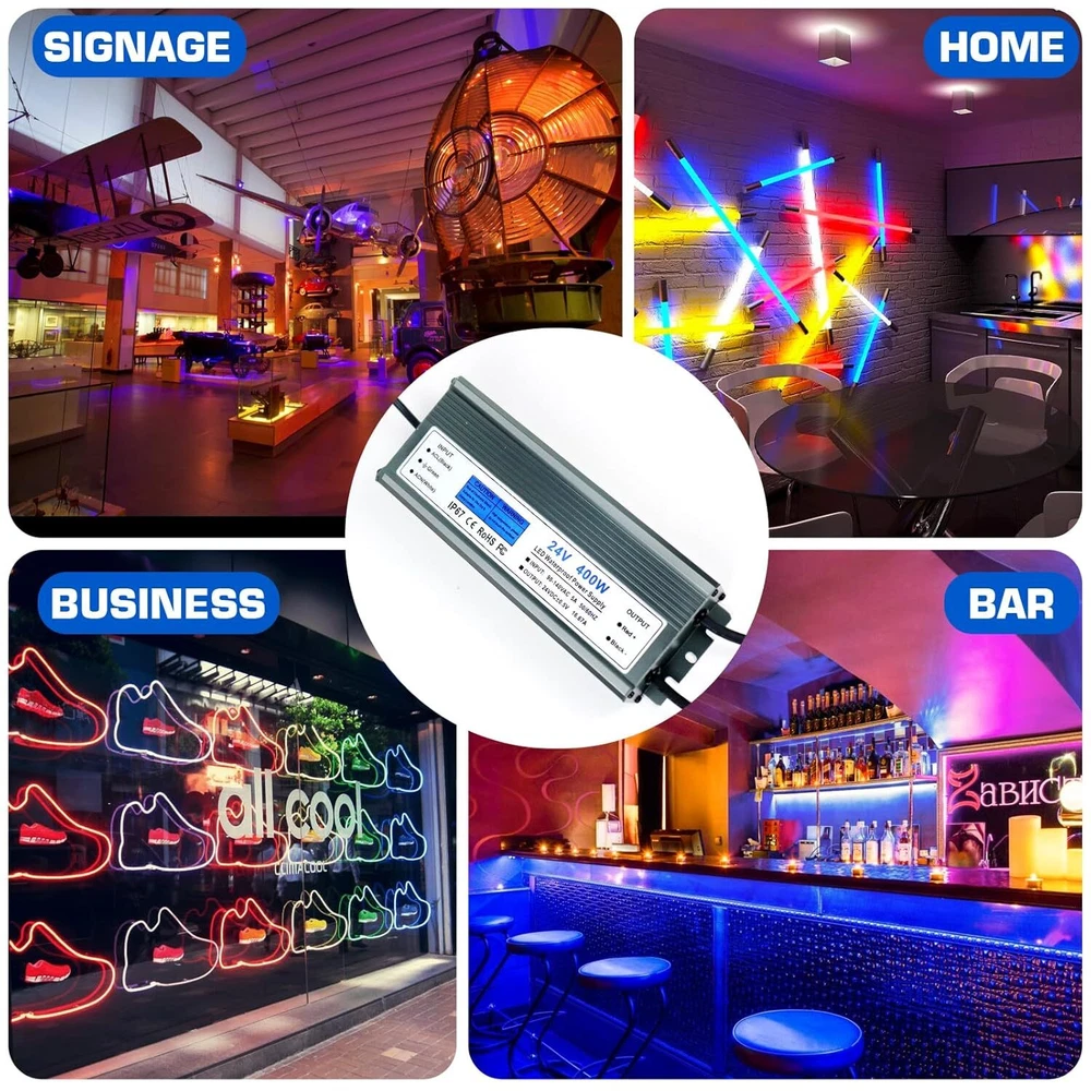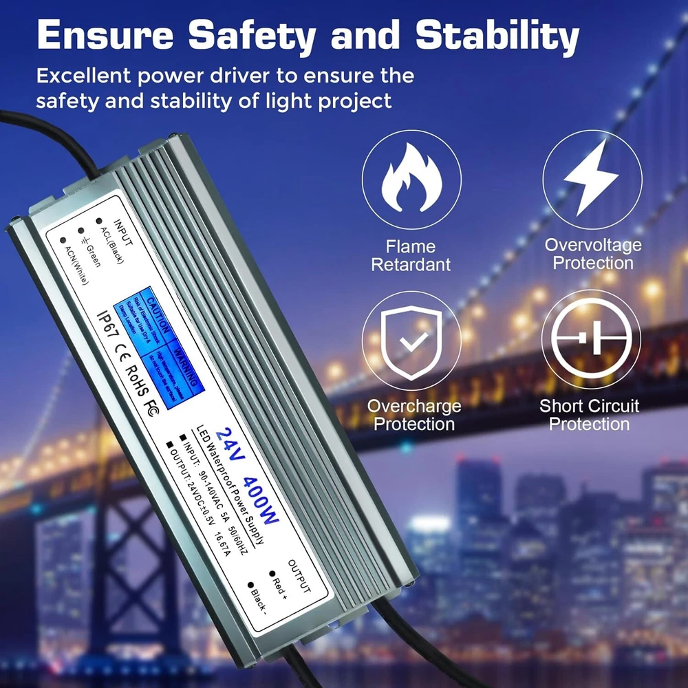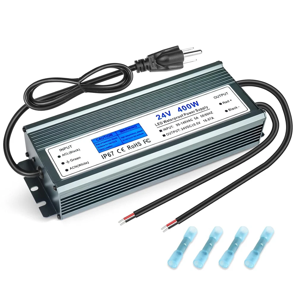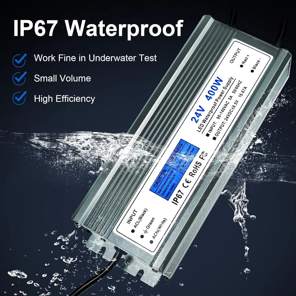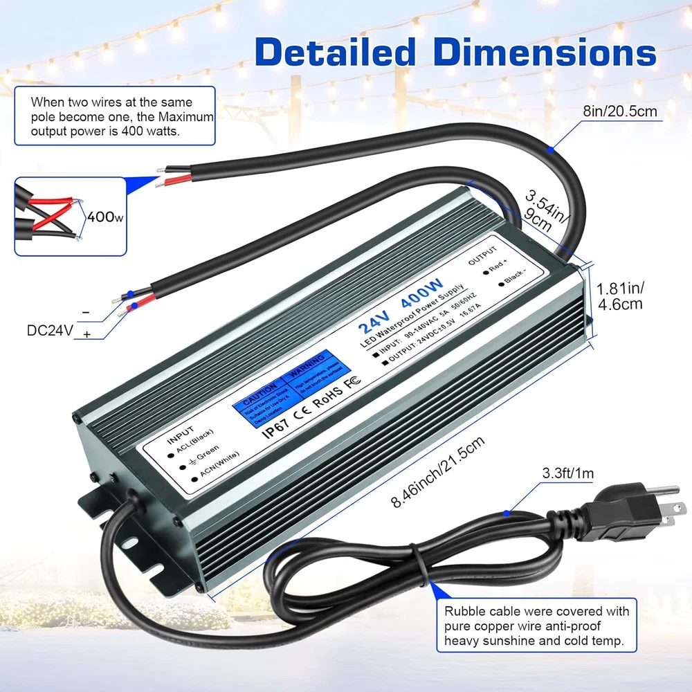 Product Description 24V Power Supply 16.67A 400W IP67 Waterproof LED Power Supply AC 90-140V to 24V DC Low Voltage Transformer with 3-Prong Plug for Any Indoor Outdoor 24V DC LED Lights, Computer Project 【24V LED Driver】: Input: AC90-140V 50/60HZ; Output: DC24V, 16.67A, 400W, 3.3 ft input cord with US standard 3-prong plug 【Safety Protection】: Automatic protection for short circuit / overload / over voltage / over current / over temperature 【Waterproof LED Power Supply】: 100% IP67 waterproof. Maintains consistent power delivery even in damp or wet environments, ensuring optimal performance of connected devices 【Durability & Stable Performance】: Maintains stable power output even in challenging conditions, optimizing the performance of connected devices for consistent operation 【Wide Application】: Suitable for outdoor and indoor use; Like LED Strip Lights, Street Light, Surveillance Cameras, Fog-proof Light, Ceiling Lights, Frack Lights, Spotlight, Billboard, Monitoring Camera, Motor and Computer Projector, kitchen Cabinet lights and LED Landscape Transformer, etc About Us We are a reputable seller with many years of experience selling on eBay. Our goal is to provide high-quality products and excellent customer service. Shipping Items will be shipped within 1-3 business days when we received payment. (Orders are not processed on weekends & holidays) Tracking information will be sent once item is shipped. Delivery time depends on destination and other factors Item is shipped to ebay address. Leaving correct address can minimize delay. For international shipping and shipping to Guam, Hawaii and Alaska, Please contact us before placing the order. International buyers please note: Import duties, taxes and charges are not included in the item price or shipping charges. These charges are buyer’s responsibility. We will try our best to reduce the risk of the custom duties. Local pick-up is unavailable at the moment. Contact Us We reply any email messages within 1 business / working days(off-duty at weekend). If you do not get a response from us, then please check your junk or spam mailbox. Our Business hours: Mon-Fri 9:00-18:00, UTC/GMT +8 hours. Please contact us either by clicking "contact seller" in the "purchase history" section or simply click "ask a question" at the bottom of this page. If you are unsatisfied with our item or service, please contact us before leaving any feedback. We are committed to resolve all issues in a friendly and satisfactory manner.