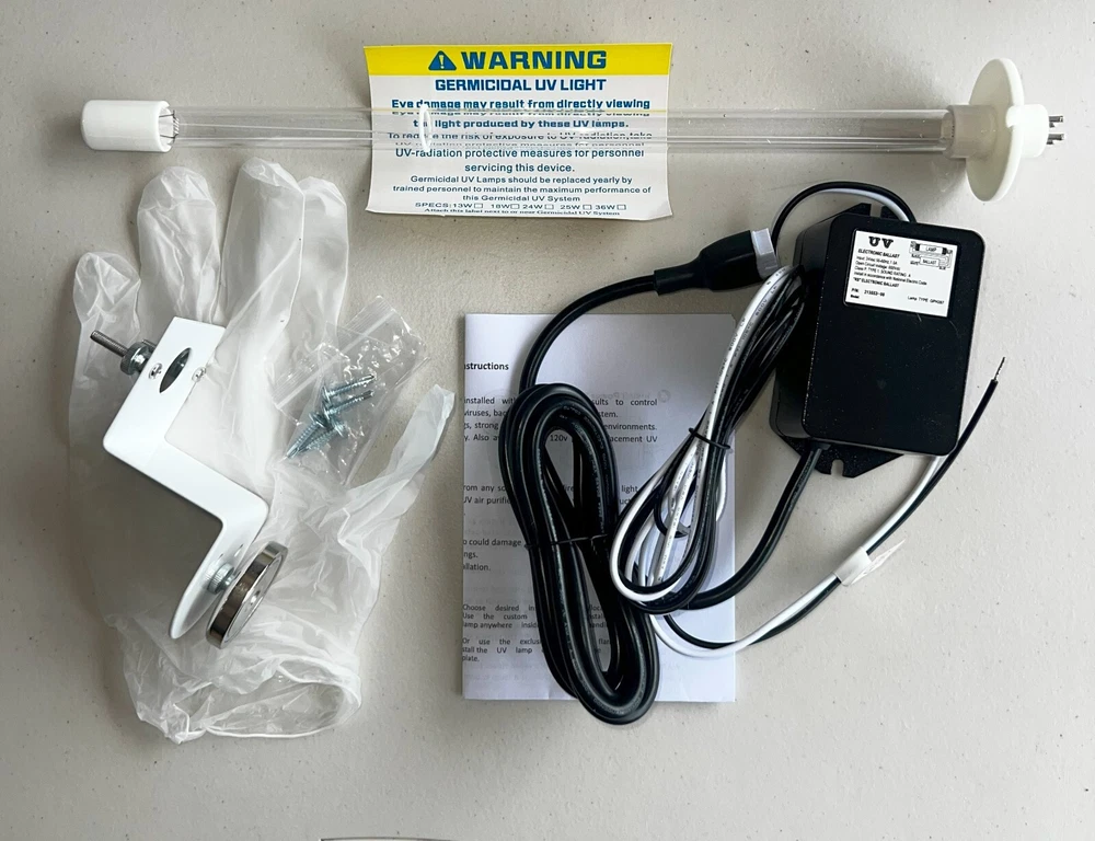 24V VOLTS POWER INPUT -Power supply! (needs to be hard wired to 24v transformer) 14" Uv light germicidal bulb Magnetic bracket for easy installation The most popular Germicidal UV Light system in the world because of its reliability, ease of installation, innovative features, and quality components Powerful UV-C light kills germs continuously in the air and on surfaces inside the air system Clean coils save energy and extend the life of air system Ozone Free!