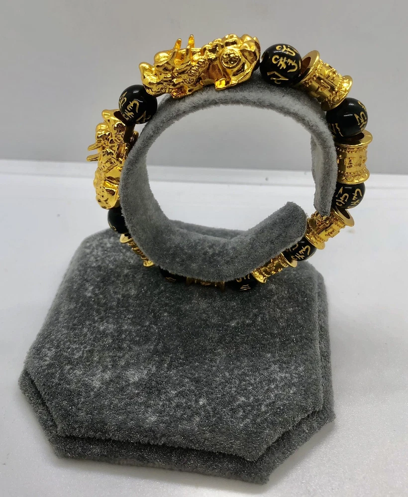 Beautiful Handcrafted Pixiu Dragon Bracelet Worn for thousands of years for protection from evil, to attract wealth, protect good health and create prosperity. Uniquely crafted from 9mm Black Obsidian Beads and two 24k Gold Plated Pixiu Dragons on an elastic stretch bracelet. 30 Grams Comes in a velvet presentation pouch. FAST SHIPPING 💨