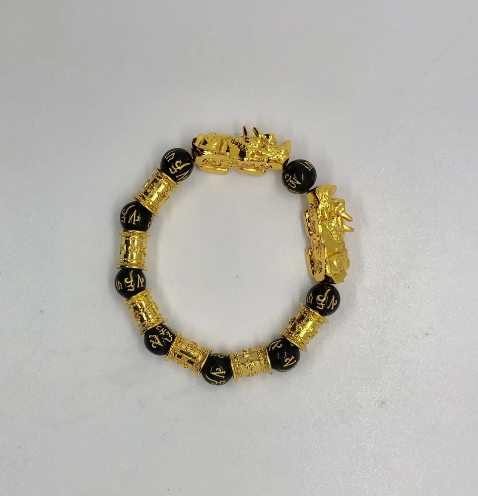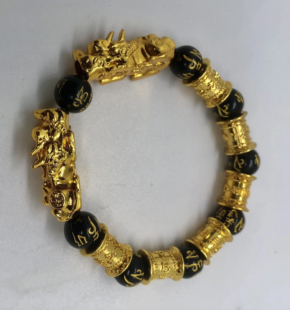 Style: Chinese Good Fortune, Beaded Cut Grade: Good Brand: Unbranded Shape: Round Theme: Luck Type: Bracelet Material: Wood & Gold Plated Steel, Black Obsidian Color: Black & Gold