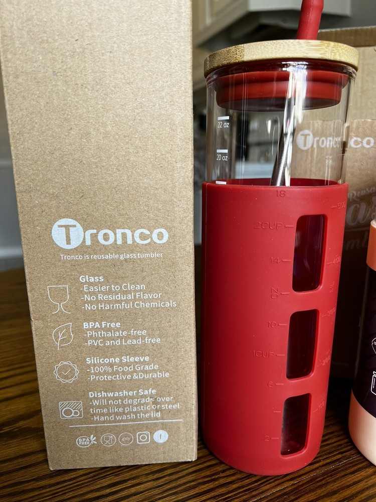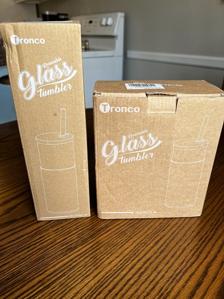 Set Of 3!!! NEW Tronco Glass Tumbler Bottle Straw Silicone 1- 24oz , & 2- 20 Oz. BPA, PVC, & Lead Free. Dishwasher safe.