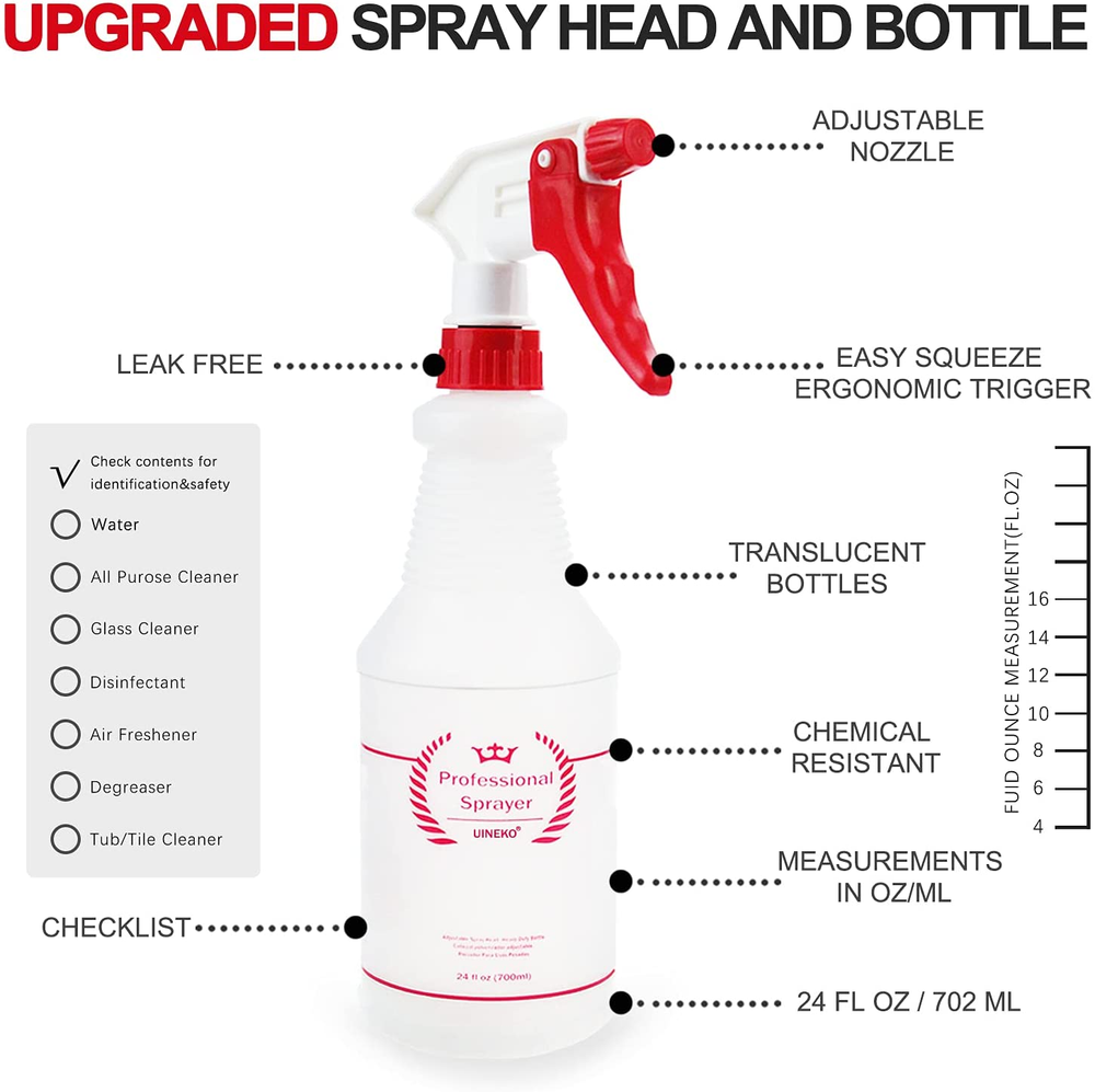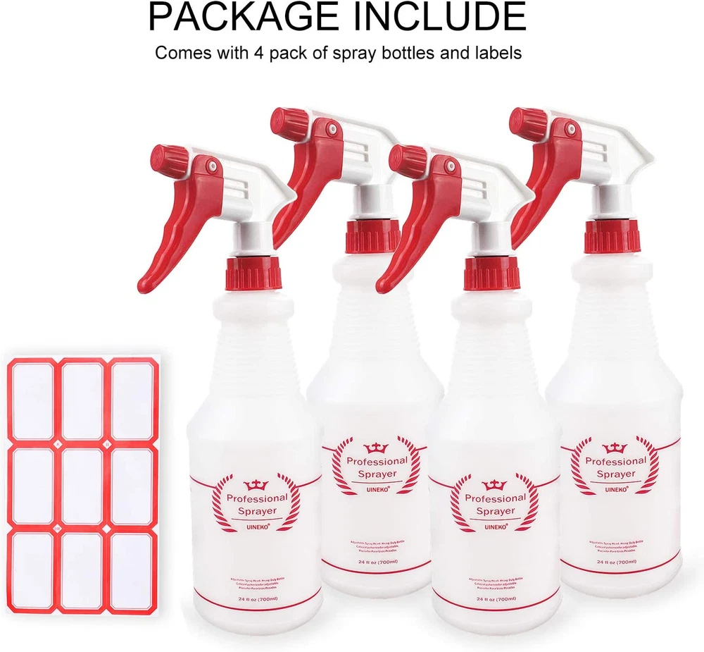 FOR YOU Plastic Spray Bottle (4 Pack, 24 Oz, All-Purpose) Heavy Duty Spraying Bottles Leak Proof Mist Empty Water Bottle for Cleaning Solution Planting Pet with Adjustable Nozzle and Measurements FEATURES ADJUSTABLE NOZZLE - From a fine mist to a solid stream, the sprayer can be easily adjusted to suit your needs. Be prepared to tackle any job with a simple twist of the nozzle! Avoid waste with our extra-long tube that'll spray every last drop out! CHEMICAL RESISTANT - The heavy duty 24 oz (about 700 ml) sprayer bottle is chemically resistant to hold up against harsh chemicals and solvents. On the side of each bottle is a checklist to stay organized and remain informed as to what the bottle contains. (Also comes with labels to meet your need) UPGRADED SPRAY HEAD & LEAK PROOF - Our sprayer features a long lasting polypropylene spray head, tight and secure cap closure, internal cap gasket, 302 stainless steel spring and a precision valve and piston, for a no clog and no leak experience; A proven and reliable no leak venting system primes quickly and stays primed. HOUSEHOLD-COMMERCIAL-INDUSTRIAL USES - Our spray bottles for multi purpose uses. Use them for cleaning solutions around the house, bleach spray, pet / cat / dog training, lawn and garden, misting and watering plants, succulents, herbs, ironing, laundry, car detailing, janitorial. Make your own homemade diy cleaner mister or just use with water to cool yourself. BETTER TRIGGER DESIGN - The unique design 4-finger trigger makes your fingers rest easily on it and the bottle fit comfortably in your hand, eliminating hand fatigue; Adjustable red nozzle turns easily letting you switch from mist, stream or to off; Pull trigger has a short effortless squeeze reducing finger fatigue. Product Description This essential set of four, 24oz spray bottles is fantastic for both home and commercial use. The adjustable spray nozzle coupled with the original 100% no-leak mechanism will set off your cleaning or gardening tasks to a perfect start. Buy economy sized liquid cleaning products in bulk for less and decant the contents into these trusty home use bottles. The 24 ounce capacity plastic bottle is perfect for all natural household looking to create their own cleaning recipes for a healthier home. Try a homemade drain cleaner or air freshener, dusting spray or furniture polish! Keeping a few labeled bottles handy around the house enabling you to use for DIY cleaners to clean windows, mist plants, or spritz over bread dough before baking… whatever it is you decide to fill these bottles with, you are sure to get hooked! Our professional spray bottles is extremely sturdy and comes with the following 5 unique features: Adjustable Nozzle 24oz Perfect Size Chemical Resistant Unique Design 4-Finger Trigger Measurements ADJUSTABLE NOZZLE Easily adjust between 3 trigger settings including mist, stream and off by simply turning the nozzle. CHEMICAL RESISTANT Sturdy material makes sure that the bottle doesn’t deteriorate due to chemical exposure or harsh substances. DESIGN FOR COMFORTABLE WORKING 24oz great size, not too big and can hold enough liquid; 4 finger sprayer for a better grip HOUSEHOLD/COMMERCIAL/INDUSTRIAL USES Our multi purpose spray bottles can be used for cleaning solutions, grooming, planting and more. PACKAGE INCLUDE 4 * Plastic Spray Bottles 1 * Label (with 9 labels) Note: If the liquid contains powder, it may cause the nozzle or the tube to become clogged, so it is recommended to shake the liquid fully evenly before use. Ensure the cap is screwed on tightly. The bottles are resistant to leaking, but it's best to avoid leaving them on their sides when not in use. Item model number UKHK002-USAS1 Capacity 700 Milliliters Number of Items 4 Country of Origin China Theme household and gardening Batteries Included? No Unit Count 4.0 Count Batteries Required? No Product Dimensions 2.36"W x 4.72"H Material Polyethylene Terephthalate (PET) Plastic Is Discontinued By Manufacturer No Included Components funnel Reusability Reusable Item Package Quantity 1 Item Weight 0.01 ounces Manufacturer Airbee Special Features Adjustable,Sturdy Special Feature Adjustable,Sturdy Part Number UKHK002-USAS1 Color Red Shape cylindrical Material Type Free All Other Materials Free Brand Uineko Product Care Instructions Hand Wash Only Size 24 Oz, 4 Pack 4.72 "h x 2.36 "h. Weight: 0.01 oz PAYMENT We accept all payments via Ebay using Credit Cards , PAYPAL , Apple Pay and many others SHIPPING We are always working hard to ensure your package arrives as soon as possible. Please understand that some factors like weather, high postal traffic, and the performance of shipping companies are outside of our control. DELIVERY & RETURN POLICY We offer a 30-Day Return Policy on items in which you are not completely satisfied with. You have the option of a full-refund or an exchange of the item. No returns are available on items shipped outside of the USA.