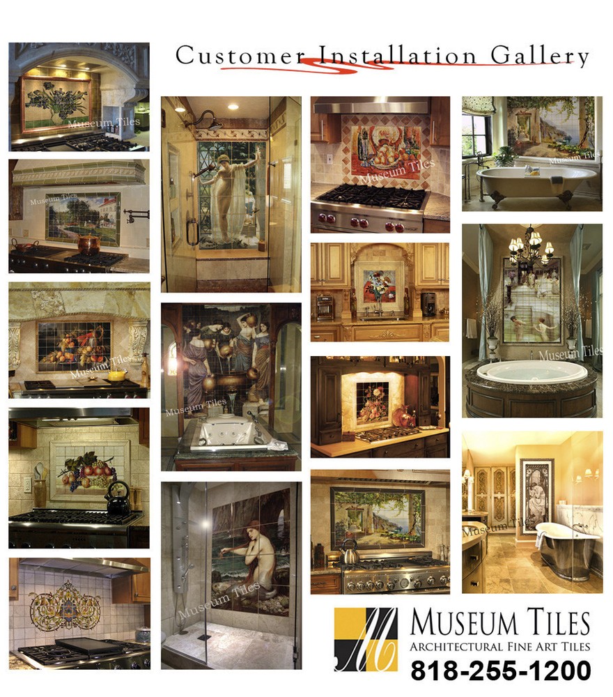 Untitled Document Absinthe Robette Advertisement Inspired by Privat Livemont, (1861-1928) Shown on 4” x 4” x 3/8” Tumbled Marble Tile CAT #2006-2432 We can also produce custom sizes on 4x4, 6x6 and 12x12 tiles Our murals are produced from the actual paintings, NOT POSTERS, PRINTS OR MAGAZINES No unsightly half-tone dots or Moire Pattern because they are 1st generation reproduction No maintenance, easy to clean and able to withstand most household cleaning chemicals We have been manufacturing tile murals for over 15 years Our murals retail between $12.50 to $15.00 per 4x4 tile in most high end Tile Stores Proudly Made in the U.S.A. Ship within 48 hours Worldwide OUR MANUFACTURING PROCESS: Unlike other tile murals that you've seen on the market, ours began with the high resolution digital file captured from the original museum masterpiece and replica paintings created by experienced professional artists. These paintings were captured using our 108 megapixel BetterLight Digital scanback with asymmetrical lighting technique. Traditional large format museum transparencies were digitized with high end 11,000 ppi drum scanner. There are no unsightly half-tone and moire pattern in our murals because they are derived from the actual paintings and not posters or magazine prints. In addition, we cut, honed and tumbled our tiles in-house to ensure quality and consistency. Our process represents years of research and experimentation to fully captures the exquisite color, shadows and every stroke of the artist’s brush. The embedded colors used in our murals are UV resistant and chemically stable. Our patented primer and sealer contain both ultraviolet light absorbers (UVLA) and hindered amine light stabilizers (HALS) for the maximum in UV light protection plus prevention of premature surface fading. The surface of our murals is extremely durable and can withstand most household cleaning chemicals and scrubbing pads. OUR POLICIES: REASONABLE EXPECTATION: Although consistency is our priority, we have no complete control over the variation in natural materials such as tumbled marble. The veins, chipped, grooves texture and shade of the marble tiles shown in our listing and catalog may vary from the actual production piece. We have shown the color and character of the products in the above images as accurately as possible. However due to the inherent nature of the photographic and computer monitor viewing process, there may be some variation in the colors of the actual product. All sizes and dimensions listed in are nominal. INSPECTION & RETURNS: Each tile is numbered and the order is shipped with installation instruction and a schematic.Please inspect your tiles immediately upon delivery. In the unlikely event that they have been damaged during shipping, a damaged freight claim must be filed within 48 hours of delivery. The customer or customer’s representative should inspect the tile before installation. WARRANTY: Museum Tiles™ guarantees that our products will meet or exceed the performance specifications listed. We combine a dedication to quality assurance standards and state-of-the-art technology production facilities to ensure product reliability. Defective units will be replaced,provided that proper notice is given and that the defect is acknowledged prior to installation.The painted surface of our tile mural is guaranteed for five (5) years against peeling, blistering, or flaking. Our guarantee does not cover scratching resulting from improper handling and cleaning or from normal wear and tear. Museum Tiles™ Mural products are suitable for indoor applications only. Please contact us for further warranty information.
