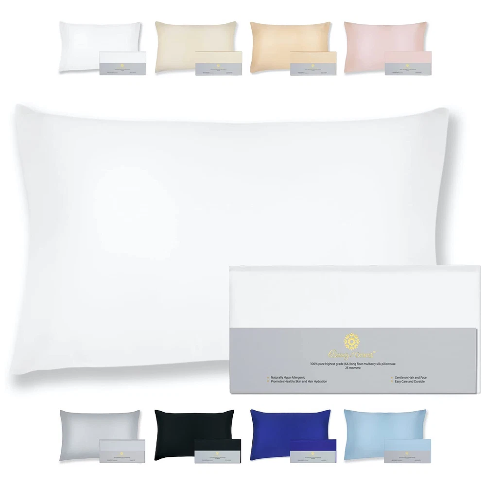 We want you and your loved ones to experience the quality and difference of Silk Pillowcases, so we have preferred pricing during our launch as we know their are many options. Take advantage to see and feel for yourself. Our family has a long history in the City of Silk, Suzhou (pronounced "Soo+Joh"). With over 2,500 years as a city. Suzhou was the center of silk production for many dynasties. Most of the high-grade material, especially for the royal families, came out of Suzhou. Our goal at ™ is simple, to share with you and others to enjoy the same high quality silk we grew up to love at a good value. ™ silk pillowcases are made using only the highest grade 6A long strand 100% pure real mulberry silk. A known beauty secret in the Orient for health, hair, and skin for thousands of years, Silk was exclusive to royalty for a long time. We hope you feel like royalty, as you wake up to a better nights sleep with your ™ silk pillowcase. BEST CARE INSTRUCTIONS:Dry Clean (no trichloroethylene) ACCEPTABLE CARE INSTRUCTIONS:WASHING:Hand Wash - Lukewarm Water 30C/86F Machine Wash - Gentlest/Shortest CycleMachine Wash in Mesh BagNo BleachPH Neutral / Mild Detergent DRYING:No Tumble DryRoll in Towel to Extract WaterHang Dry in Shade - Avoid Direct SunlightIron Inside Out Slightly Damp - Cool SettingDon't Wring DryTIPS:Avoid or Minimize Heat Exposure Don't over soak during wash and rinseSeparate your colorsAdd a capful of distilled white vinegar to final rinse to help retain color and silk from stiffening Other ™ luxury silk bedding products coming soon: silk kimonos, silk pillowcase 2 pack, silk pillow shams, silk sheets, silk eye masks, silk pajamas, silk body pillow covers. HANDCRAFTED LUXURY: 25 Momme mulberry silk pillow cases are meticulously handcrafted for superior quality and durability. Featuring hidden zippered closures, these pillowcases stay perfectly in place for a luxurious sleep experience. PREMIUM SILK QUALITY: Our pillowcases are made from the highest grade 6A long fiber mulberry silk pillow cases, offering 30% more silk than 19 Momme options. Free from harmful dyes and chemicals, these pure silk pillow cases ensure natural, restful sleep. BEAUTY BENEFITS: Our silk pillow cases for hair and face are enriched with 18 amino acids that nourish your skin and hair. Reduce wrinkles, acne, and hair damage while maintaining curls and preventing breakage. Wake up with healthier skin and hair every day. HYPOALLERGENIC & COOL: Naturally hypoallergenic, our 100% silk pillow cases king size promote better breathing and sleep, especially for allergy sufferers. Silk’s temperature-regulating properties keep you cool in summer and warm in winter for comfortable, year-round sleep. ELEGANT STYLE: Available in eight stunning colors and three sizes (STANDARD, QUEEN, KING), our silk pillow covers add a touch of elegance to any bedroom. Choose the perfect match for your bedding and elevate your sleep space with style.