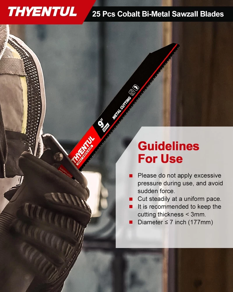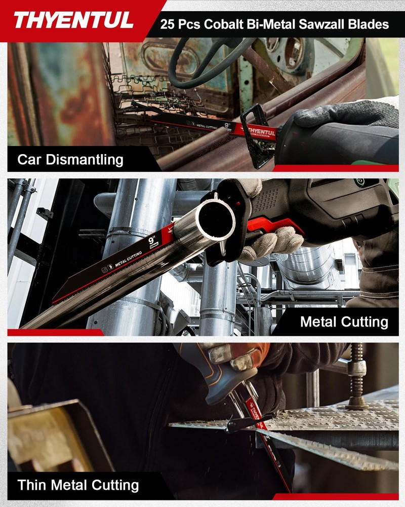 THYENTUL 25-Pack of 9-inch 14/18TPI Reciprocating Saw Blades for Metal Cutting; packaged in a box of 25 with UV new technology coating, convenient plastic box for easy access. 【Product Specifications】 25-Pack of 9-inch 14/18TPI Reciprocating Saw Blades for Metal Cutting;Blade thickness 0.037 in, packaged in a box of 25 with UV new technology coating, convenient plastic box for easy access. 【Premium Materials】 Tailored for real-world scenarios, the 25-piece reciprocating saw blades feature M42 metal with 8% cobalt for the teeth and D6A metal for the blade body. This robust combination not only delivers outstanding performance but also offers a higher cost-effectiveness,A good replacement for Diablo and Milwaukee saw blades 【Versatile Applications】 Ideal for cutting medium-thick metal sheets ranging from 0.1 to 0.125 inches (3 millimeters), these reciprocating saw blades are suitable for cutting steel, pipes, vehicle bodies, stainless steel, cast iron,stud,nails, and water pipes,A must-have tool for various cutting needs. 【Extending Service Life】 Incorporating a new heat treatment process significantly enhances wear resistance and heat resistance, minimizing the likelihood of sudden breakage during usage,This improvement contributes to extending the lifespan of the blade. 【Universal Shank】 The 1/2-inch shank is compatible with mainstream Sawzall tools on the market, including Dewalt, Bosch, Milwaukee, Makita, Black & Decker, Ryobi, and more.