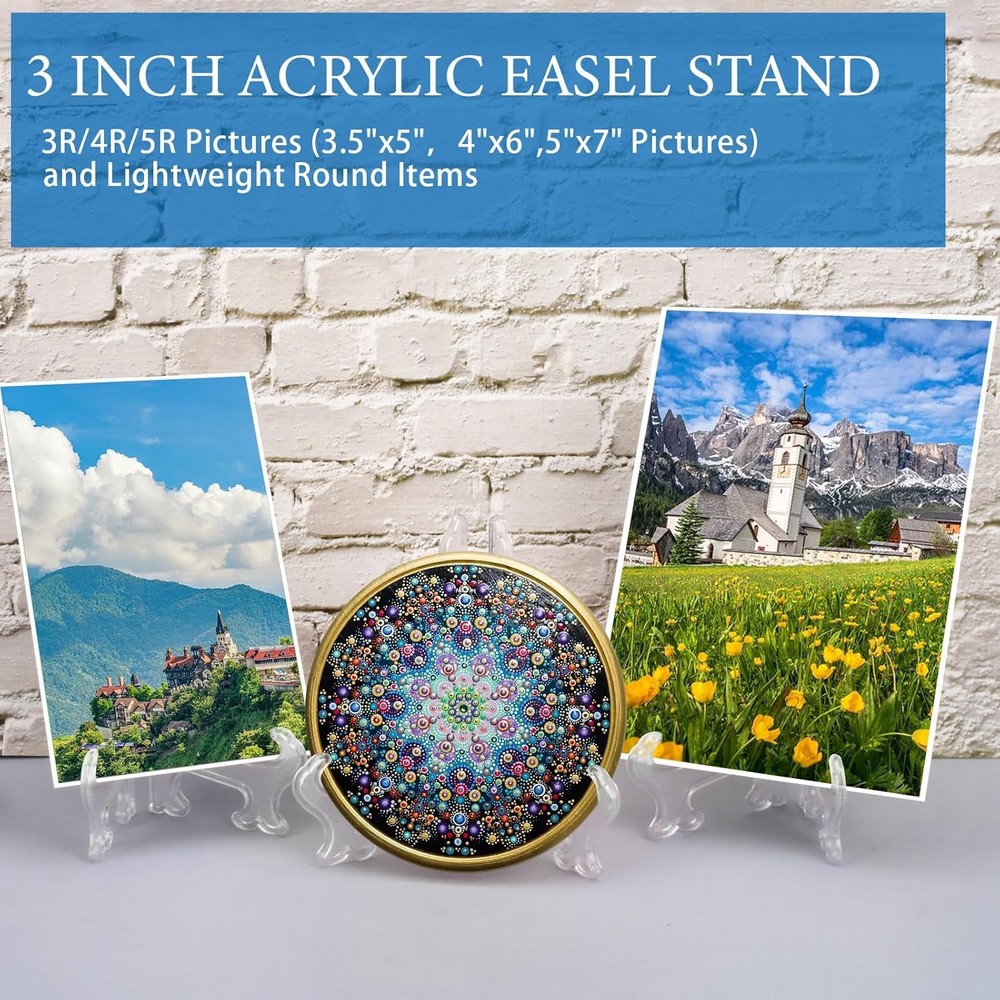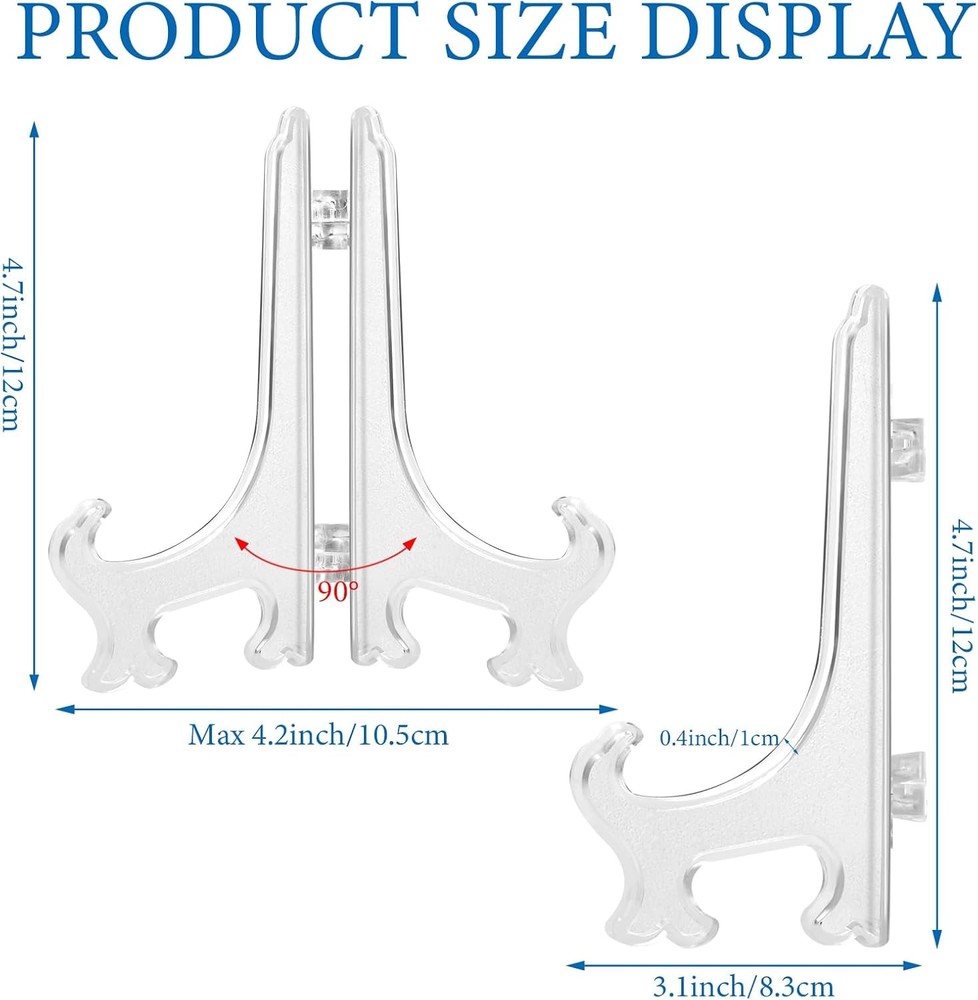 25 Pack Acrylic Easel Stand 3 Inch Clear Plastic Easels Plate Holders clear Product Details Assembly Required: No Number of Levels: 1 Manufacturer: AccEncyc Product Dimensions: 0.3 x 2.1 x 3 inches Item Weight: 3.84 ounces Item model number: AEAES25P Batteries required: No Color: clear Material: 3Inch 25Pcs Brand: AccEncyc Item dimensions L x W x H: 0.3 x 2.1 x 3 inches Base Type: Pedestal Adjustable Display Stand: These clear acrylic easel stands with hinged design are foldable to adjust the width as well as folded for easy storage. The folding display stand holder is mini and reusable, holding products stably. Clear Plastic Easels Stand: These acrylic easel stands with gracefully curve are transparent, cute & Invisible, hard to be noticed. Disappear into the background and don't affect your entire frame visual experience. The mini easels can hold items stably. Reliable Design: The acrylic card stands are hinged, 3 inch tall. Made of clear plastic, durable and stable, no need to worry about them tipping over, showing your collections in perfect viewing angle, ideal gift for collectibles lovers of all kinds. Great for Table Settings: The mini display easels are suitable for dessert table as cookie display stand, or table settings to hold small collections, table decorations, table numbers, name cards for assigned seats, etc. 3 Inch Display Easels: 25pcs easels stand holders to show photos, artwork, sports cards, trading cards, collectibles, baseball cards, coins shells, belt buckle, CDs, small plaques, placecards at weddings, home decoration, birthdays, tables. Features: The mini easel stands can better organize your decorations and souvenirs and help you save more desk space, useful and practical, nice gifts for your classmates, families, roommates and friend, which will show your selection taste. You can put the acrylic easel holders on most flat surface including dining table, desk, office desk, counter, shelf, bedside table, TV table and more for trade show display, home display and office display. Specifications: Material: acrylic Color: clear Size: 3 inch Package includes: 25 x Acrylic easel holder