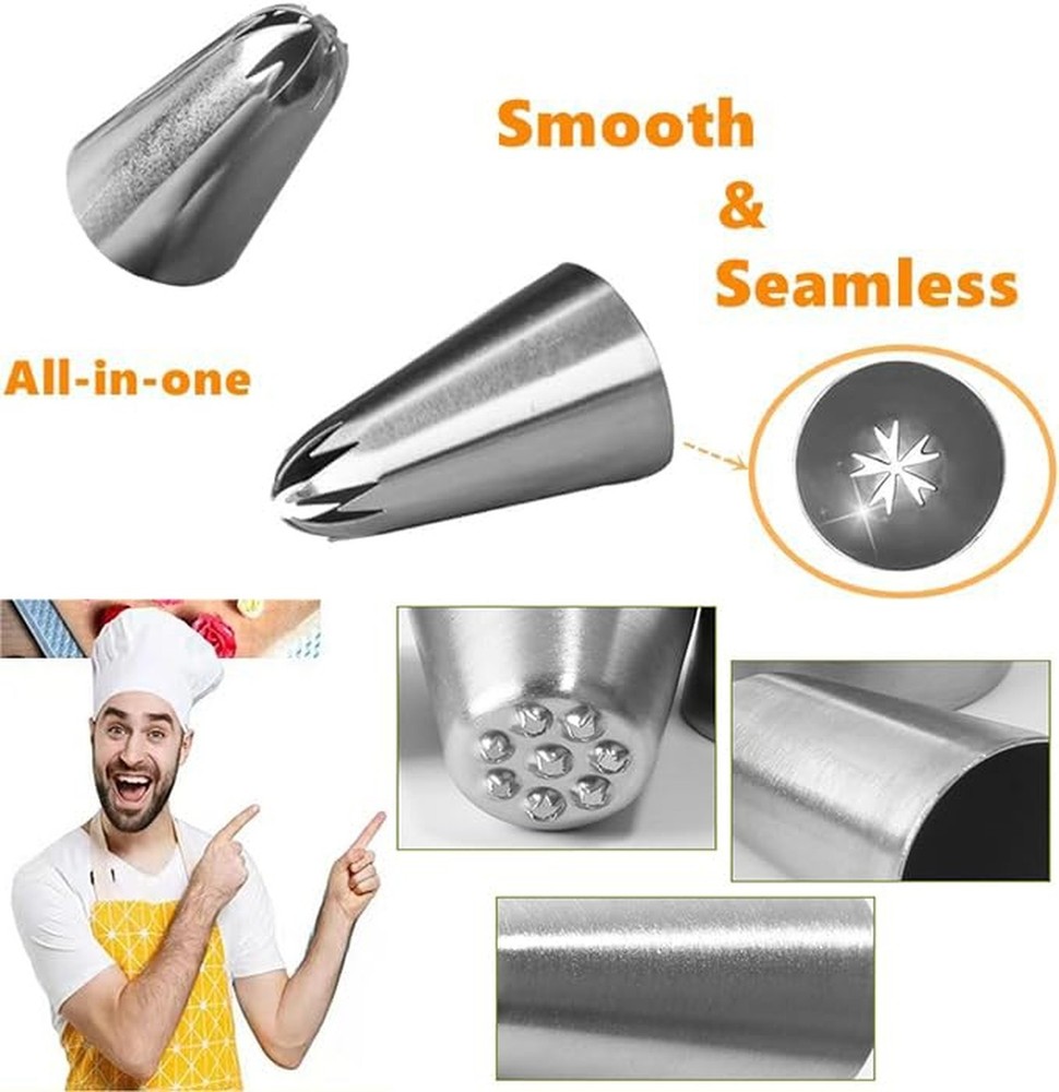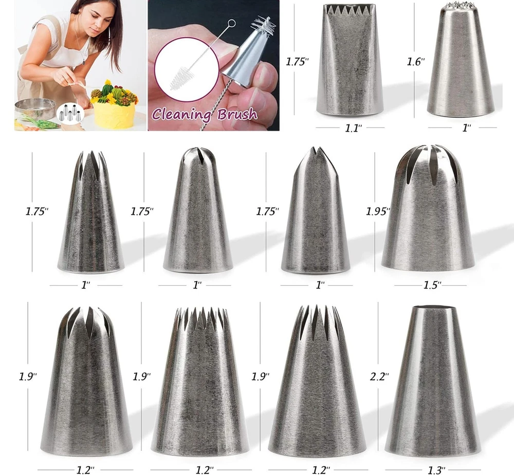 25 Pcs Extra Large Piping Tip Set, Stainless Steel Frosting Piping Kit,Pastry Cake Decorating Tips Baking Tools For Cookies Cupcake Decorating Kit (902 234 113 1M 190 D63 1D 9FT 1C R16L) Product Details Color: Large Piping Tips Set Brand: MDLJG MPN: 1 UPC: Does not apply EAN: Does not apply Brand: MDLJG Material: Stainless Steel Color: Large Piping Tips Set Number of Pieces: 25 Opening Shape: Flower Package Dimensions: 5.39 x 3.58 x 1.46 inches Item Weight: 11.7 ounces Manufacturer: MDLJG Country of Origin: China Item model number: 1 Date First Available: March 26, 2024 THE CAKE DECORATION KIT INCLUDES: Includes 10 XL frosting nozzles and 10 icing pastry bags,round plain tip, open star, closed star, French star, drop flower, rosettes flower, grass icing tip, leaf icing tip and basket weave decorating tip plus 1 cleaning brush,4Pastry Bag Ties, Large Piping Nozzles is bigger than other, more convenient to use(25PCS) USE & CARE: Simply position the tip into the bag and snip the bottom to fit. Dishwasher safe; However, for perfect decorating results, wash in warm, soapy water before first and after each use;rinse and dry PROFESSIONAL CAKE DECORATING TOOLS: Perfect tools to decorate all your desserts, cakes, cupcakes, cookies, pastry, sugar craft and more, helps you easily decorate cakes for birthdays, weddings and other events. Ideal for beginners as well as for professionals LARGE ICING TIPS: Larger than other standard cake tips, our piping nozzles set is perfect for decorating desserts, cakes, cupcakes, cookies, pastry dough, cookie dough, sugar craft, mashed potatoes, meringues, whipping cream and more EASY TO USE: Large piping nozzles can be reused. They can be used with disposable piping bags, and you can also use them with couplers. They are easy to clean and non-stick pan