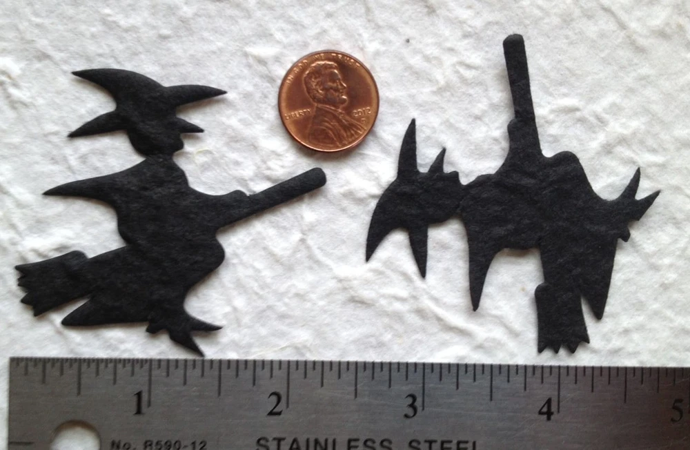 This listing is for 25 black, mulberry paper witches. They measure Width about 6 cm (2 3/8") at widest points x Height about 55mm (2¼") top of hat to toes. Add a yellow or white moon behind the witch diecut. These witches will be perfect for those spooky Halloween cards and party invitations, placecards, goodie bags, scrapbook pages, and craft projects. Powered by eBay Turbo Lister The free listing tool. List your items fast and easy and manage your active items.