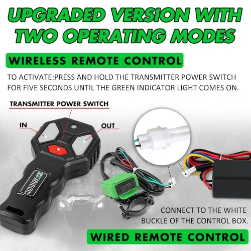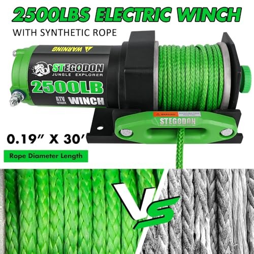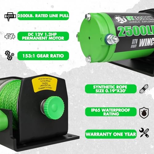 2500 lb Electric ATV UTV Winch 12V Waterproof Synthetic Rope with Wired and Wireless Remote for Off-Road Towing and Marine Use 2500 lb Electric ATV UTV Winch 12V Waterproof Synthetic Rope with Wired and Wireless Remote for Off-Road Towing and Marine Use 2500 lbs line pull powered by a 0.9 kw/1.2 hp DC 12V motor for high efficiency and reliable performance. Advanced planetary gear system with a 153:1 gear ratio ensures safe and consistent power delivery. Two operating modes: wireless remote control with a 98-foot range and manual switch for versatile operation. Includes a high-strength, low-stretch UHMWPE synthetic rope (3/16" x 30') for durability and abrasion resistance. Suitable for ATV, UTV, boat, and car recovery, making it a versatile tool for outdoor adventures. Backed by a 12-month support period, providing peace of mind during outdoor use.