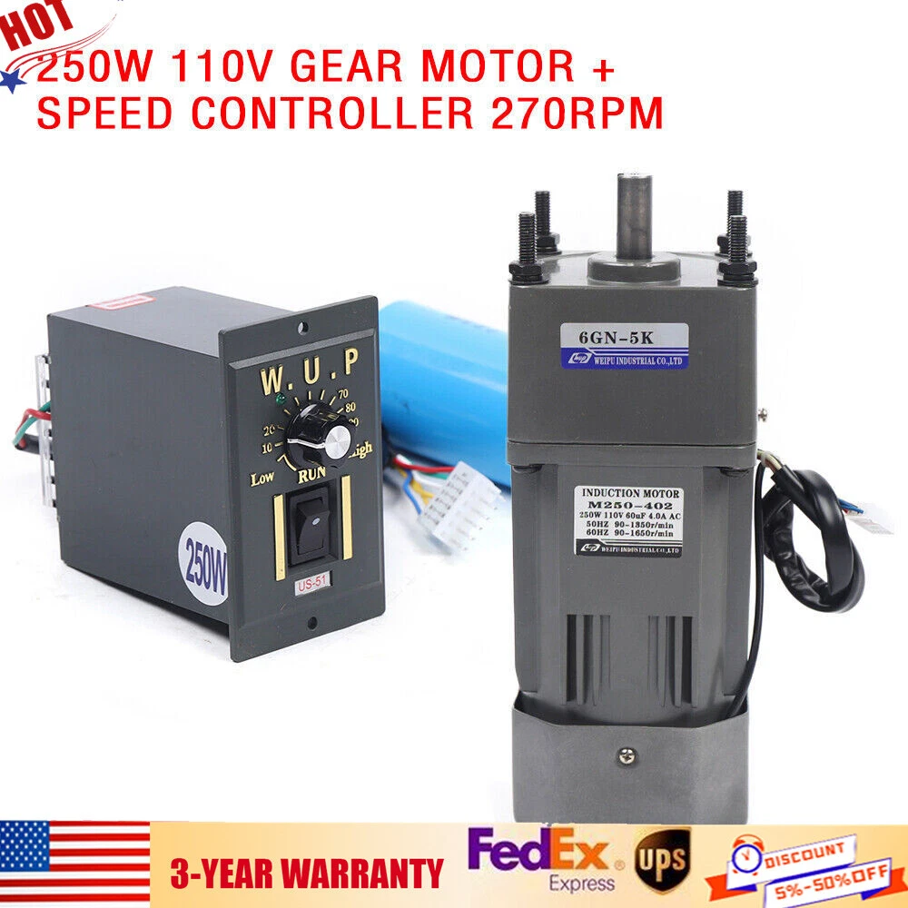 250W 110V AC Gear Reduction Motor Electric+Variable Speed Control Reversible New Description 250W AC110V gear motor electric motor variable speed controller 1:5 270RPM Specification Name: geared motor Rated voltage: AC110 V Rated speed: 270 RPM Reduction ratio: 1:5(5K) Power Phase: single-phase 250W geared motor:190mm * 104mm* 84mm Reducer size: 66mm*104mm*84mm 250W gear motor Output speed: 270~0RPM Features ♦ Flexible installation ♦ Efficient works ♦ Torque large ♦ Smooth operation ♦ Long working life Note: 1.Under different deceleration ratio, the output shaft speed is different. The output shaft speed is equal to the motor speed of 1350 rpm divided by the deceleration ratio. 2.If you want to know the detailed product size before purchase, please ask our customer service for it. Packages 1 * Gear Motor 1 * Speed controller 1 * Reducer Payment Delivery details Terms of sales About us Contact us Payment We accept ebay payment 。 Fees such as import duties, taxes are not included in the item price or shipping costs. These charges are the buyer's responsibility. Delivery details Shipping: 2-9 working days to: USA Terms of sales We maintain high standards of excellence and strive for hundred percent customer satisfaction. Feedback is very important to us. We hope that you contact us immediately before you give neutral or negative feedback, so that we can address your concerns. It is impossible to address issues if we do not know about them! About us Your satis faction is our ultimate goal. We work hard to earn your trust and future business. Our certified technicians have tested each item before shipping. The unit comes with 1 year limited warranty on all manufacturing defects. a) If you receive a defective item, you may return it or ask for a discount. Please contact us within 14 days after you receive the package. b) What you returned must be intact and in its original packaging as re? u. Customer is responsible for shipping costs of the returned item. c) We will cover the cost of shipping back t with the shipping rate indicated in the registration page. We will send you a new unit or refund the full payment you paid. Thank you. Contact us Business Hour Business Hour: Monday To Friday: 8:30 AM to 5:00 PM (Beijing China time) Due to time zones, our reply to your questions may not be immediately. But within above working time, we will reply your email within 24 hours. If it's non-workdays, please kindly be patient and wait till Monday. Please contact us with ebay message. Please feel free to contact us if you have any questions. Monday To Friday: 8:30 AM to 5:00 PM (Beijing China time) Due to time zones, our reply to your questions may not be immediately. But within above working time, we will reply your email within 24 hours. If it's non-workdays, please kindly be patient and wait till Monday. Please contact us with ebay message. Please feel free to contact us if you have any questions. Brand Unbranded Torque 8nm Reversible/Non-Reversible Reversible MPN Does Not Apply Name geared motor Rated voltage AC110 V Rated speed 270 RPM Reduction ratio 1:5(5K) Power Phase single-phase 250W geared motor 190mm * 104mm* 84mm Reducer size 66mm*104mm*84mm 250W gear motor Output speed 270~0RPM Country/Region of Manufacture Unknown Current Type AC Base RPM 270