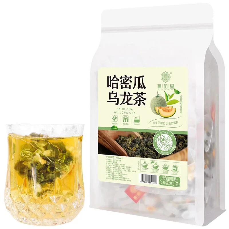 Product name: Melon Oolong Specification: 250g/bag (25 small bags) Ingredients: rock sugar, Oolong, Hami melon dried Shelf life: 18 months Storage: Store in a cool and dry place This product adopts a triangular tea bag design, which can prevent tea ingredients from entering the mouth when drinking. Independent small bags are more convenient. All raw materials are of good quality and scientifically proportioned