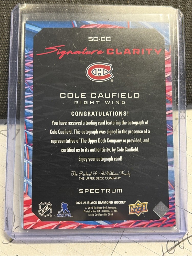 The product is a highly sought-after trading card featuring Black Diamond Signature Clarity Auto Spectrum of ice hockey player Cole Caufield from the Montreal Canadiens. As a rookie card, it holds significant value for collectors and fans of the sport. With only 4 out of 5 cards in this specific SSP variation, it is a rare and desirable addition to any sports trading card collection. The high-quality printing and unique design make it a standout piece for enthusiasts of the sport and avid collectors alike.