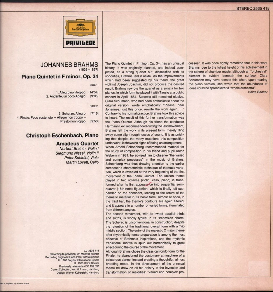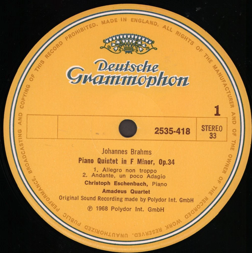 GRADING Our Grading System The table below is an overview of how our grading system works. The first grade is for the sleeve and second grade is for the media/disc, e.g. VG+/EX means that the item's sleeve is in Very Good Plus condition and the media/disc is in Excellent condition. If there is only one condition, e.g. /EX, it means that the item is not in a picture sleeve and that the media/disc is in excellent condition. Records that aren't in picture sleeves will either be in a company sleeve or a generic plain sleeve. If you have any questions, please get in touch. Condition Sleeve Media MINT (10/10) Mint, perfect Mint, perfect EX+ (9/10) Excellent plus, near mint Excellent plus, near perfect EX (8/10) Excellent, well looked after, clean, only slight signs of use Excellent, well looked after, clean, only slight signs of use EX- (7/10) Excellent minus, light wear and signs of use Excellent minus, light wear and signs of use VG+ (6/10) Very good plus, some moderate wear Very good plus, some scuffs, no deep marks VG (5/10) Very good, well used and worn Very good, well used and marked VG- (4/10) Very good minus, very worn Very good minus, very worn and marked GOOD (3/10) Good, some major wear Good, some major wear and scuffing FAIR (2/10) Fair, major wear Fair, major wear and scuffing POOR (1/10) Poor, severe wear Poor, severe wear and scuffing DELIVERY Combined Postage If you add all the items you wish to purchase from us to your shopping basket/cart, and then go to the checkout page from the shopping basket page, the shipping cost will be automatically combined. Packaging All of our items are parcelled using strong specially designed packaging, each vinyl in an order is placed in a clear plastic sleeve and plain paper white sleeve, and is separated from its cover (unless it is advertised as sealed), to prevent any damage during transit. If an item is sealed, and you would prefer the vinyl to be placed outside of its sleeve before dispatch, please let us know. Prices You can see all delivery options and prices for an item on the "Postage and payments" tab. Tracked delivery If you wish to have a tracking number with your order, please select the "Signed" or "Express" delivery option, "Standard" delivery does not include a tracking number. SHOP Click here to view our Ebay shop, with over 200,000 items in stock FAQ Does a used item include the original inner sleeve/insert/poster etc.? We will always include in the description if a used item includes any additional parts, e.g. "with inner" or "includes poster", if you know an item originally came with any additional parts, such as a printed inner sleeve, and it isn't mentioned in the description, then generally the used item won't include it, but please feel free to ask. New items will always be complete, unless otherwise specified. CATEGORIES Shop Home 10" Vinyl Records 12" Vinyl Records 7" Vinyl Records Cassettes (Tape) CDs (Compact Discs) LP Vinyl Records Music Memorabilia Other Artist Christoph Eschenbach / Amadeus-Quartett Title Johannes Brahms - Piano Quintet In F Minor Format LP Vinyl Country Germany Label Deutsche Grammophon Catalogue Number 253541810 Year 1988 Description 4 track stereo - sleeve has discoloration and sticker mark on back Condition (Sleeve/Disc) VG+/EX Track List Piano Quintet In F Minor, Op.34 A1. Allegro Non Troppo (14:54) A2. Andante, Un Poco Adagio (9:05) B1. Scherzo: Allegro (7:15) B2. Finale. Poco Sostenuto - Allegro Non Troppo - Presto Non Troppo (9:53) DELIVERY INFORMATION If you wish to have a tracking number with your order, please choose the Signed or Express delivery option, the Standard delivery option does not include a tracking number. Please note, the Express option for delivery outside of the UK includes a tracking number, but has the same delivery time as the Standard option. ABOUT US Vinyl Tap has been in the business of selling music for over 30 years, and in that period we have supplied many thousands of collectors and music fans around the globe with vinyl, CDs and music memorabilia. You can check out the over 200,000 items that we have in stock on our Ebay shop, here . Artist: Christoph Eschenbach / Amadeus-Quartett - Title: Johannes Brahms - Piano Quintet In F Minor - Format: LP Vinyl - Country: Germany - Label: Deutsche Grammophon - Catalogue Number: 253541810 - Year: 1988 - Description: 4 track stereo - sleeve has discoloration and sticker mark on back