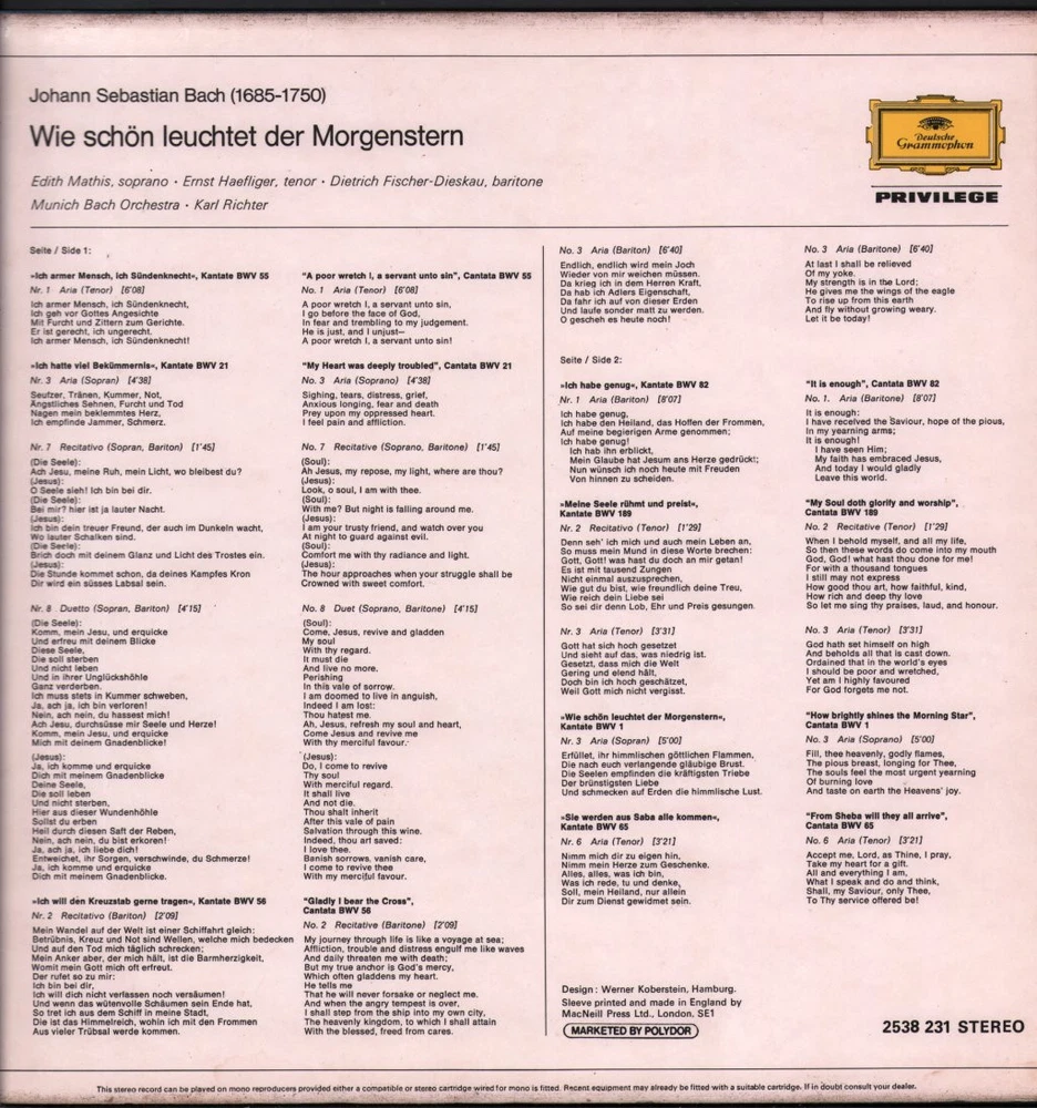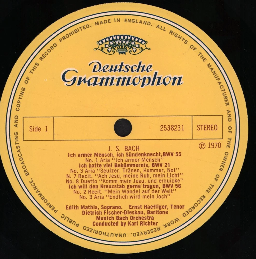 GRADING Our Grading System The table below is an overview of how our grading system works. The first grade is for the sleeve and second grade is for the media/disc, e.g. VG+/EX means that the item's sleeve is in Very Good Plus condition and the media/disc is in Excellent condition. If there is only one condition, e.g. /EX, it means that the item is not in a picture sleeve and that the media/disc is in excellent condition. Records that aren't in picture sleeves will either be in a company sleeve or a generic plain sleeve. If you have any questions, please get in touch. Condition Sleeve Media MINT (10/10) Mint, perfect Mint, perfect EX+ (9/10) Excellent plus, near mint Excellent plus, near perfect EX (8/10) Excellent, well looked after, clean, only slight signs of use Excellent, well looked after, clean, only slight signs of use EX- (7/10) Excellent minus, light wear and signs of use Excellent minus, light wear and signs of use VG+ (6/10) Very good plus, some moderate wear Very good plus, some scuffs, no deep marks VG (5/10) Very good, well used and worn Very good, well used and marked VG- (4/10) Very good minus, very worn Very good minus, very worn and marked GOOD (3/10) Good, some major wear Good, some major wear and scuffing FAIR (2/10) Fair, major wear Fair, major wear and scuffing POOR (1/10) Poor, severe wear Poor, severe wear and scuffing DELIVERY Combined Postage If you add all the items you wish to purchase from us to your shopping basket/cart, and then go to the checkout page from the shopping basket page, the shipping cost will be automatically combined. Packaging All of our items are parcelled using strong specially designed packaging, each vinyl in an order is placed in a clear plastic sleeve and plain paper white sleeve, and is separated from its cover (unless it is advertised as sealed), to prevent any damage during transit. If an item is sealed, and you would prefer the vinyl to be placed outside of its sleeve before dispatch, please let us know. Prices You can see all delivery options and prices for an item on the "Postage and payments" tab. Tracked delivery If you wish to have a tracking number with your order, please select the "Signed" or "Express" delivery option, "Standard" delivery does not include a tracking number. SHOP Click here to view our Ebay shop, with over 200,000 items in stock FAQ Does a used item include the original inner sleeve/insert/poster etc.? We will always include in the description if a used item includes any additional parts, e.g. "with inner" or "includes poster", if you know an item originally came with any additional parts, such as a printed inner sleeve, and it isn't mentioned in the description, then generally the used item won't include it, but please feel free to ask. New items will always be complete, unless otherwise specified. CATEGORIES Shop Home 10" Vinyl Records 12" Vinyl Records 7" Vinyl Records Cassettes (Tape) CDs (Compact Discs) LP Vinyl Records Music Memorabilia Other Artist Edith Mathis / Ernst Haefliger / Dietrich Fischer-Dieskau / Munchener Bach-Orchester / Karl Richter Title Bach - Wie Schön Leuchtet der Morgenstern Format LP Vinyl Country Germany Label Deutsche Grammophon Catalogue Number 2538231 Year 1970 Description Privilege issue 2 track stereo Condition (Sleeve/Disc) VG+/VG+ Track List 1. Ich armer Mensch, Ich Sündenknecht - Kantate BWV 55 (6:08) 2. Ich hatte viel Bekümmernis - Kantate BWV 21 (4:38) DELIVERY INFORMATION If you wish to have a tracking number with your order, please choose the Signed or Express delivery option, the Standard delivery option does not include a tracking number. Please note, the Express option for delivery outside of the UK includes a tracking number, but has the same delivery time as the Standard option. ABOUT US Vinyl Tap has been in the business of selling music for over 30 years, and in that period we have supplied many thousands of collectors and music fans around the globe with vinyl, CDs and music memorabilia. You can check out the over 200,000 items that we have in stock on our Ebay shop, here . Artist: Edith Mathis / Ernst Haefliger / Dietrich Fischer-Dieskau / Munchener Bach-Orchester / Karl Richter - Title: Bach - Wie Schön Leuchtet der Morgenstern - Format: LP Vinyl - Country: Germany - Label: Deutsche Grammophon - Catalogue Number: 2538231 - Year: 1970 - Description: Privilege issue 2 track stereo