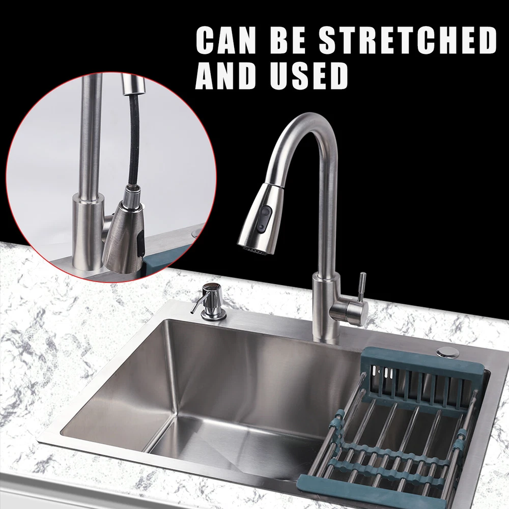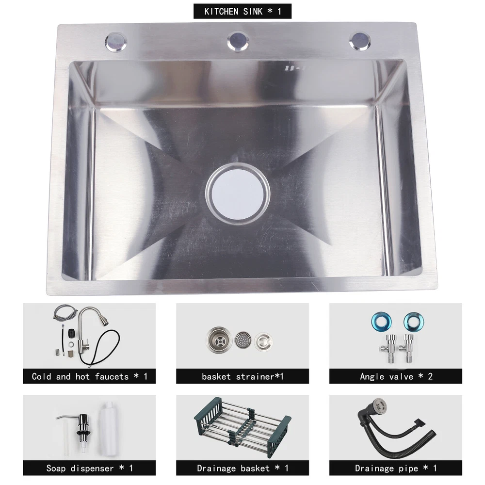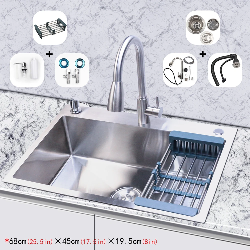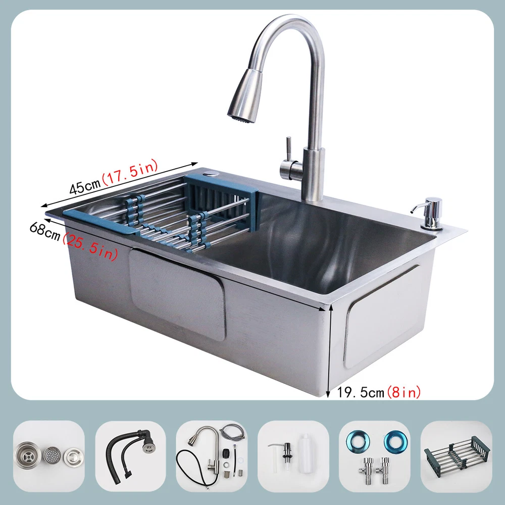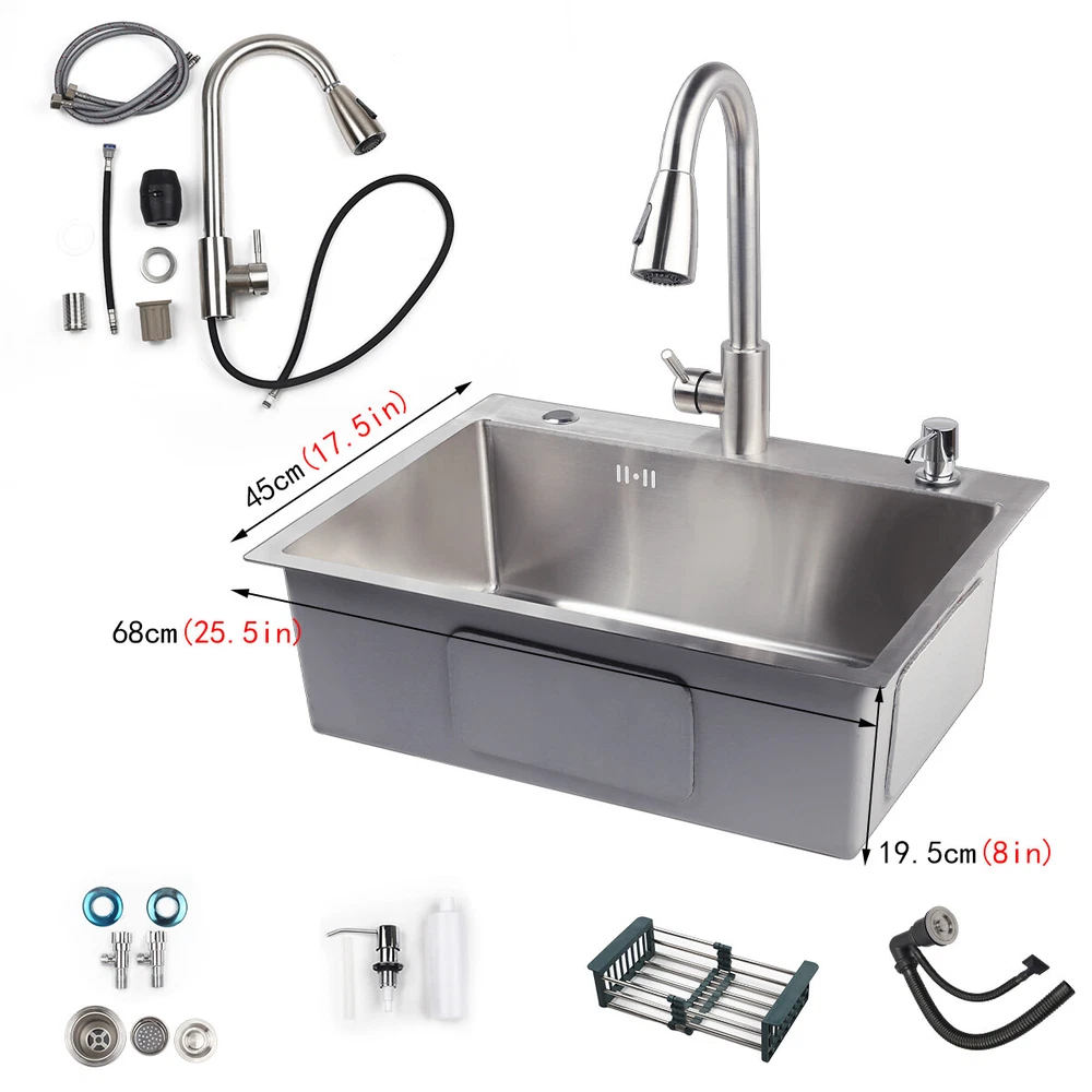 25.5in Top Mount Kitchen Sink Drop in 304 Stainless Steel Single Bowel with Drain ( With drawable cold and warm faucets and a complete set of accessories ) 【 Retractable Faucet 】 - Purchase our sink and give away a retractable faucet, which is unparalleled. Both cold and warm water can be used, and the retractable design is convenient for users to clean any part of the sink without any blind spots. 【DEEP SINGLE BOWL】 - This workstation sink is 8in deep to fit those big pots/pans/cookie sheets, it hides the dirty dishes waiting to go into the dishwasher from view. Feel free to invite friends to dinner at home, it can help you a lot. It's also a great upgradation for your RV/home kitchen sink 【PREMIUM MATERIAL】 - Crafted from 304 stainless steel, our stainless sink will stand up to the wear and tear and provide lasting durability. It has a thick gray sound deadening pad on entire underside of sink to minimize excess noise and prevent moisture accumulation 【INGENIOUS DETAILS】 - Features R10° rounded corners for easy cleanup and modern aesthetic. Sloped bottom with 4 grooves ensures optimal water drainage. Stainless steel bottom checkerboard sink rack with rubber feet prevents scratching and it comes with an actual kitchen sink drain strainer insert with deep basket (faucet included) 【EXTERIOR DIMENSIONS】 - Outside dimensions: 25.5"W x 17.5" D | Interior dimensions: 25"W x 13.5"D x 8"H | Standard 3.5" drain openings will fit any garbage disposal unit in US. Remember to make your opening size slightly larger than the inner size of the sink Included Components: 25.5in Kitchen Sink * 1 Drainage pipe kit * 1 set One water filter basket Cold+warm withdrawable faucet * 1 set Angle valve * 2 pieces Soap dispenser * 1 set Warranty 1.If your item has been damaged in transit or becomes faulty during the warranty period, please email us with pictures or video to show the problem. 2.Please check everything carefully after you receive the parcel, as any damages except DOA (Dead-On-Arrival) are not covered if it's the fault of the consumer. 3.Please submit all enquires via the “Ask a Question” tab, located at the bottom of this page. 4.If your question cannot be answered, please send us a message and we will reply within 12 hours during business days, and within 72 hours during weekends. 5.Replies will go to your registered eBay account. We are happy to resolve any issue, so please contact us before leaving feedback. On Oct 14, 2024 at 03:46:28 PDT, seller added the following information: On Nov 4, 2024 at 04:06:35 PST, seller added the following information: