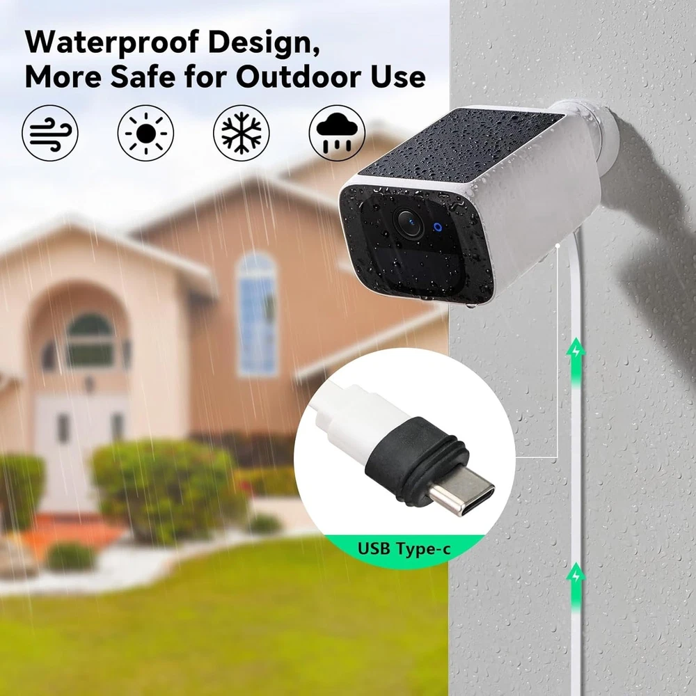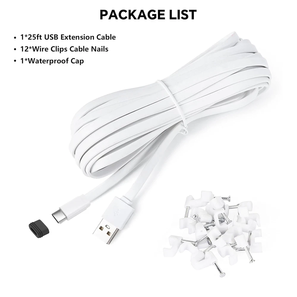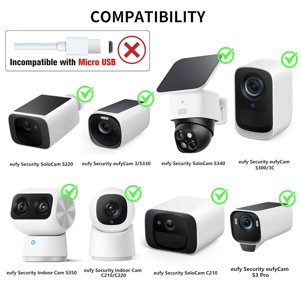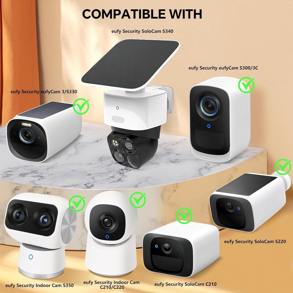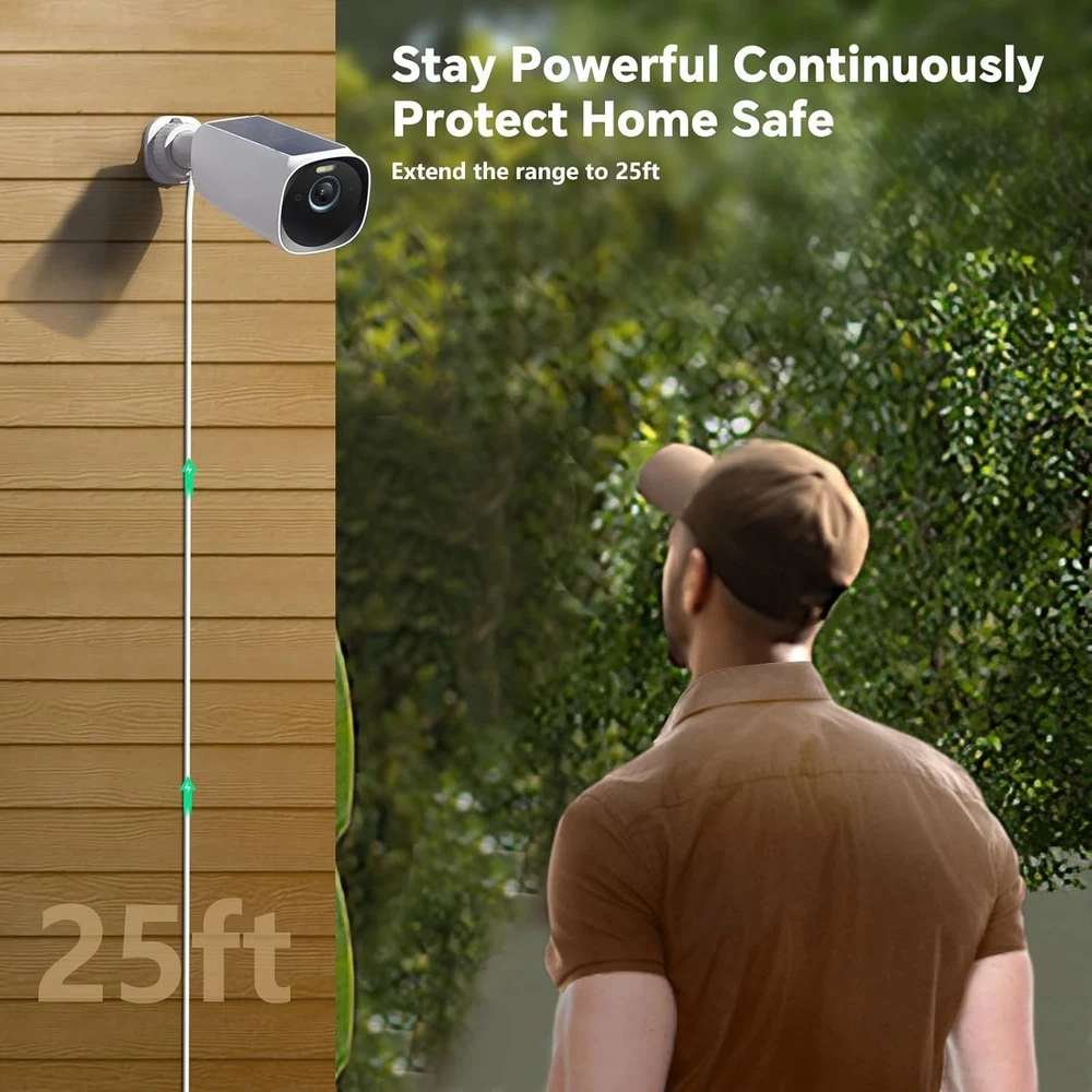 【Compatibility】 Compatible with eufy Security SoloCam S220, C210, eufy Security eufyCam 3/S330, eufy Security eufyCam 3C/S300, eufy Security Indoor Cam S350,C220/C210. (Note: All Camera NOT included) 【25ft/7.5m Flat Cable】Effortlessly run this cable through windows or doors, ensuring a hassle-free setup for eufy security camera. 【Easy to install】Simply connect the original adapter to charge and power your indoor security camera. 【More Safe for Outdoor Use】Designed with a waterproof silicone cap, this cable offers improved waterproof performance, making it perfect for outdoor use. Your devices will remain safe and powered even in challenging weather conditions. 【Charging More Faster】Constructed with bold copper material to support fast currents, our extension cable ensures long-lasting durability. It features multiple safeguards, including over-current, over-heating, over-voltage, and short-circuit protection, ensuring safe and reliable charging at all time.