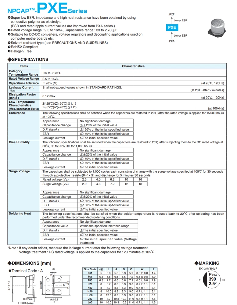 Store Seller Profile Feedbacks Contact Capacitors Aluminum Electrolytic Capacitors Aluminum Electrolytic Capactiors - SMD-SMT close APXE6R3ARA221MF61G Chemi-Con 220uF 6.3V 6.3x5.8 Polymer Aluminum Capacitor SMD 2000h 105C Ready to Ship Ask a Question 30-Day Return Description Specifications Shipping & Return Policy Disclaimer Pack of 25PCS - APXE6R3ARA221MF61G Chemi-Con 220uF 6.3V 6.3x5.8 Polymer Aluminum Capacitor SMD 2000h 105C Specification Capacitance 220 µF Rated (DC) Voltage (URdc) 6.3 V Ripple Current 158 mA Positive Tolerance 20 % Size Code 2626 ESR 15 mΩ Polarity POLARIZED Negative Tolerance 20 % Mounting Feature SURFACE MOUNT Dielectric Material ALUMINUM (SOLID POLYMER) Capacitor Type ALUMINUM ELECTROLYTIC CAPACITOR Additional Feature ESR IS MEASURED AT 100KHZ-300KHZ Leakage Current 277 µA Tan Delta 0.12 Operating Temperature-Max 105 °C Operating Temperature-Min -55 °C Number of Terminals 2 Package Shape CYLINDRICAL PACKAGE Surface Mount YES Terminal Finish TIN BISMUTH Terminal Shape FLAT Diameter 6.3 mm Height 5.8 mm Length 6.6 mm Width 6.6 mm Package Description CHIP Manufacturer Chemi-Con Shipping Policy Our go-to options for small to medium items are USPS Ground Advantage and USPS Priority Mail, known for their reliable tracking and peace of mind. Smaller items might qualify for USPS First Class Mail. Contact us to discuss this option before purchasing. Note: This method is less recommended due to the potential for delays. Return Policy We offer a 30-day return policy, no questions asked. If you choose to provide a reason for the return, it will assist us in improving and fix the issue. Packaging Our items are packaged according to their needs—some in ESD bags with pins secured in protective sponge, others in foam-enclosed boxes. For larger quantities, options include broken tubes for transistors or cartons. We welcome your suggestions for packaging preferences. Sofitrek Product Disclaimer Nature of Goods: All products offered by Sofitrek are surplus items. These products may originate from older batches, series, or have earlier date codes compared to those currently provided by the original manufacturers or their authorized dealers. Non-Affiliation: Sofitrek operates independently and is not an authorized distributor, nor is it affiliated or associated with the manufacturers of the products sold. Consequently, Sofitrek does not represent the manufacturers of these products in any capacity. Exclusion of Manufacturer's Warranty: Since Sofitrek is not an authorized distributor, the original manufacturer's warranties are explicitly not applicable to the products sold. This includes any implied warranties of merchantability or fitness for a particular purpose. Firmware and Software: Some products may include pre-installed firmware or software. However, Sofitrek does not guarantee the presence, compatibility, or the revision level of such firmware or software as suitable for your specific application. Furthermore, Sofitrek expressly disclaims any representation regarding your right or ability to download, obtain, or install any firmware or software for the products from any source, including the original manufacturers or their distributors. Limitation of Liability: Sofitrek shall not be held liable for any form of damages—direct, indirect, incidental, consequential, or otherwise—arising from the use, misuse, or inability to use any product sold. This includes, but is not limited to, damages for loss of profits, goodwill, use, data, or other intangible losses. The buyer assumes all responsibility for the safe and lawful use of the product and agrees to indemnify and hold harmless Sofitrek against any claims, liabilities, or expenses related to the product's use. Compliance and Responsibility: The buyer is solely responsible for adhering to all terms of any End-User License Agreement or similar documentation related to the products, particularly concerning the obtaining, installation, and use of firmware or software. Severability: If any provision of this disclaimer is found to be invalid or unenforceable, the remaining provisions shall continue to be in full force and effect. By purchasing from Sofitrek, the buyer acknowledges having read, understood, and agreed to this disclaimer in its entirety. Links eBay Shop Feedbacks Contact Us © Sofitrek