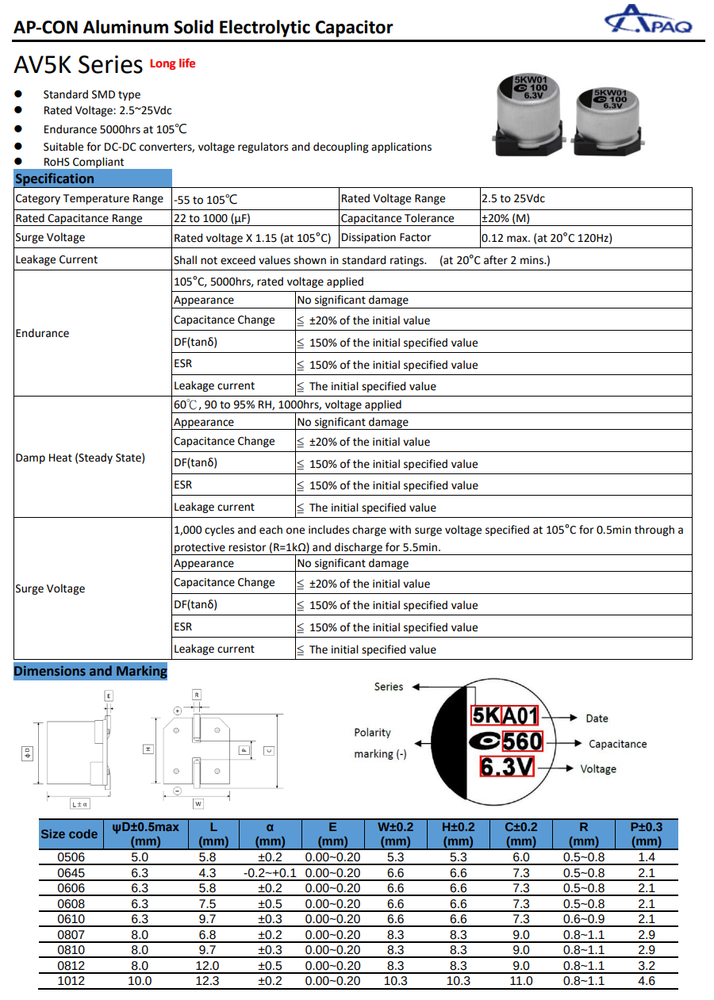 Store Seller Profile Feedbacks Contact Capacitors Aluminum Electrolytic Capacitors Aluminum Electrolytic Capactiors - SMD-SMT close 160AV5K271M0610BH APAQ 270uF 16V 6.3x10mm Polymer Aluminum Capacitor SMD 5000h 105C Ready to Ship Ask a Question 30-Day Return Description Specifications Shipping & Return Policy Disclaimer Pack of 25PCS - 160AV5K271M0610BH APAQ 270uF 16V 6.3x10mm Polymer Aluminum Capacitor SMD 5000h 105C Specification Capacitance Tolerance ±20% Type AP-CON(SMD) Application Long Life RC-1 (mA) 3500@105°C Temperature Range (°C) -55 to 105 Leakage Current (LC, µA) 864 Endurance (h) 5000 Dissipation Factor (DF, δ) 0.12 Rated Voltage (Vdc) 16 Capacitance (µF) 270 Dimensions (L×D/W×H, mm) 6.3×9.7 Shipping Policy Our go-to options for small to medium items are USPS Ground Advantage and USPS Priority Mail, known for their reliable tracking and peace of mind. Smaller items might qualify for USPS First Class Mail. Contact us to discuss this option before purchasing. Note: This method is less recommended due to the potential for delays. Return Policy We offer a 30-day return policy, no questions asked. If you choose to provide a reason for the return, it will assist us in improving and fix the issue. Packaging Our items are packaged according to their needs—some in ESD bags with pins secured in protective sponge, others in foam-enclosed boxes. For larger quantities, options include broken tubes for transistors or cartons. We welcome your suggestions for packaging preferences. Sofitrek Product Disclaimer Nature of Goods: All products offered by Sofitrek are surplus items. These products may originate from older batches, series, or have earlier date codes compared to those currently provided by the original manufacturers or their authorized dealers. Non-Affiliation: Sofitrek operates independently and is not an authorized distributor, nor is it affiliated or associated with the manufacturers of the products sold. Consequently, Sofitrek does not represent the manufacturers of these products in any capacity. Exclusion of Manufacturer's Warranty: Since Sofitrek is not an authorized distributor, the original manufacturer's warranties are explicitly not applicable to the products sold. This includes any implied warranties of merchantability or fitness for a particular purpose. Firmware and Software: Some products may include pre-installed firmware or software. However, Sofitrek does not guarantee the presence, compatibility, or the revision level of such firmware or software as suitable for your specific application. Furthermore, Sofitrek expressly disclaims any representation regarding your right or ability to download, obtain, or install any firmware or software for the products from any source, including the original manufacturers or their distributors. Limitation of Liability: Sofitrek shall not be held liable for any form of damages—direct, indirect, incidental, consequential, or otherwise—arising from the use, misuse, or inability to use any product sold. This includes, but is not limited to, damages for loss of profits, goodwill, use, data, or other intangible losses. The buyer assumes all responsibility for the safe and lawful use of the product and agrees to indemnify and hold harmless Sofitrek against any claims, liabilities, or expenses related to the product's use. Compliance and Responsibility: The buyer is solely responsible for adhering to all terms of any End-User License Agreement or similar documentation related to the products, particularly concerning the obtaining, installation, and use of firmware or software. Severability: If any provision of this disclaimer is found to be invalid or unenforceable, the remaining provisions shall continue to be in full force and effect. By purchasing from Sofitrek, the buyer acknowledges having read, understood, and agreed to this disclaimer in its entirety. Links eBay Shop Feedbacks Contact Us © Sofitrek