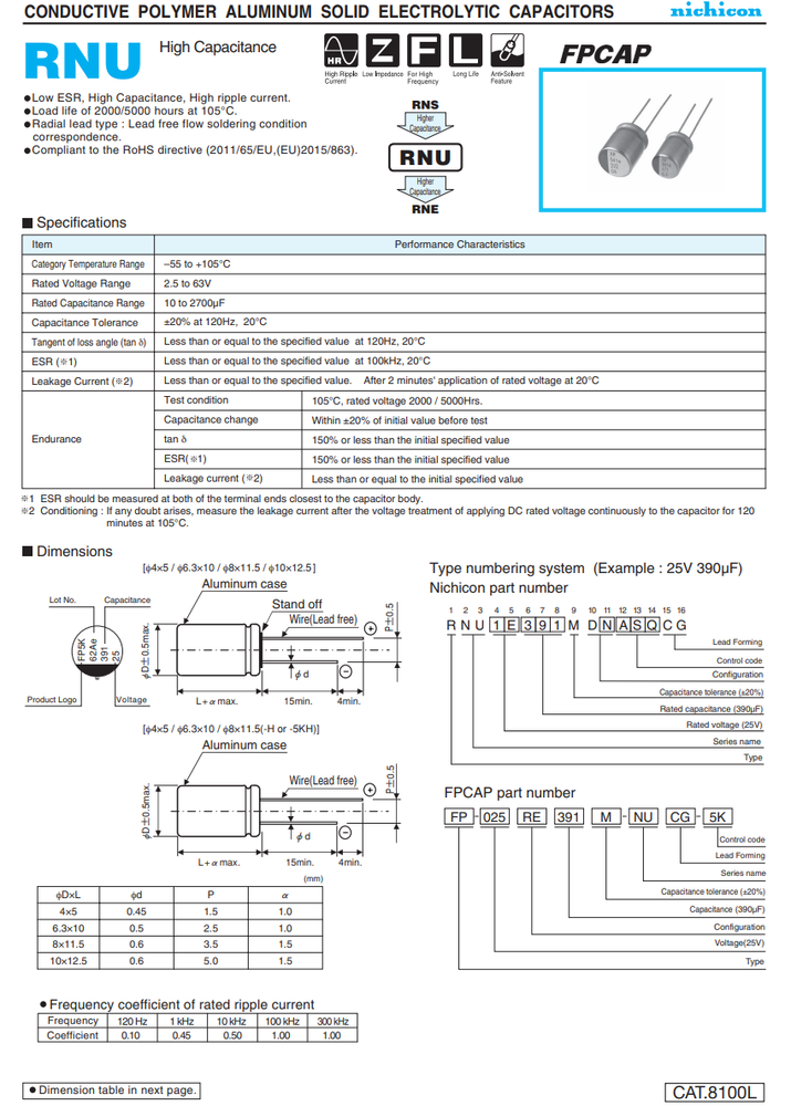 Store Seller Profile Feedbacks Contact Capacitors Polymer Capacitors Solid Capacitors close FP-016RE471M-NUR-5K Nichicon 470uF 16V 10x12.5mm Polymer Aluminum Radial Capacitor 5000h 105C LS:5mm Ready to Ship Ask a Question 30-Day Return Description Specifications Shipping & Return Policy Disclaimer Pack of 25PCS - FP-016RE471M-NUR-5K Nichicon 470uF 16V 10x12.5mm Polymer Aluminum Radial Capacitor 5000h 105C LS:5mm Specification Capacitance 470 µF Rated (DC) Voltage (URdc) 16 V Ripple Current 610 mA Positive Tolerance 20 % ESR 10 mΩ Polarity POLARIZED Negative Tolerance 20 % Mounting Feature THROUGH HOLE MOUNT Dielectric Material ALUMINUM (SOLID POLYMER) Capacitor Type ALUMINUM ELECTROLYTIC CAPACITOR Additional Feature ESR IS MEASURED AT 100 KHZ Leakage Current 1.504 mA Tan Delta 0.08 Operating Temperature-Max 105 °C Operating Temperature-Min -55 °C Number of Terminals 2 Terminal Pitch 5 mm Terminal Shape WIRE Diameter 10 mm Length 12.5 mm Manufacturer NICHICON CORP Shipping Policy Our go-to options for small to medium items are USPS Ground Advantage and USPS Priority Mail, known for their reliable tracking and peace of mind. Smaller items might qualify for USPS First Class Mail. Contact us to discuss this option before purchasing. Note: This method is less recommended due to the potential for delays. Return Policy We offer a 30-day return policy, no questions asked. If you choose to provide a reason for the return, it will assist us in improving and fix the issue. Packaging Our items are packaged according to their needs—some in ESD bags with pins secured in protective sponge, others in foam-enclosed boxes. For larger quantities, options include broken tubes for transistors or cartons. We welcome your suggestions for packaging preferences. Sofitrek Product Disclaimer Nature of Goods: All products offered by Sofitrek are surplus items. These products may originate from older batches, series, or have earlier date codes compared to those currently provided by the original manufacturers or their authorized dealers. Non-Affiliation: Sofitrek operates independently and is not an authorized distributor, nor is it affiliated or associated with the manufacturers of the products sold. Consequently, Sofitrek does not represent the manufacturers of these products in any capacity. Exclusion of Manufacturer's Warranty: Since Sofitrek is not an authorized distributor, the original manufacturer's warranties are explicitly not applicable to the products sold. This includes any implied warranties of merchantability or fitness for a particular purpose. Firmware and Software: Some products may include pre-installed firmware or software. However, Sofitrek does not guarantee the presence, compatibility, or the revision level of such firmware or software as suitable for your specific application. Furthermore, Sofitrek expressly disclaims any representation regarding your right or ability to download, obtain, or install any firmware or software for the products from any source, including the original manufacturers or their distributors. Limitation of Liability: Sofitrek shall not be held liable for any form of damages—direct, indirect, incidental, consequential, or otherwise—arising from the use, misuse, or inability to use any product sold. This includes, but is not limited to, damages for loss of profits, goodwill, use, data, or other intangible losses. The buyer assumes all responsibility for the safe and lawful use of the product and agrees to indemnify and hold harmless Sofitrek against any claims, liabilities, or expenses related to the product's use. Compliance and Responsibility: The buyer is solely responsible for adhering to all terms of any End-User License Agreement or similar documentation related to the products, particularly concerning the obtaining, installation, and use of firmware or software. Severability: If any provision of this disclaimer is found to be invalid or unenforceable, the remaining provisions shall continue to be in full force and effect. By purchasing from Sofitrek, the buyer acknowledges having read, understood, and agreed to this disclaimer in its entirety. Links eBay Shop Feedbacks Contact Us © Sofitrek
