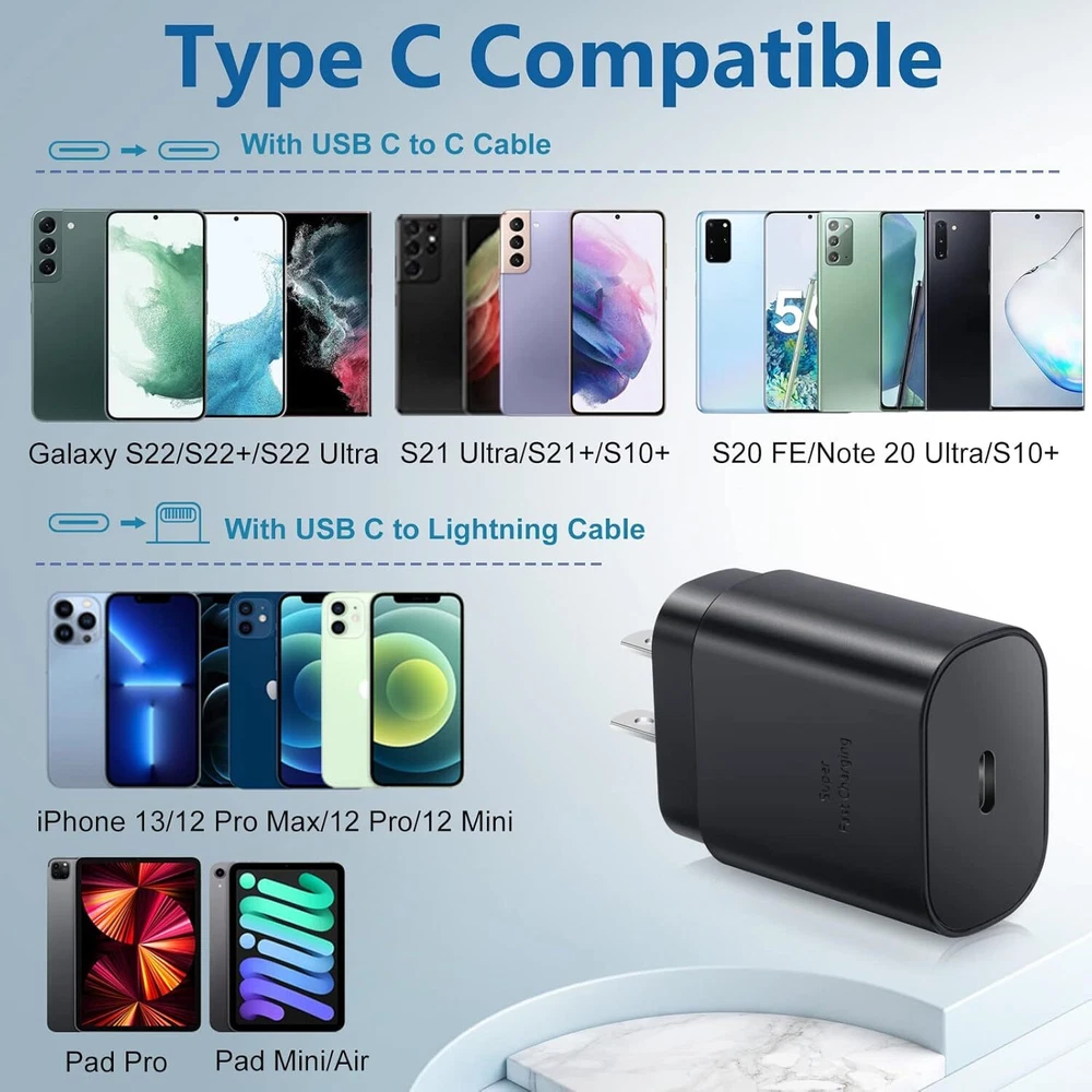 Features: 100% Brand new and high quality Multiple protection, over-charge, voltage, temperature and shore circuit protection, safer Widely compatible with most digital devices, universal High-Speed Charging: Rapidly charge your devices with 25W Power Delivery. Compact & Portable: Extremely compact form factor and foldable plug ensure maximum portability wherever you go. Handy for home, office, and vacations. Safe & Reliable: Built-in safeguards protect your devices against excessive current, overheating, and overcharging. World Wide Voltage: Compatible With 100-240V, Suitable for travel. Specifications: Material: High quality ABS environmental protection material Input: 100V-240V 50/60HZ Output: 5V/3A; 9V/2.22A; 12V/1.5A Power: 25W Max. Work Temperature: 0~50℃ Working Efficiency: 85% Port Type: Type-C Compatible Devices: For Samsung Galaxy S22/S22+/S22 Ultra For Samsung Galaxy S21/S21+/S21 Ultra For Samsung Galaxy S20/S20+/S20 Ultra For Samsung Galaxy Note 10/10+ 5G/20/20 Ultra For Samsung Galaxy Note 20/20+/20 Ultra For Samsung Galaxy Note 9/9+/8/8+ For Samsung Galaxy S10/S10+/S9/S9+/S8/S8+ For Samsung Series Phone For other Phone Buyer Note: If you are satisfied with our service, we appreciate you leaving us a positive feedback and 5 star rating review! Your opinion is important to the success of our business. If you are not satisfied with the product or have not received the product for more than 35 days, please contact us to resolve, we will do our best to solve. We are sure to come up with a satisfactory solution. Please contact us first before leaving cold feedback or good feedback of 1-3 stars and opening the case. We'll do our best to solve your problem. Because we believe that everything can be solved through communication. Thank you very much!
