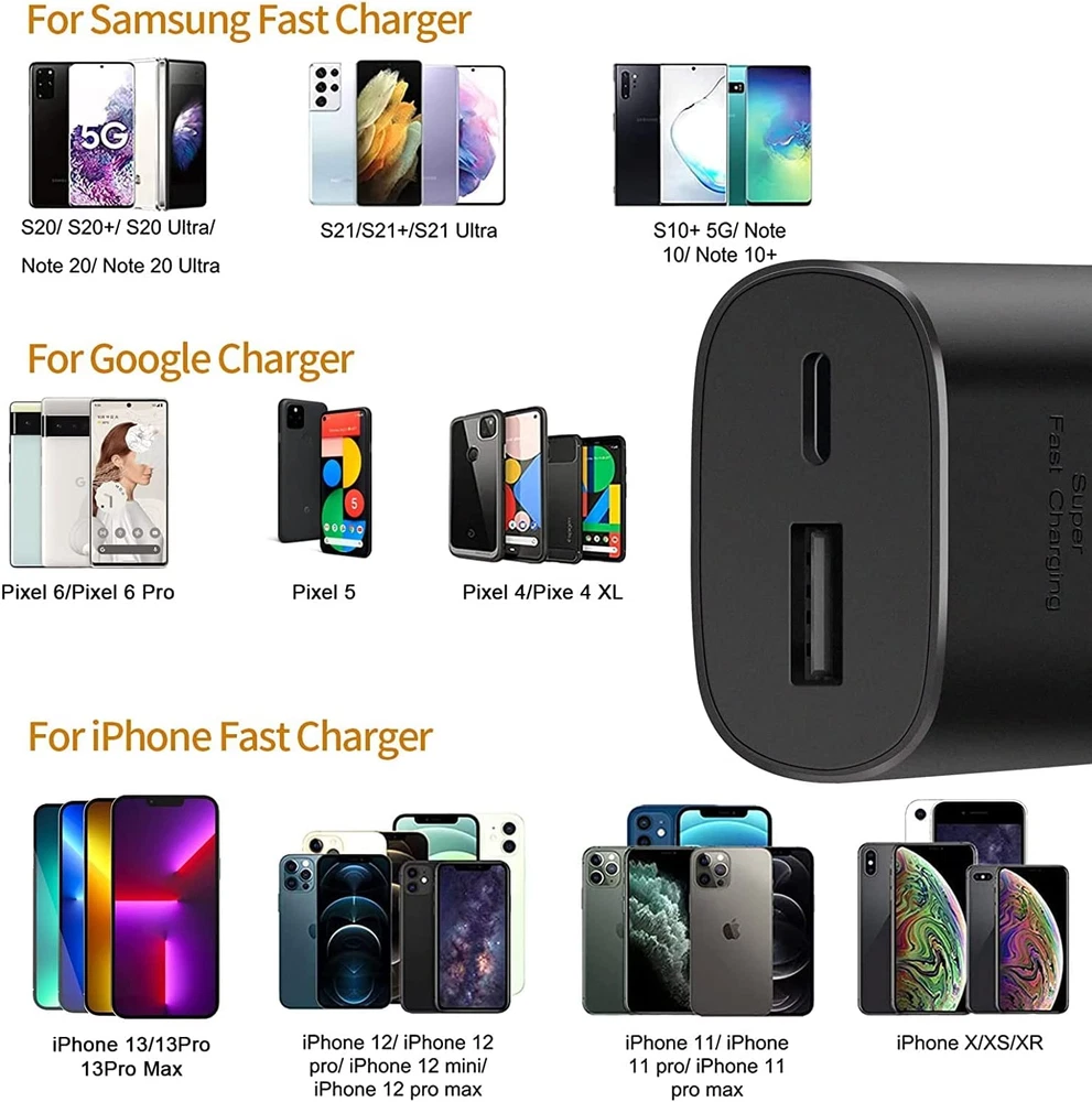 Feature : 1.This is a USB-C to USB-C cable NOT USB-C to USB-A cable, so you need a USB C wall charger to charge your device. 2. For ensure the charging speed of your device, please use the original USB C port wall charger, or other high quality charger which can support QC 2.0/3.0 and USB PD fast charging. 3. It is a charging and data cable not Thunderbolt 3 cable so it can not output video. 4. Supports Qualcomm Quick Charge and USB Power Delivery Charge. Also compatible with Thunderbolt 3 port. 5. These cables are designed according to the USB 2.0 specification. The actual transmission speed is within 480 Mbps( 60 MBps) , so it cannot reach the speed of usb 3.0 (5 Gbps). 25W Fast Wall Charger: [ 25W Rapid Charging ] PD3.0 Power Delivery Technology guarantees an optimized and fast safe charging experience (25W) for all Samsung Galaxy devices. [ Broad Compatibility ] The USB C charger charges majority of USB Type-C and PD devices and non-PD Devices at full speed. Provides up 25W fast charge. [ Dependable Protection ] With the intelligent chip inside, it matches the current as your device's need automatically. Over-current, over-voltage and short-circuit protection effectively protect your devices from damage and ensure the safer charging overnight. [ Slim & Compact ] Small, lightweight and convenient store in your bag and carry. Connectors: Type C to Type C Cable length :3FT Color: Black Compatible With: For Samsung Galaxy S10/Note 10/S20 / Note 20 For MacBook 2016/2017 For Macbook Air 2018 For MacBook Pro 13.3'' For iPad Pro 11'' (2018)/12.9'' (2018) For Google Pixel 2/2XL/3/3XL For Nexus 6P For Huawei P20/P30/Mate 20/Matebook
